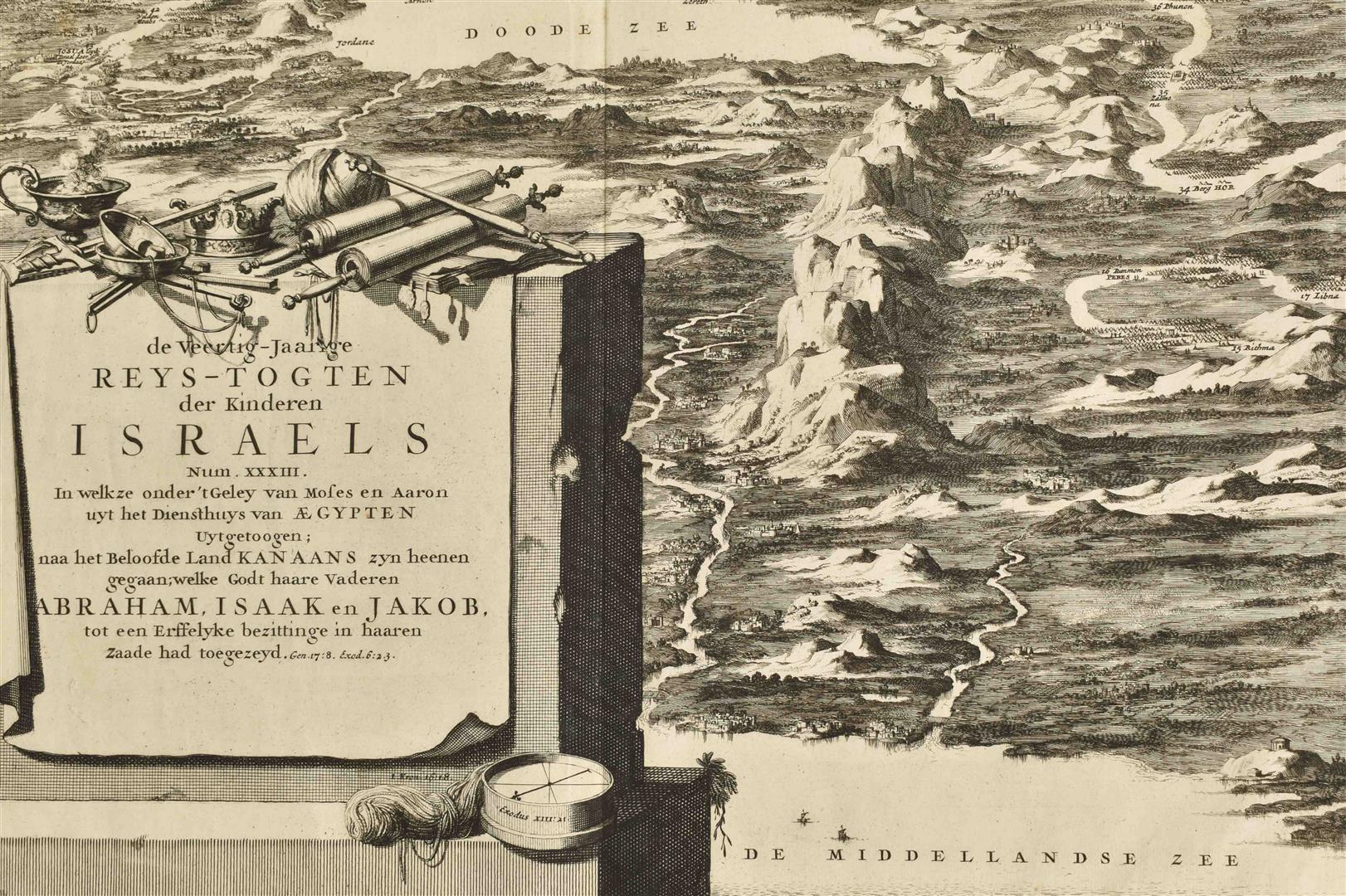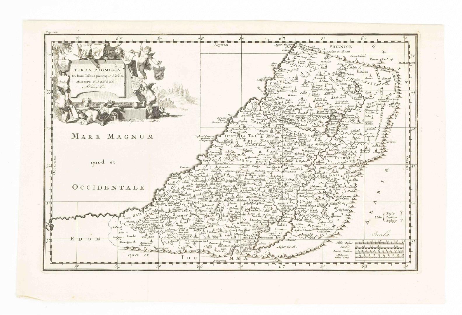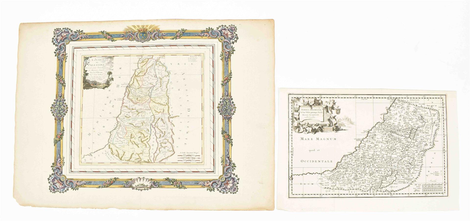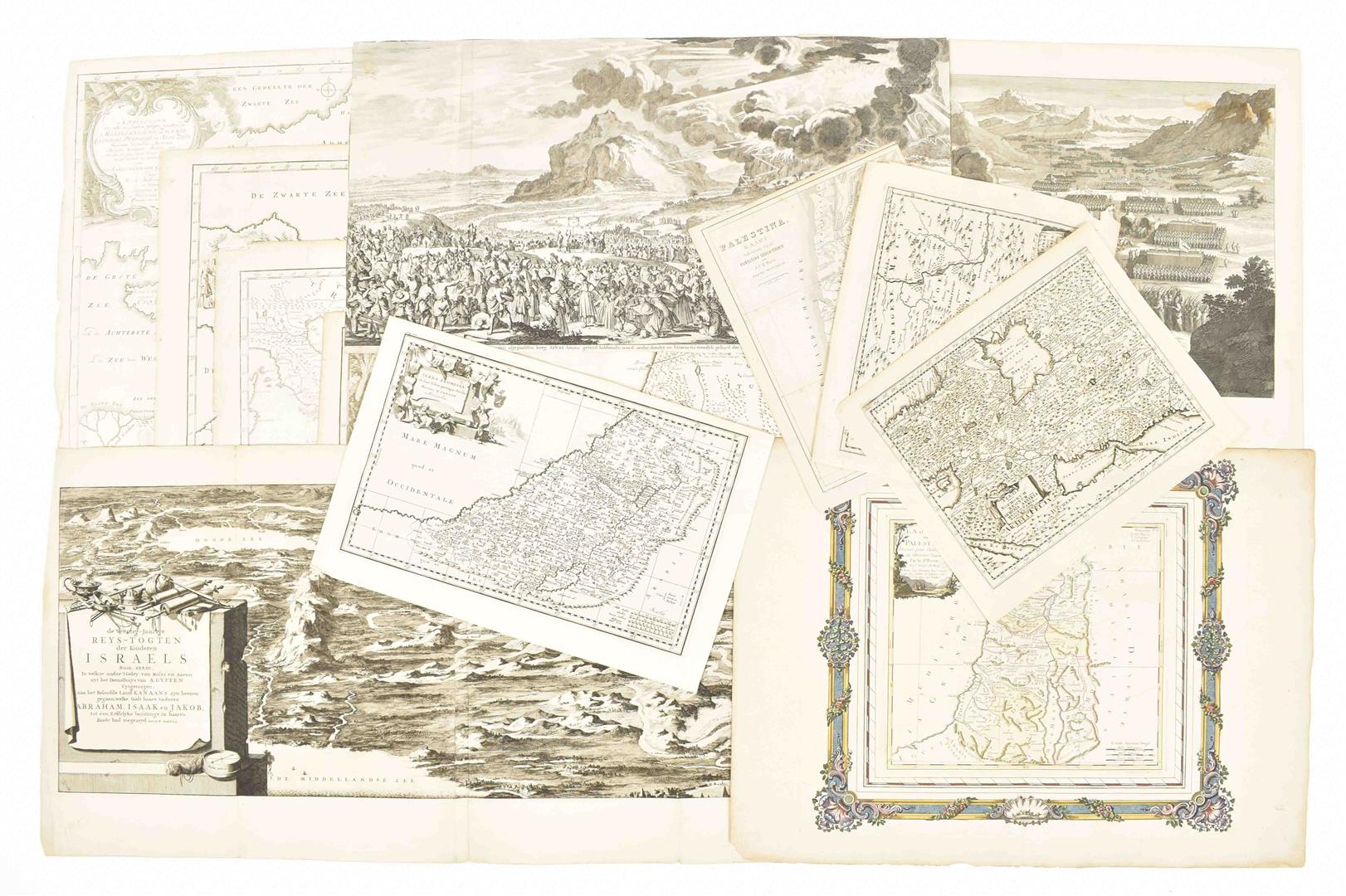 Handcol. engr. map after Brion, 23 x 25.5 cm, in separately printed handcol. ornamental borders, total size 35 x 40 cm. Paris, Desnos, ca. 1770. (2) Terra Promissa in sua tribus partesque divisa. Engr. map by N. Sanson w. cartouche by J. Goeree, 21 x 33 cm. Amst. (?), ca. 1700. -and 7 other maps, incl. 4 bible maps publ. in Gorinchem by Nicolaas Goetzee, dated 1748-50. Added: 4 other engr. prints concerning Israel, incl. a large bird's-eye profile depicting the "Veertig-jaarige reys-togten der kinderen Israels", 75.5 x 29 cm.
