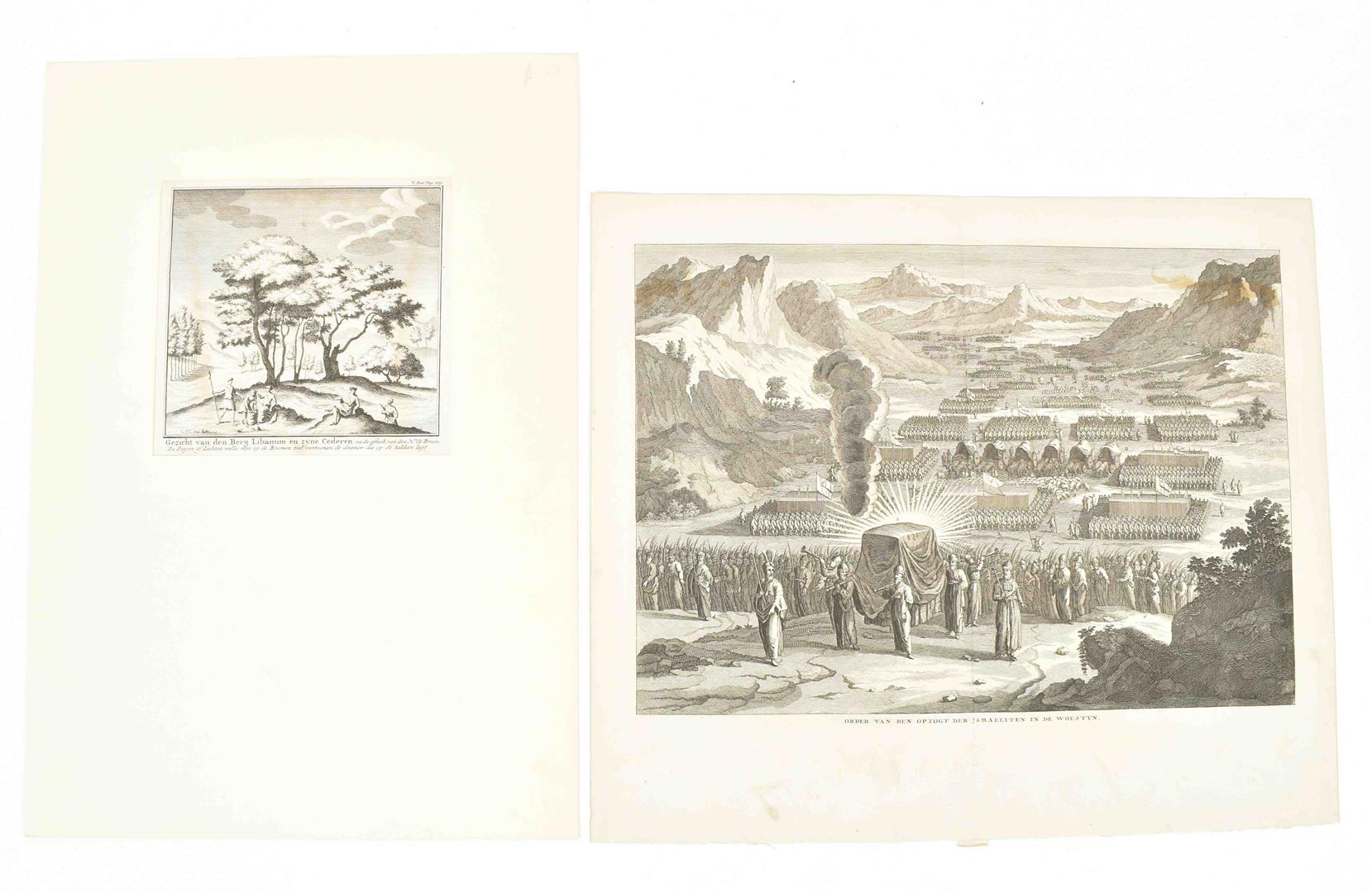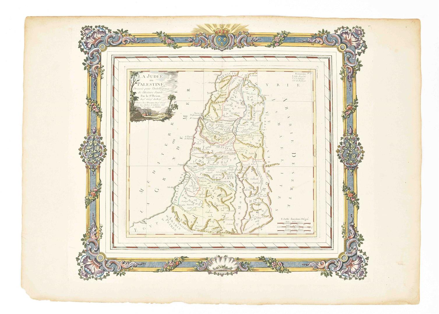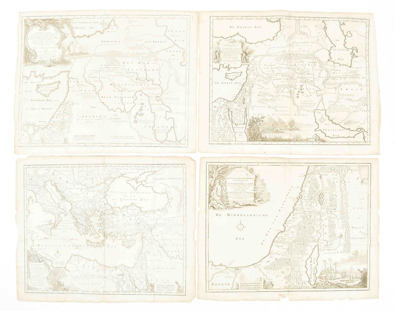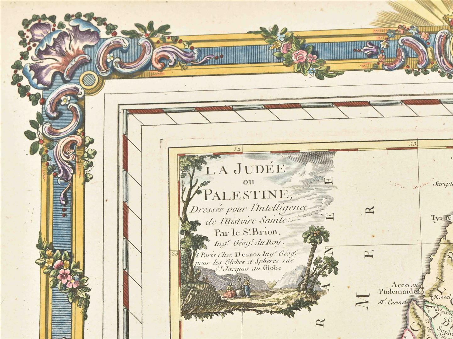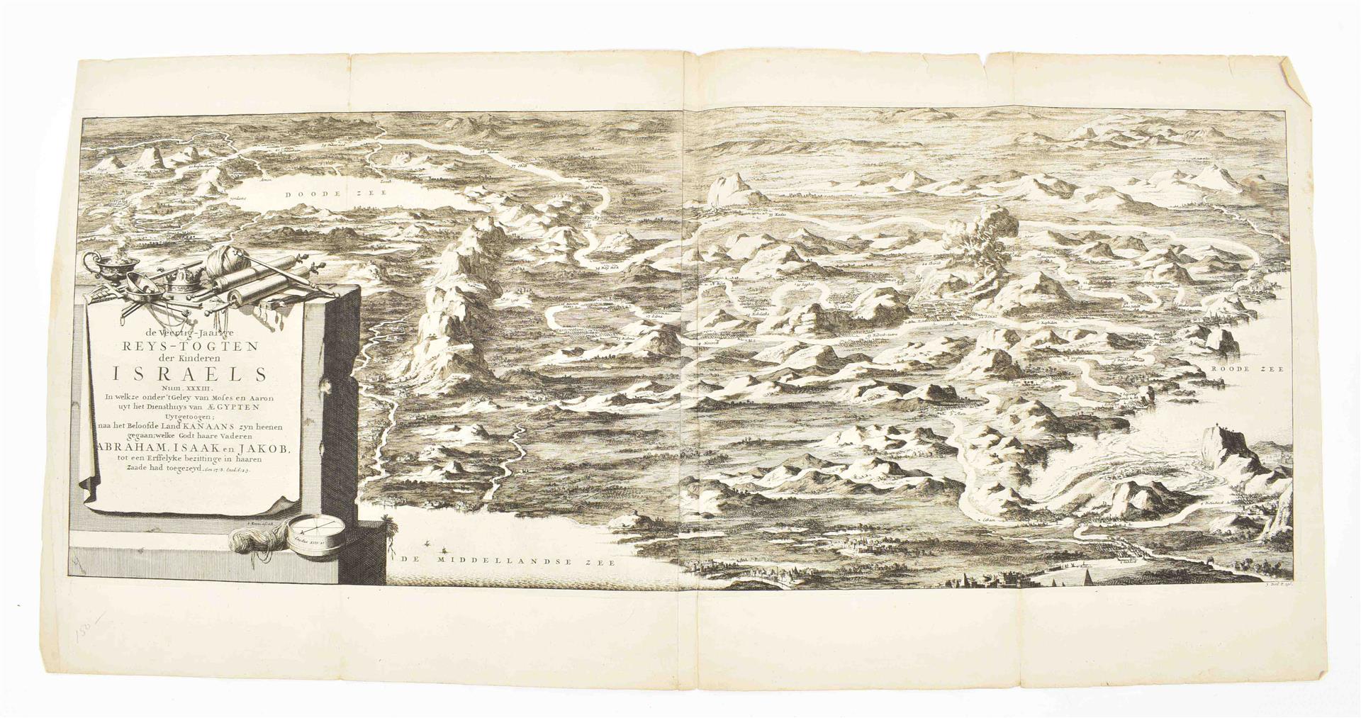 Handcol. engr. map after Brion, 23 x 25.5 cm, in separately printed handcol. ornamental borders, total size 35 x 40 cm. Paris, Desnos, ca. 1770. (2) Terra Promissa in sua tribus partesque divisa. Engr. map by N. Sanson w. cartouche by J. Goeree, 21 x 33 cm. Amst. (?), ca. 1700. -and 7 other maps, incl. 4 bible maps publ. in Gorinchem by Nicolaas Goetzee, dated 1748-50. Added: 4 other engr. prints concerning Israel, incl. a large bird's-eye profile depicting the "Veertig-jaarige reys-togten der kinderen Israels", 75.5 x 29 cm.