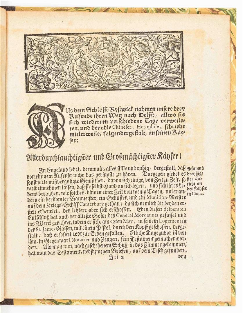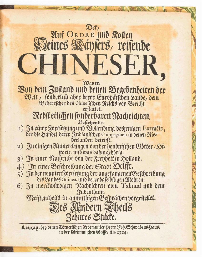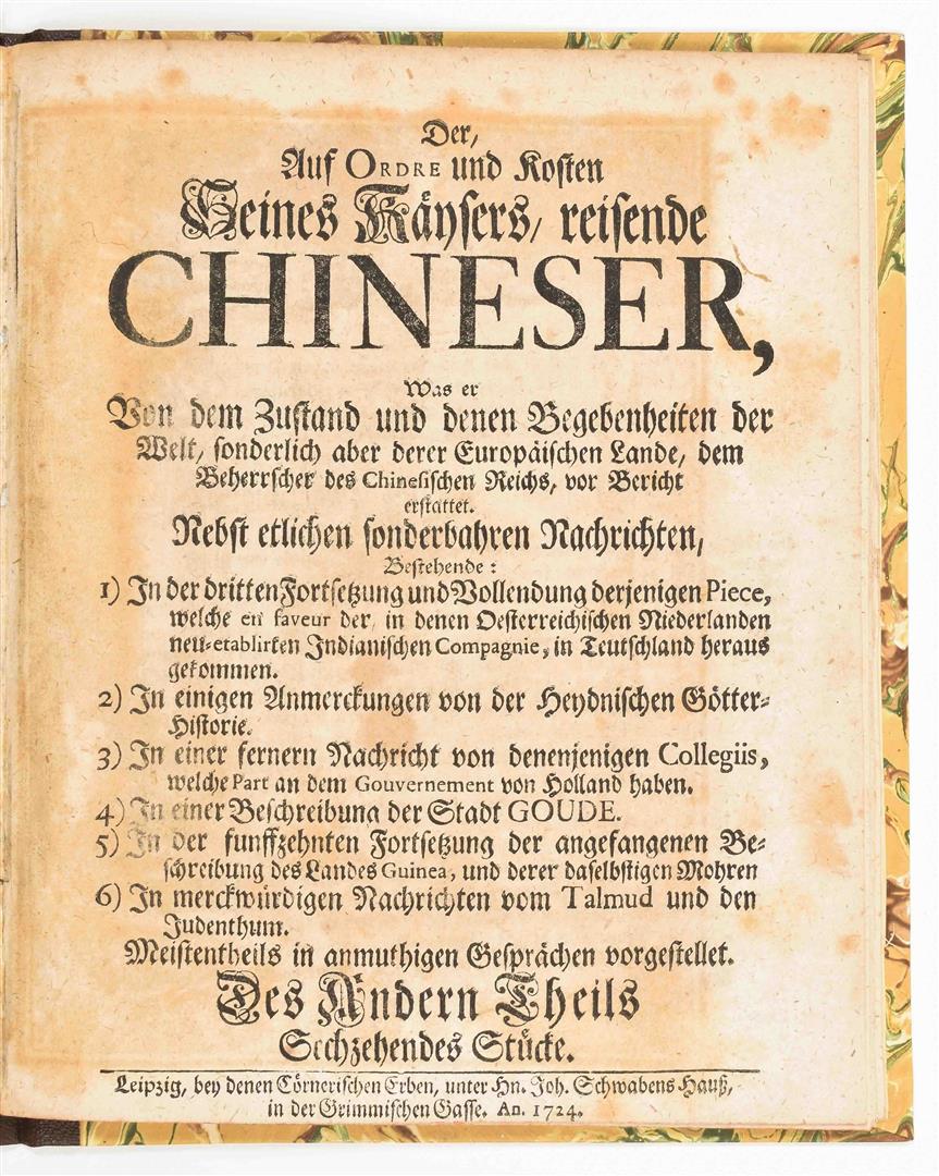 was er von dem Zustande und denen Begebenheiten der Welt, sonderlich aber derer Europaeischen Lande, dem Beherrscher des Chinesischen Reichs, vor Bericht erstattet (...) Des andern Theils Zehntes Stuek. Leipzig, Coernerischen Erben, Joh. Schwaben, 1724. 2 chapters from this work, p. 385-426 and 625-666. 1 w. copper engr. view of Delft, the other w. copper engr. view of Gouda. Later unif. half faux-leather w. marbled paper boards. Sm. 4to.
