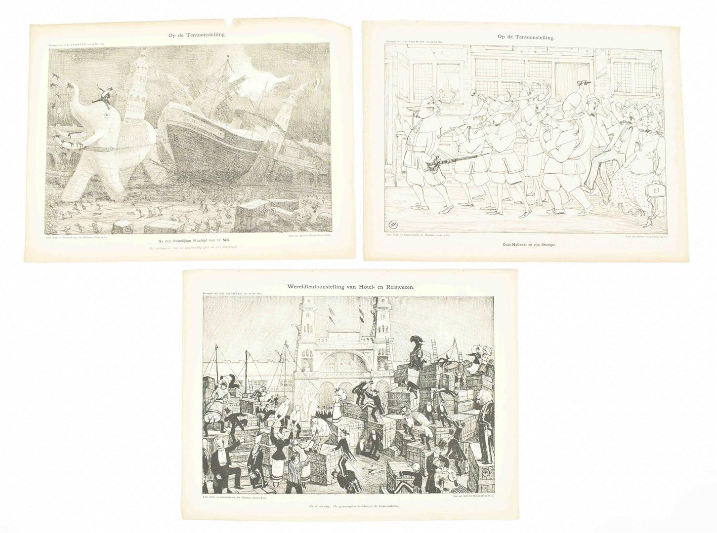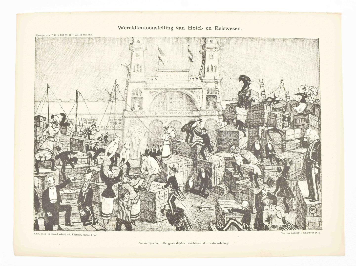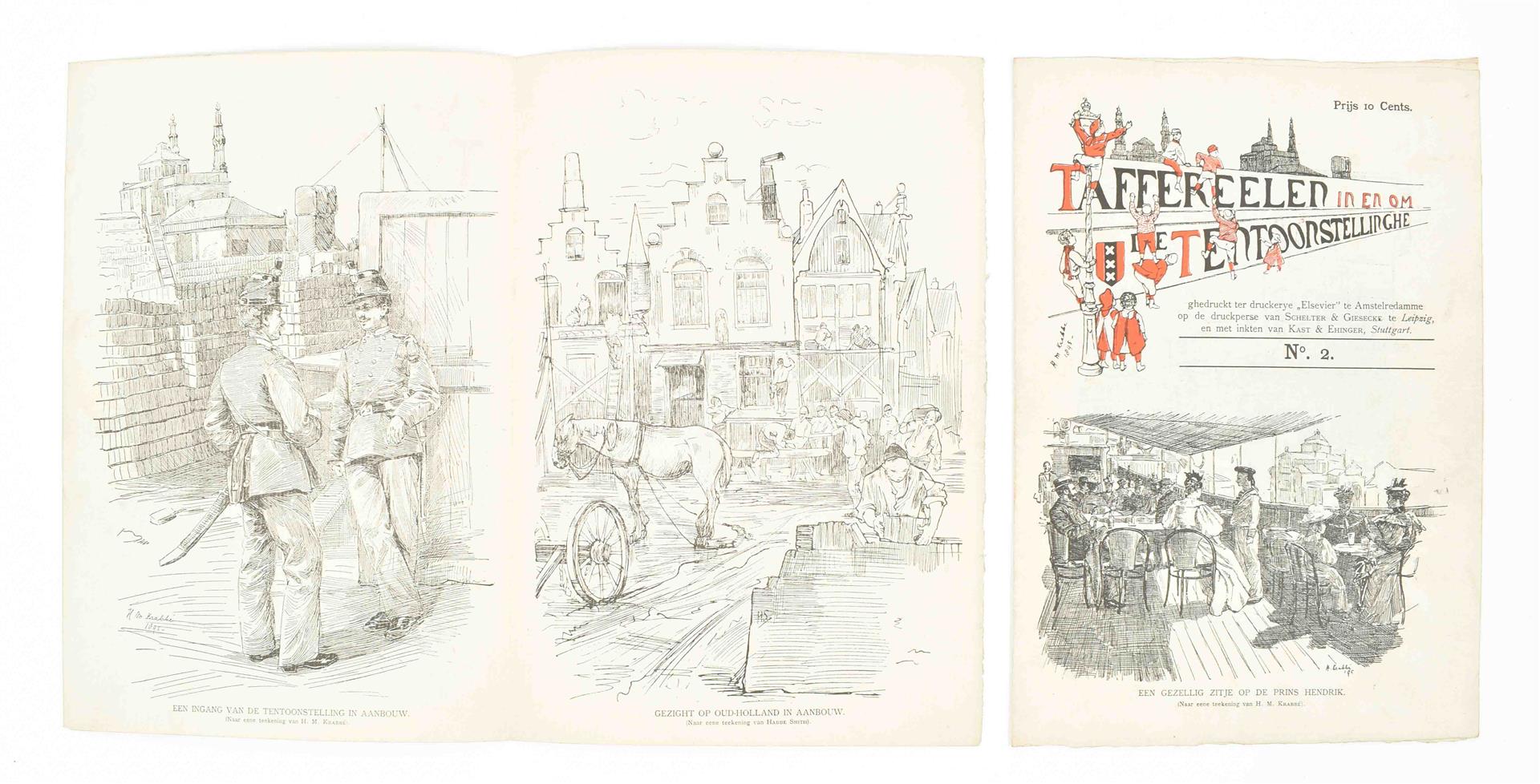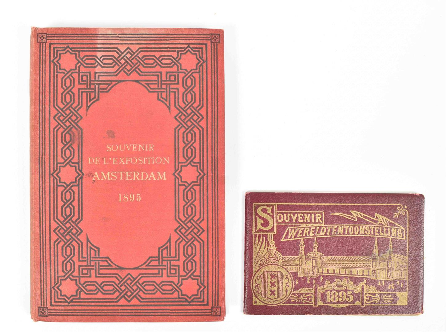 (1) Souvenir de l'exposition Amsterdam 1895. 12 photogr. views, each 16 x 10 cm and w. address of Guy de Coral & Co, Amst. Fold. in leporello in the orig. gilt lettered dec. cl. (2-3) Taffereelen in en om de tentoonstellinghe. No. 1-2. 2 bifolia, "gedruckt ter drukkerij "Elsevier" te Amstelredamme op de Tegeldruckperse van Scheltens & Gieseke te Leipzig", (1895). Printed on handmade paper, each w. (humorous) ills. by H.M. Krabbé and J. van Oort. 4to. Very rare occasional periodical, only 1 copy in NCC. (3) Exposition Universelle de l'Hôtel et du Voyageur à Amsterdam Mai - Novembre 1895. Amst., Electrische Drukkerij, (1895). 63 p. W. large fold. plan, views and ills. Orig. (sl. worn) pictorial wr. after Joh. Braakensiek. (4) Souvenir Wereldtentoonstelling 1895. 11 lithogr. ills., each 6 x 10 cm, fold. in leporello in orig. gilt supple boards. Obl. 16mo. Inside w. the address of Herms. OldenKott & Zoonen, Tabackfabrikanten. -and 4 others: a large photogr. by Guy de Coral & Co. and 3 lithogr. "Bijvoegsels van De Kroniek" by Antoon Molkenboer.