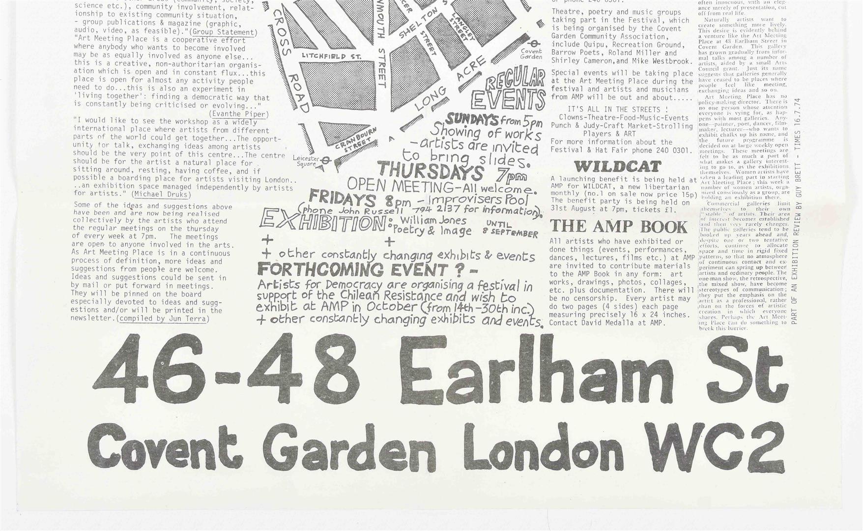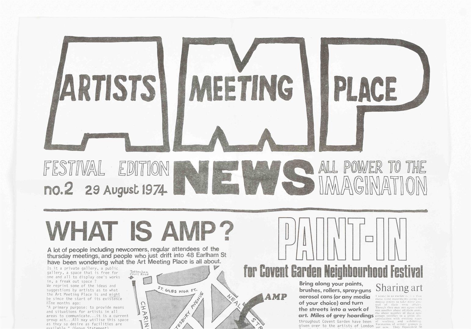 (2) Added is AMP News, Festival Edition No.2, 29 August 1974, London, 1974. 42 x 29.5 cm, folded in 8. It features information about the space and also mentions upcoming events in support of the Chilean Resistance, organized by Artists for Democracy, co-founded by Vicuna. (with David Medalla a.o). One of the events was an Arts Festival for Democracy in Chile at the Royal College of Art in London in 1974, coordinated by Cecilia Vicuna. (total 2)