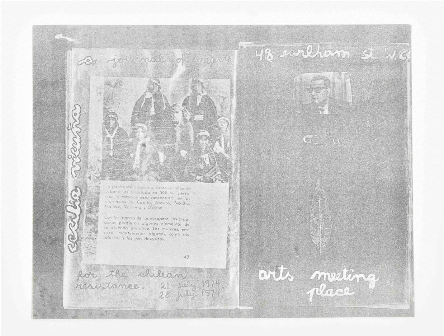 London, Artists Meeting Place (AMP), 1974. Announcement card for an exhibition at AMP, from 21 to 28 July 1974. Mimeo printed b/w on thick white stock, 12.5 x 16 cm. The exhibition formed the closure of a project Vicuna started in June 1973 as a protest to the military dictatorship in Chile. She decided to make one object every day in support of the Chilean revolutionary process. Four hundred objects, constructed from debris collected in the streets of London, were exhibited at AMP. The invitation card is extremely rare, no records found, but it is detected as part of the AMP installation, mounted on the wall. (See p.189 of the Witte de With publication on Cecilia Vicuna, the image is 5 mm but recognizable).
