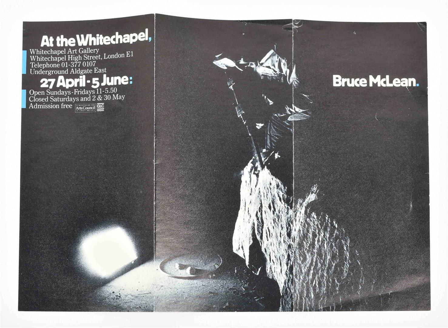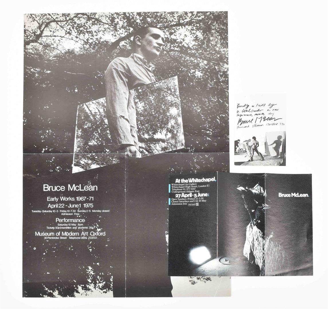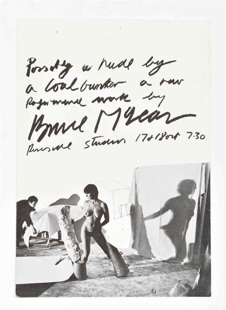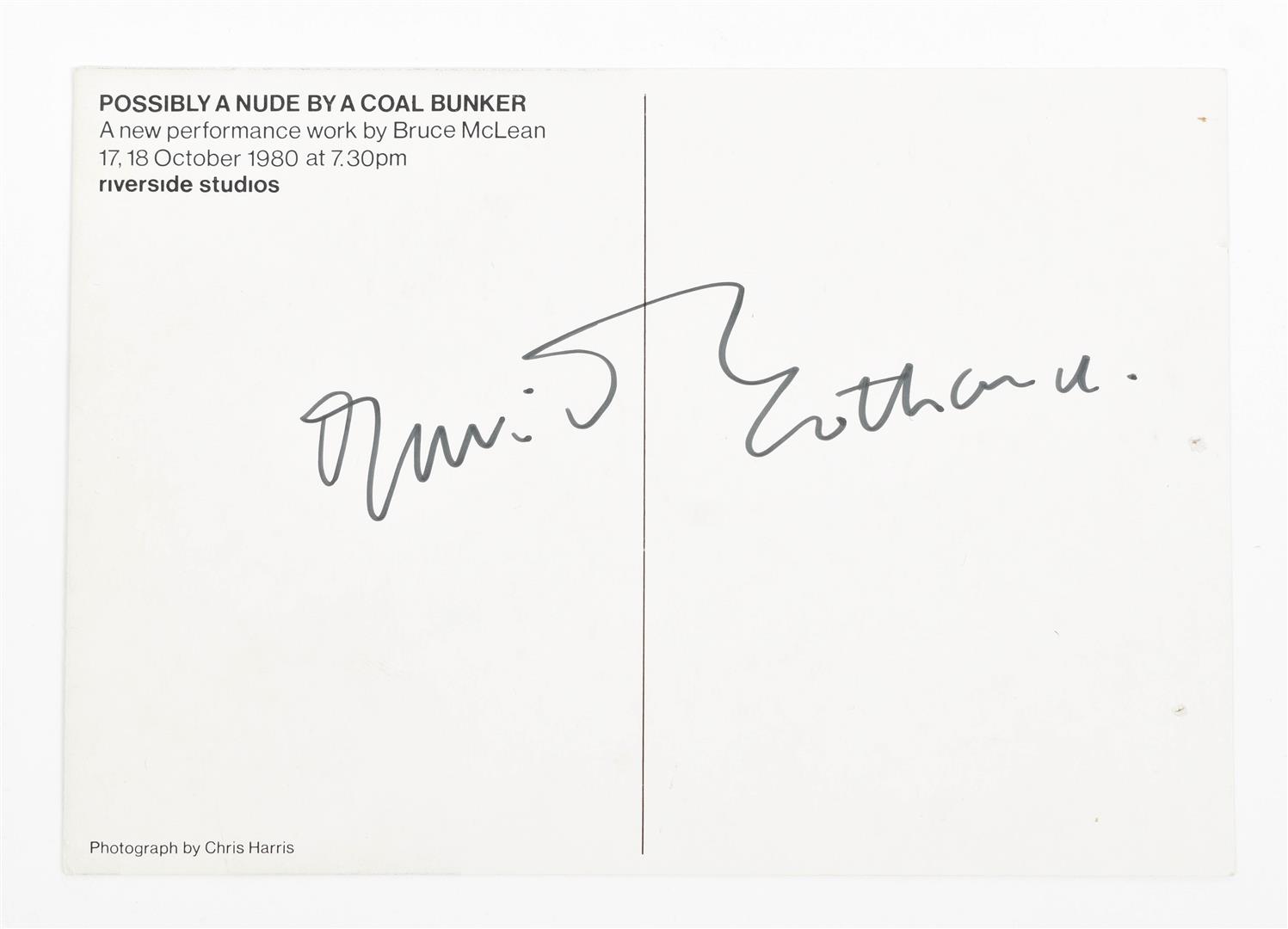 (2) Possibly a nude by a coal bunker, a new performance by Bruce McLean. Riverside Studios, Hammersmith 1980. Postcard, with pinholes. (3) Bruce McLean at the Whitechapel. Whitechapel Art Gallery London, 1983. Announcement flyer, folded as issued. (total 3)