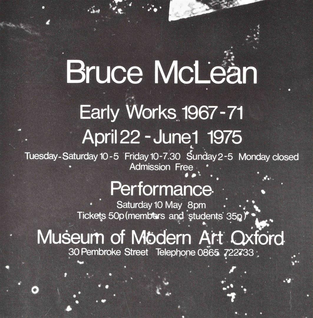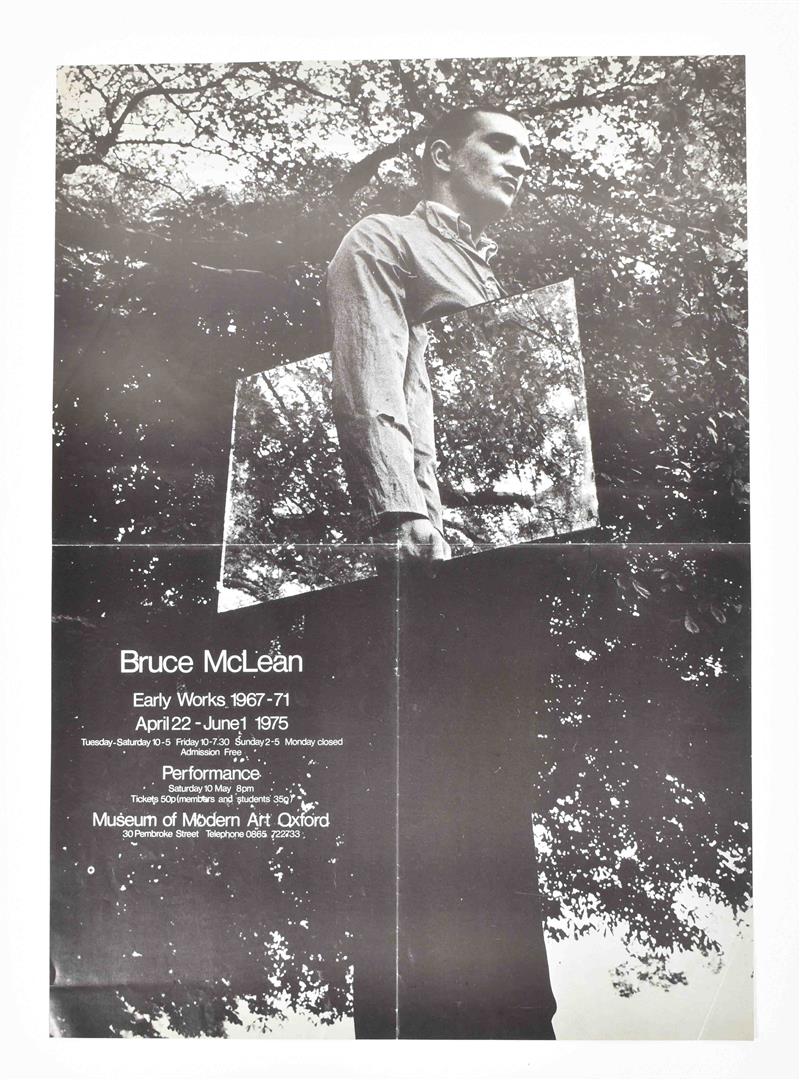 (1) Bruce McLean, Early Works. Museum of Modern Art Oxford, 1975. Poster, 59 x 42 cm. Folded twice. Minor dog-ear on lower right. Signature performance document. The artist himself stated 'The poster of an event records the event, and is sometimes more of the event than the event itself.'