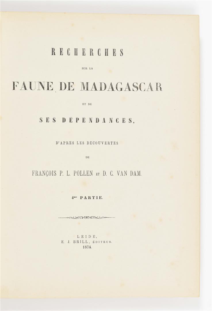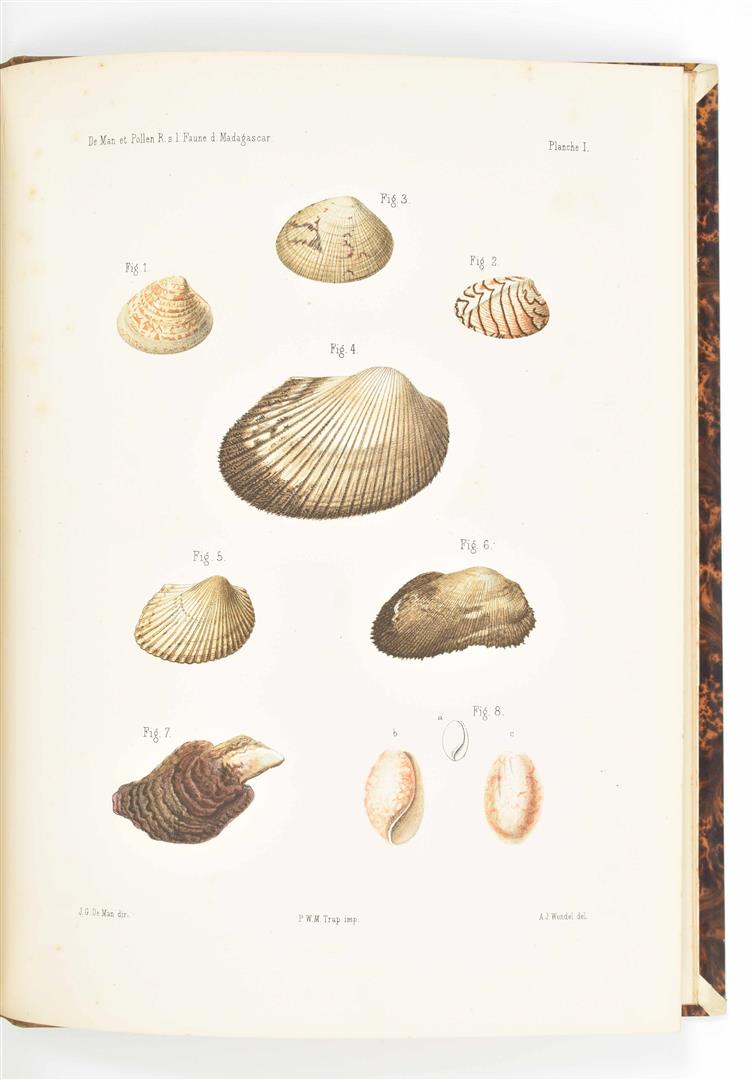 et de ses dépendances. 4me partie. Leyden, Brill, 1874. 3 parts: Poissons et pêches, 104,(2) p.; Les pêches à Madagascar et ses dépendances, 89 p., 1 full-p. col. lithogr. map, 21 full-p. col. lithogr. and 9 col. lithogr. from other parts of Recherches sur la faune de Madagascar; and J.G. de Man, Mollusques de Madagascar et de l'Ile de la Réunion, 42,(2) p., 6 full-p. col. lithogr. plates. Contemp. hcalf, gilt and ribbed spine w. mor letterpiece.