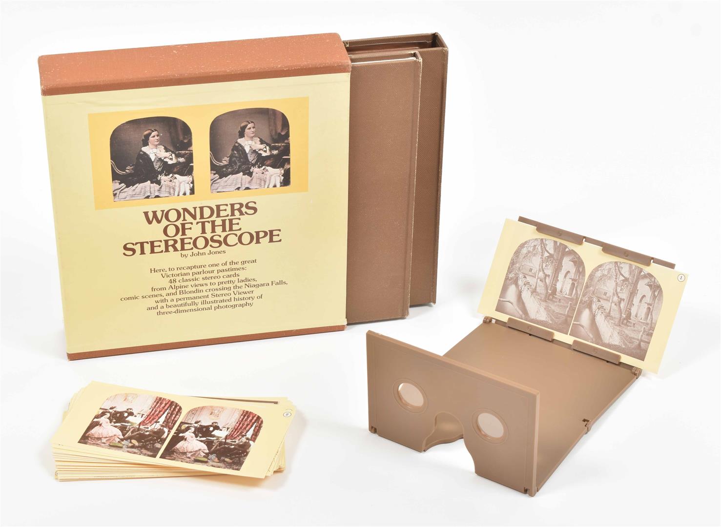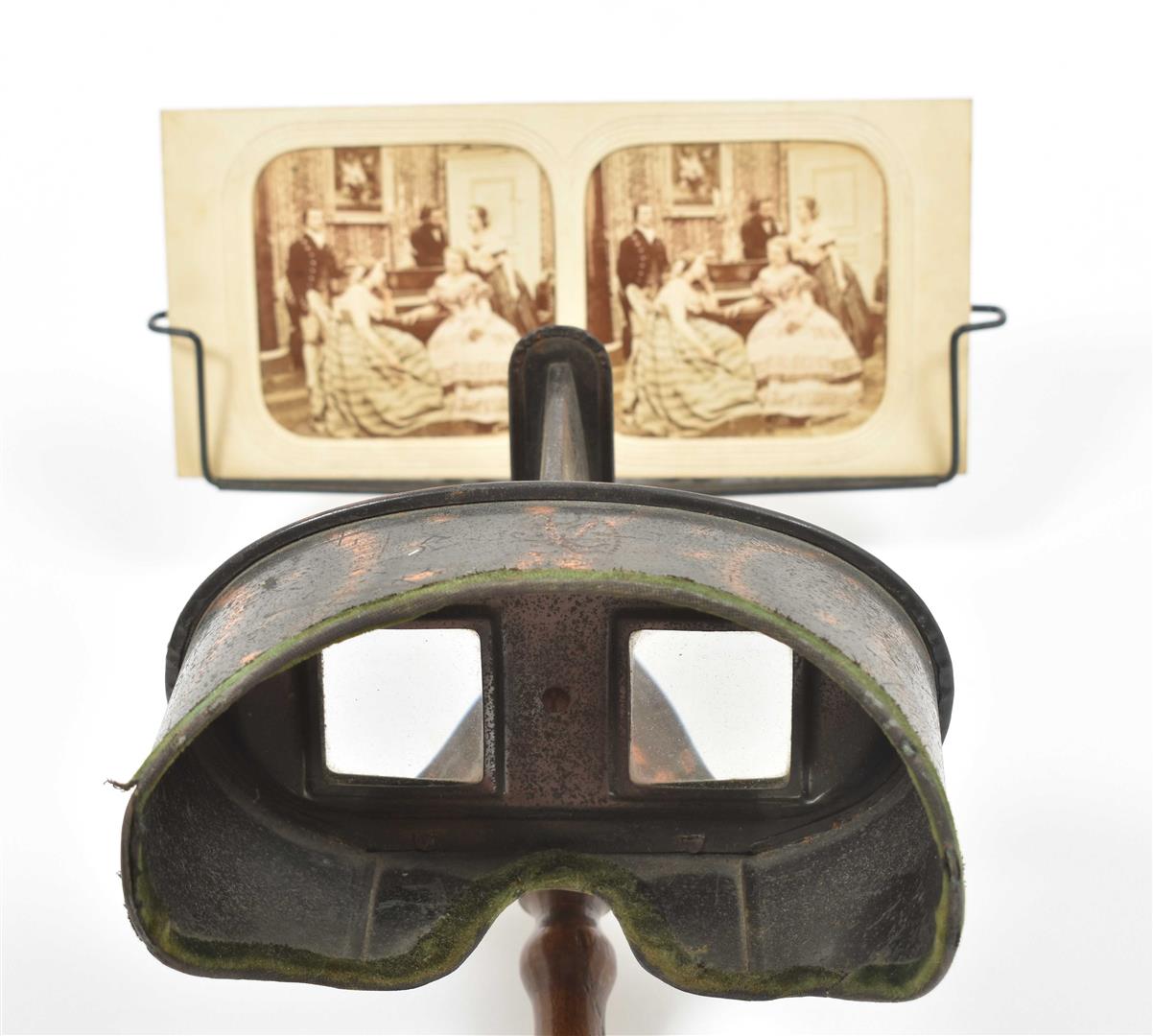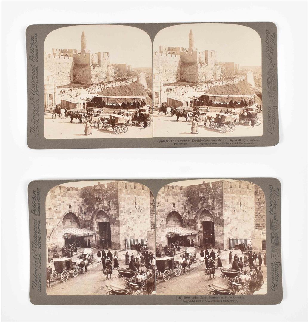 A Holmes-Bates type of stereoscope, the "Perfecscope", ca. late 19th cent., metal w. wooden handle. Stereograms also ca. late 19th cent. Incl. a.o.: a set of glass stereograms w. views of the countryside and country houses, and a series of stereograms of Jerusalem, ca. 1897. Added: John Jones. Wonders of the Stereoscope. London, Roxby Press, 1976. Book and 48 classic stereo cards.