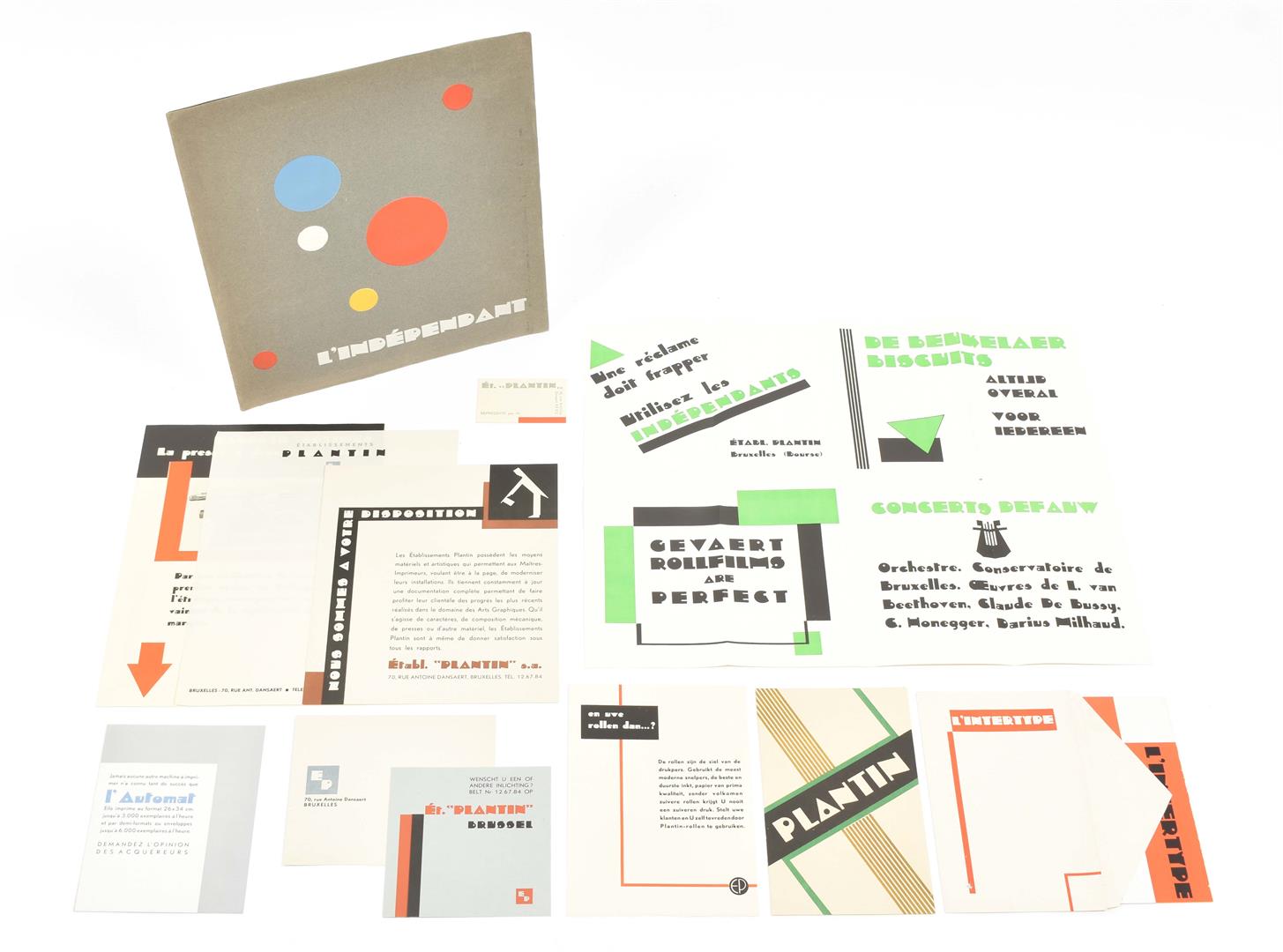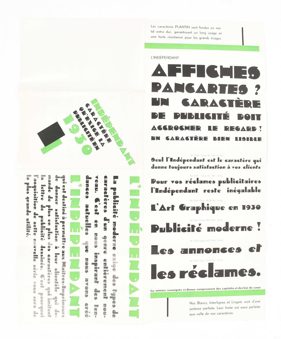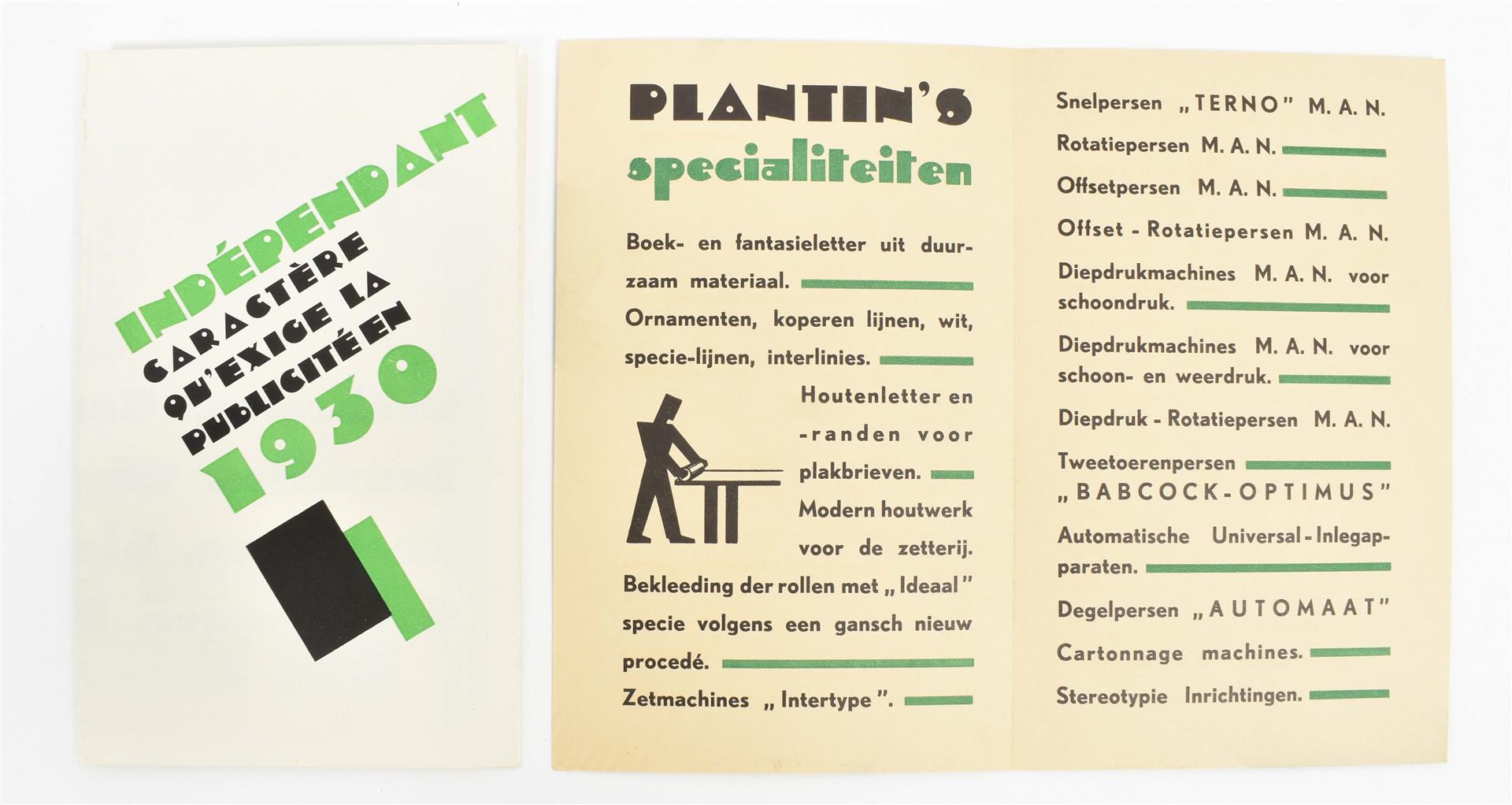 A few sm. imperfections, but overall a very good copy. Splendidly executed, very rare portfolio, advertising "notre caractère de publicité "L'Indépendant", a very distinctive lettertype. The choice of the name of the type is not by chance: the portfolio was publ. exactly 100 years after the Belgian Revolution. The portfolio contains a.o. a fold. flyer printed in green and black (dated 1930, unfold. 37 x 45 cm), a bifolium printed in blue, black and silver advertising "L'Automat" (a printing press), a bifolium printed in red and black advertising "L'Intertype" (another printing press, the bifolium in the orig. envelope), a bifolium printed in green and black listing "Plantin's specialiteiten" and a leaf printed in black and brown, "Nous sommes à votre disposition".
