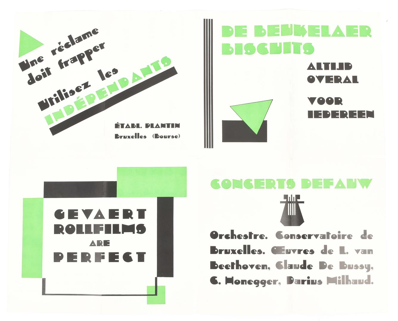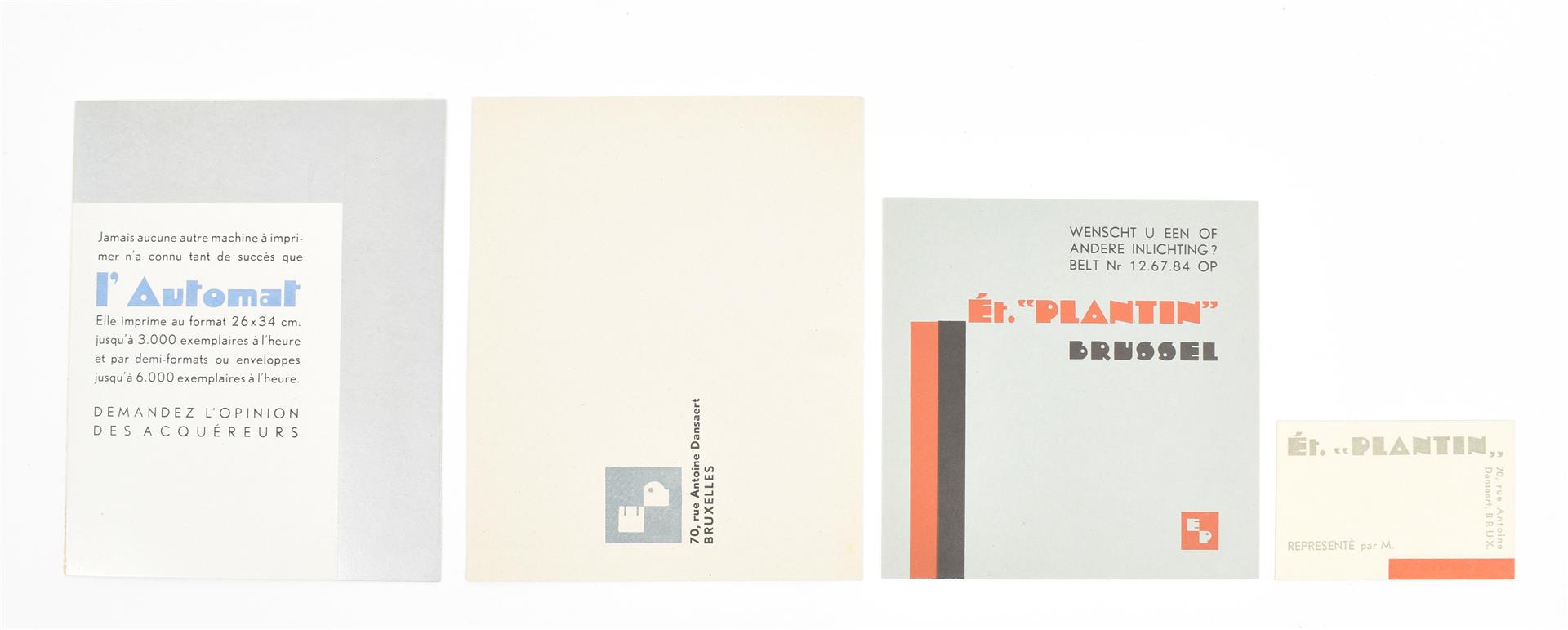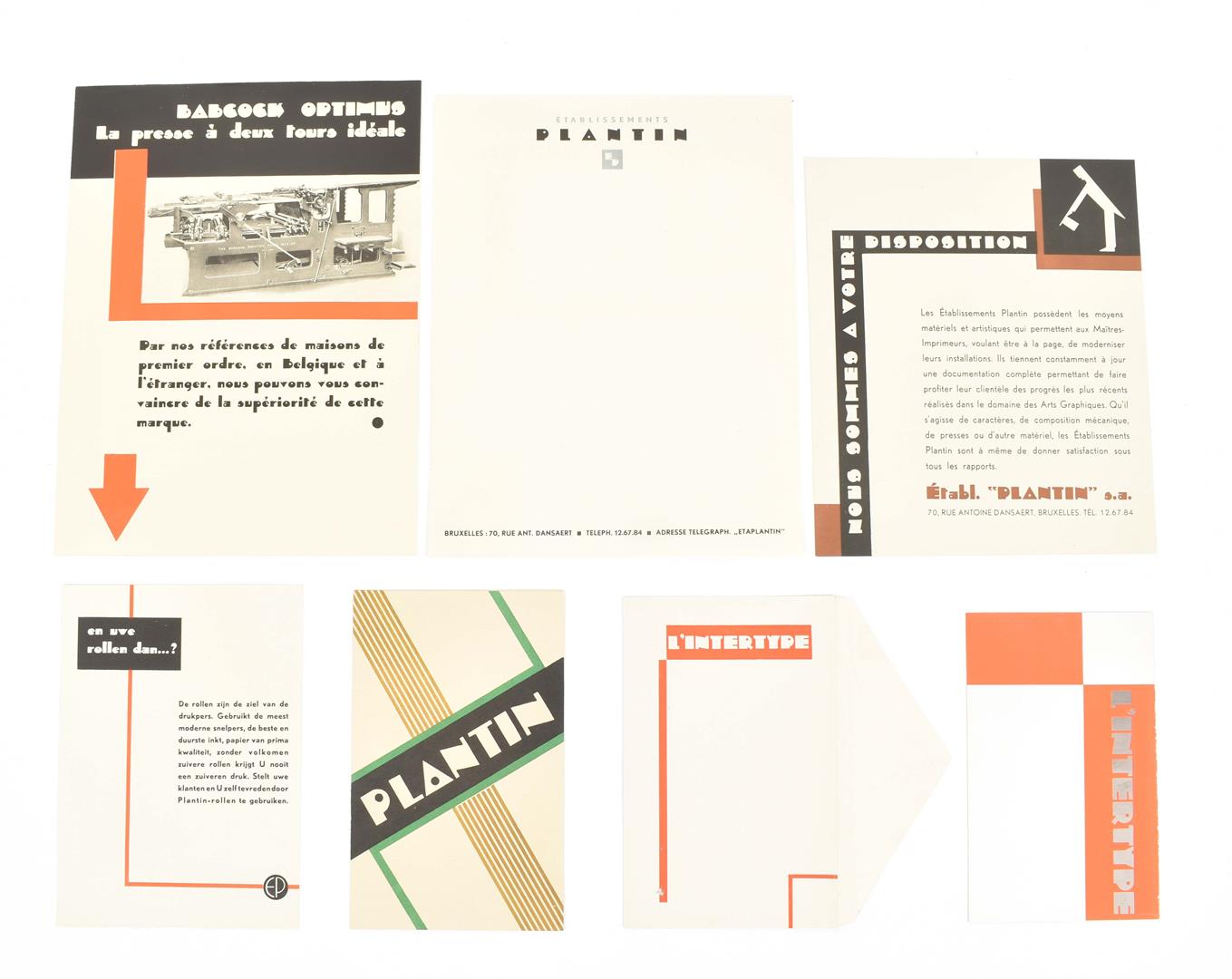 A few sm. imperfections, but overall a very good copy. Splendidly executed, very rare portfolio, advertising "notre caractère de publicité "L'Indépendant", a very distinctive lettertype. The choice of the name of the type is not by chance: the portfolio was publ. exactly 100 years after the Belgian Revolution. The portfolio contains a.o. a fold. flyer printed in green and black (dated 1930, unfold. 37 x 45 cm), a bifolium printed in blue, black and silver advertising "L'Automat" (a printing press), a bifolium printed in red and black advertising "L'Intertype" (another printing press, the bifolium in the orig. envelope), a bifolium printed in green and black listing "Plantin's specialiteiten" and a leaf printed in black and brown, "Nous sommes à votre disposition".