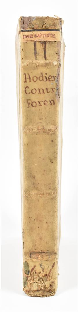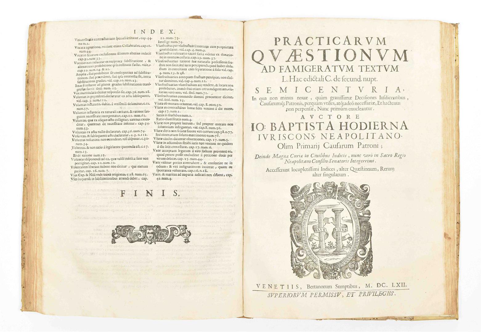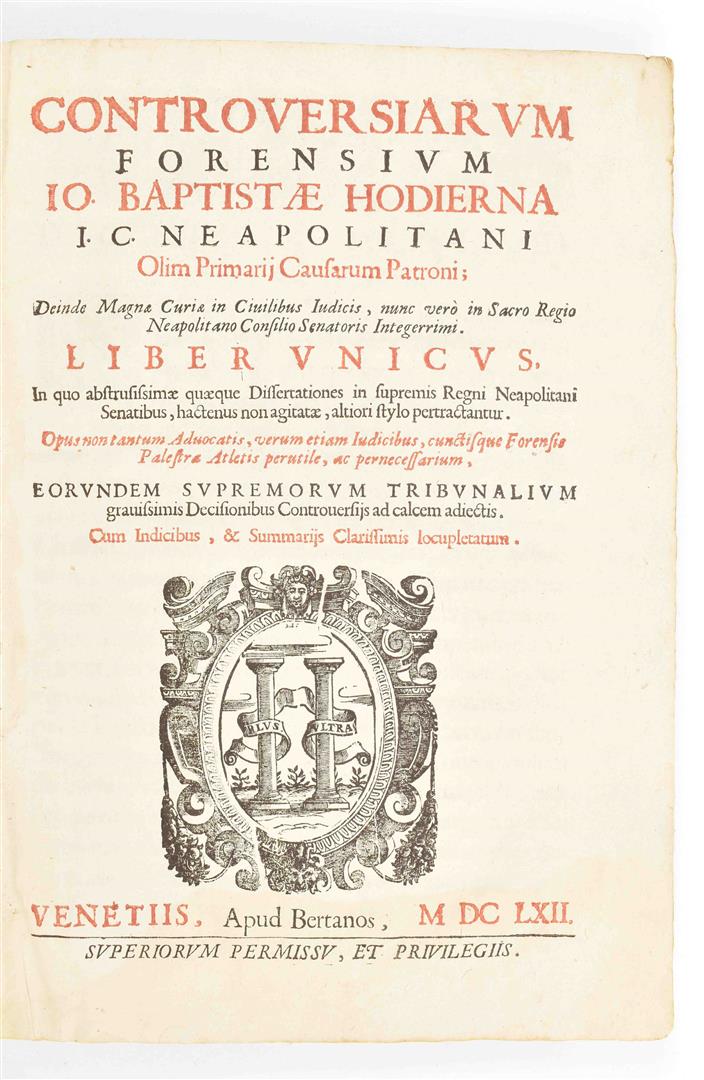 Io. Baptistae Hodierna I. C. neapolitani olim primarij causarum patroni; (...) In quo abstrusissimae quaeque dissertationes in supremis regni Neapolitani Senatibus (...). Venice, Bertanos, 1662. 2 works in 1 vol. (14),296,(48); (8),156,(32) p. 2 title-p. engr. Contemp. hvellum w. manuscript title and later ticket on spine. Folio.