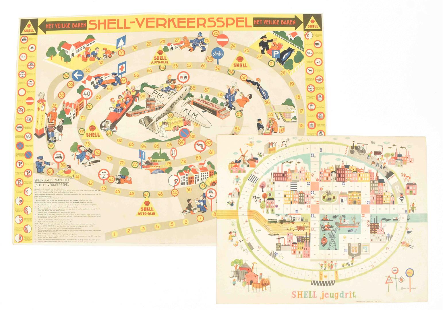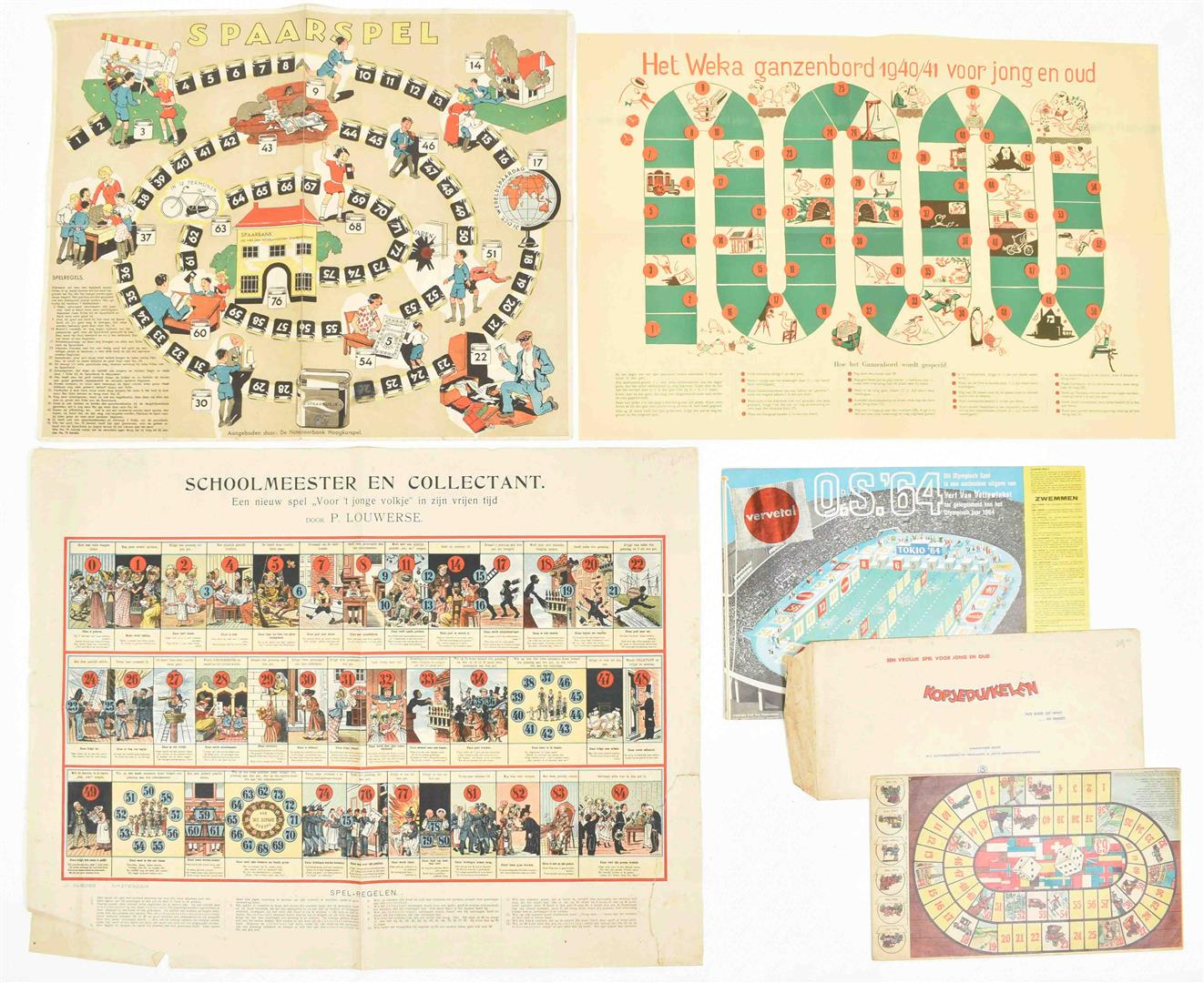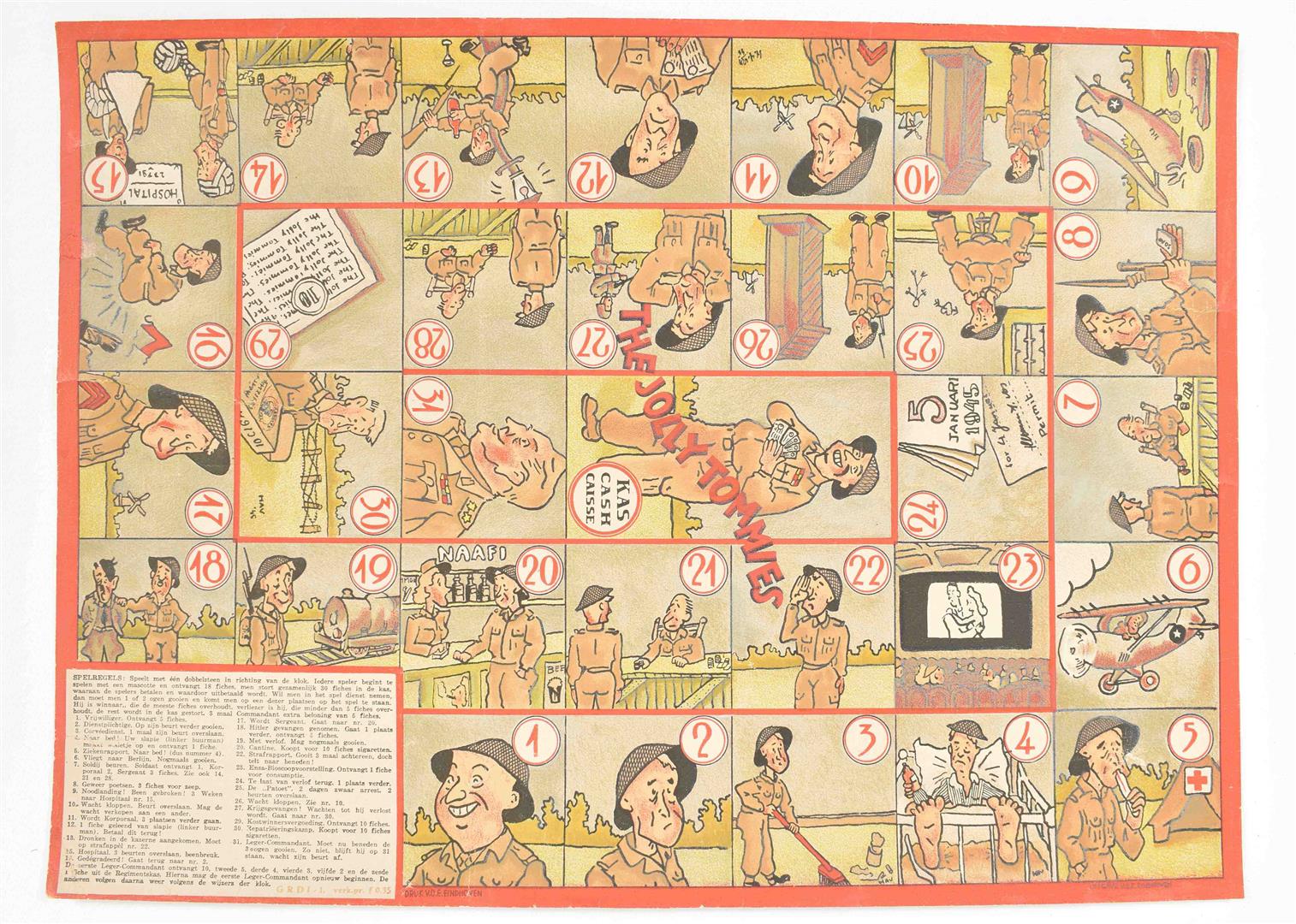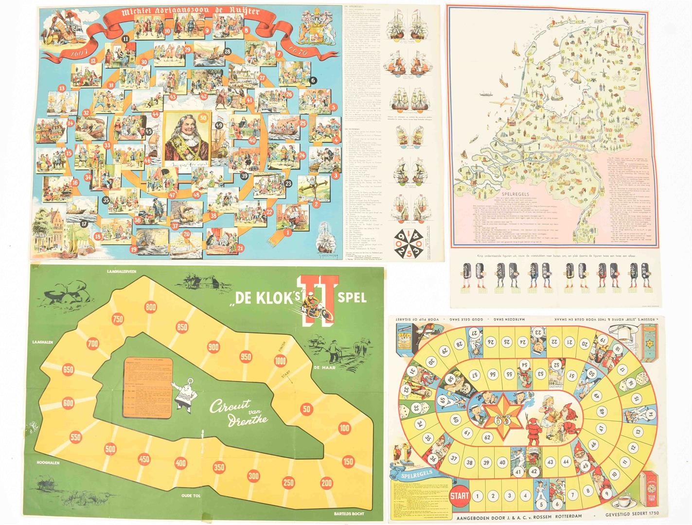 42 x 61 cm. With: (2) Union, Groningen. Het Bruinkoolbrikettenspel. 58.5 x 41 cm. (3) De Klok's TT spel. (4) Michiel Adriaanszoon de Ruijter spel. (5) The Jolly Tommies. Ca. 1944 (Rule 18 "Hitler gevangen genomen. Gaat 1 plaats verder, ontvangt 5 fiches").