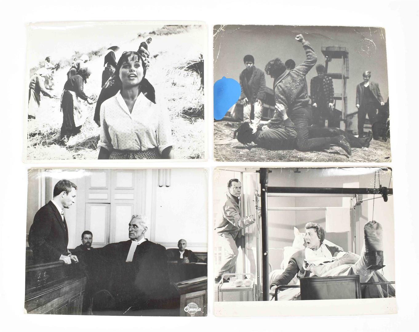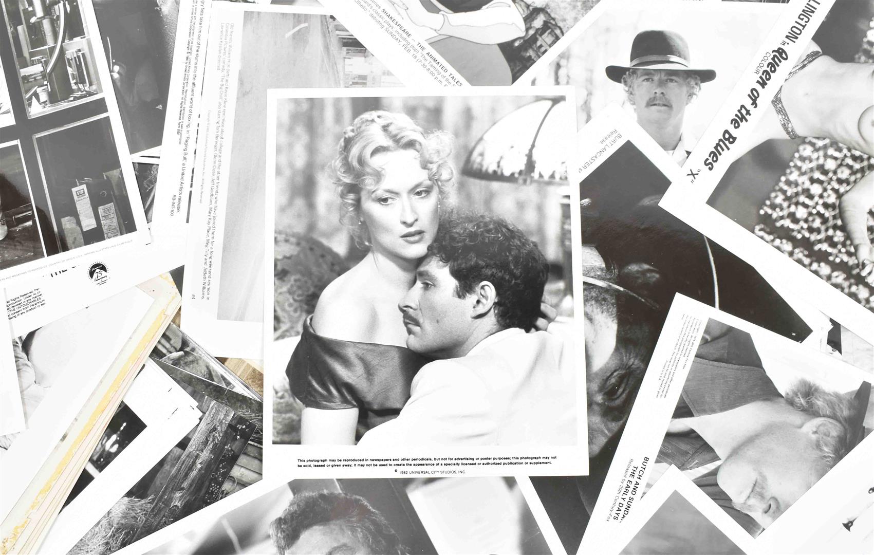 Var. countries, ca. 1960-1990, var. sizes (mostly ca. 20 x 25 cm). Incl. duplicates. Partly warped, occas. other defects. Showing a.o. Yul Brynner, Kenneth More (North West Frontier), Henry Drummond and Matthew Harrison Brady (Inherit the Wind), Alec Guinnes (Tunes of Glory), Glen Ford (Experiment in Terror), Henry Fonda (Advise & Consent), Eddie Murphy (Harlem Nights), Treat Williams (Shadow of a fallen prince), Michael J. Fox (The secret of my success), Lynn Lowry (Sugar Cookies), Susan Howard and Michael Parks (Sidewinder one), Humphrey Bogart (In a lonely place), Sean Connery and Kevin Costner (The Untouchables), Meryl Streep (Sophie's choice), Clint Eastwood (Unforgiven), James Caan (Hide in plain sight), Tom Selleck (Innocent man), Albert Finney and Tom Courtenay (The Dresser), Gene Hackman (March or Die) scenes from the movies Dragonslayer, The Amateur, Used People, Les vieux de la ville, Altered states, etc.