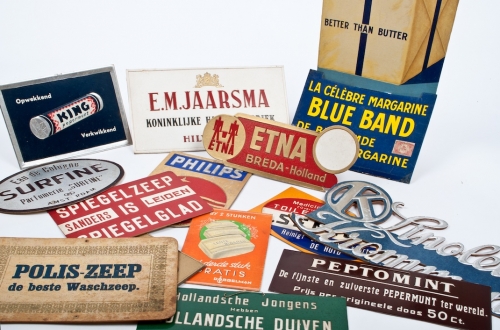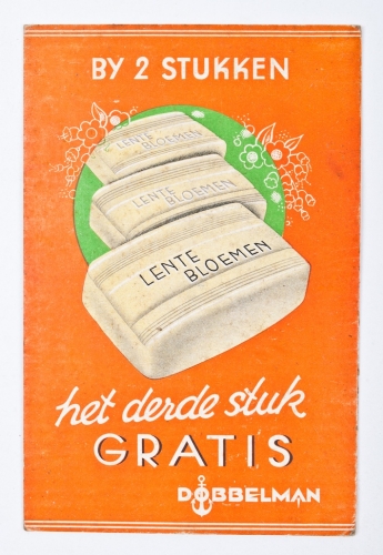 Cardboard displays. Blue binding, de Beroemde Margarine, Medicinale Toiletzeep, "Senco". (cleans and preserves the skin), Pleines Hollandsche Druiven, Polis-Zeep, Philips, Etna, Jansen & Tilanus, Sufine Eau de Cologne, Jaarsma Haarden, Peptomint Pepermunt, King Pepermunt, Linoleum Krommenie, Dobbelman Zeep and Spiegelzeep Sanders.