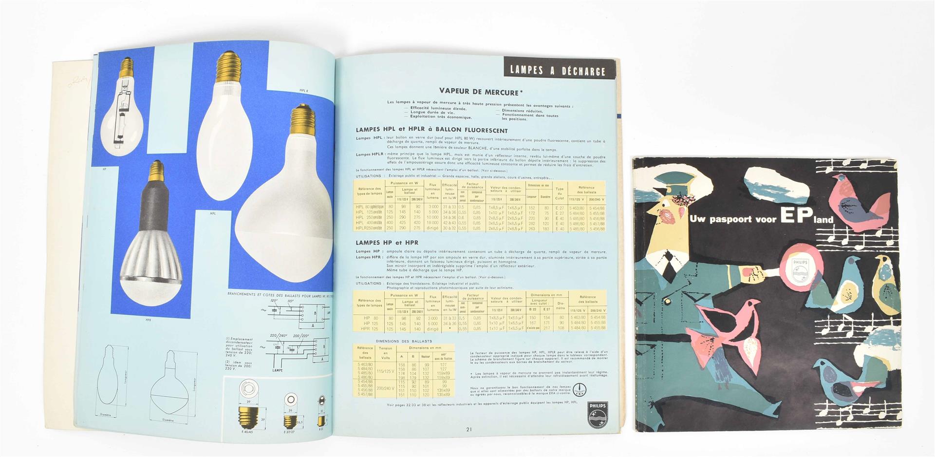 Including: (1) Kies uw eigen klankkleur. Philips Radio. Oblong brochure, 1953. 48 p. (2) Philips Catalogue élairage 1958-59. 48 p. with loose price list -and 18 similar ones. Added: Philps Philishave paper mask and the april issue of Life International magazine including an article of Philips.