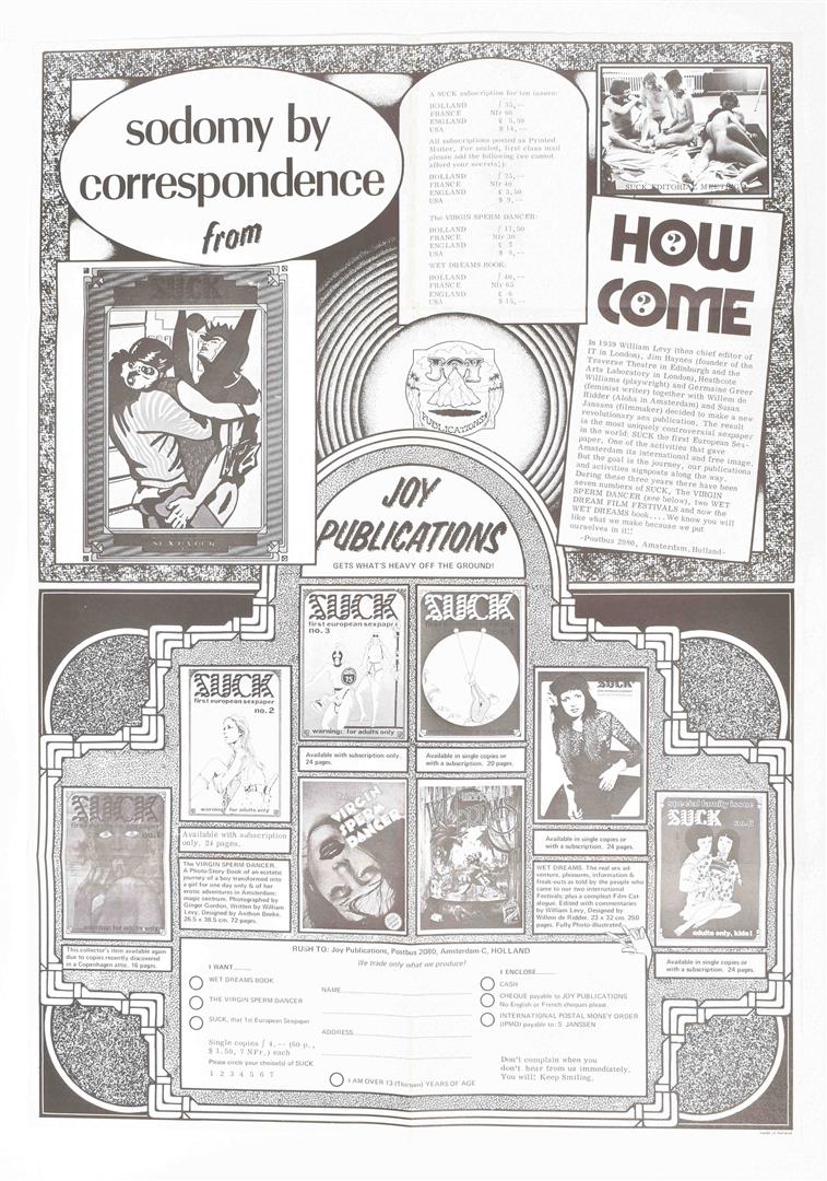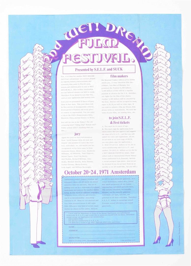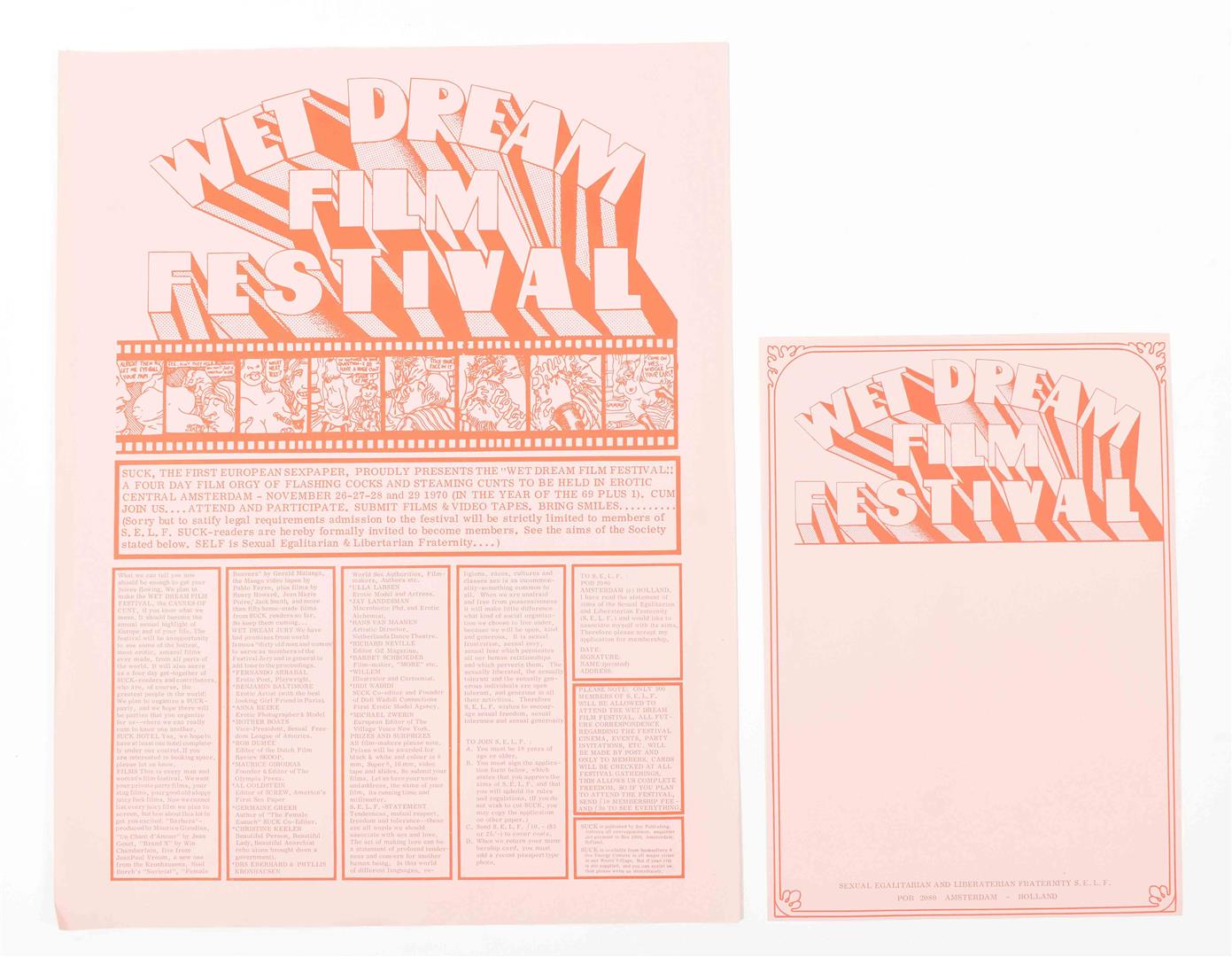 No. 2, 3 and the special cosmological issue. Added: (1) 4 sm. posters/ flyers/ pamphlets for Wet Dream film festivals. (2) Sm. poster for the "2nd Int. Porno Film Festival in Amsterdam". 39 x 30 cm. (3) Subscription poster from Joy Publications (Wet Dreams, Virgin Sperm Dancer, Suck), "Sodomy by Correspondence". 58 x 41 cm. Folded. (4) An erotic postcard from Suck.
