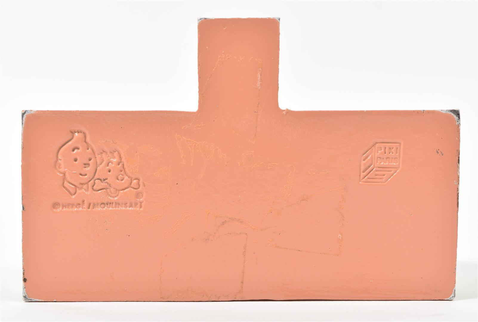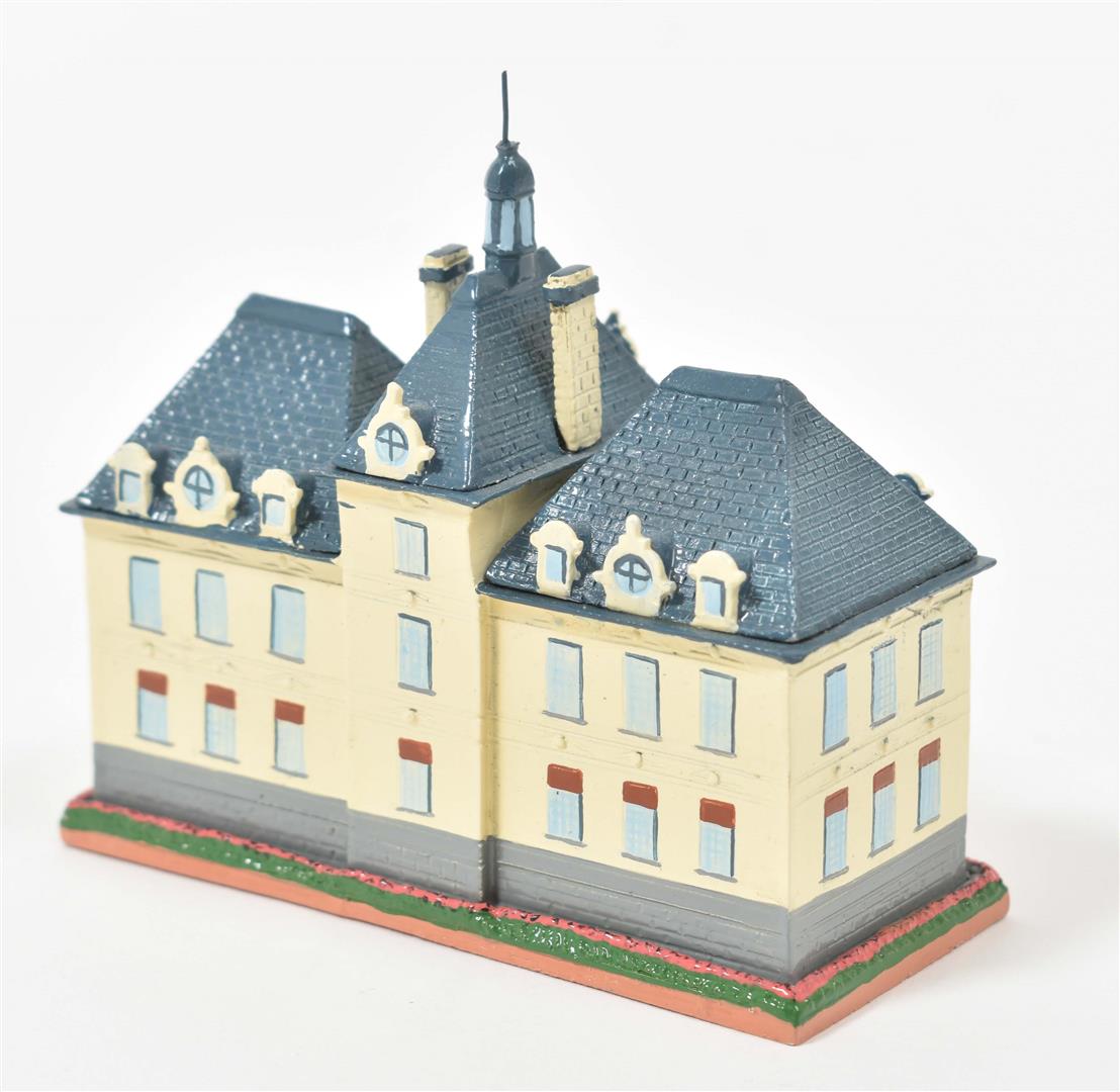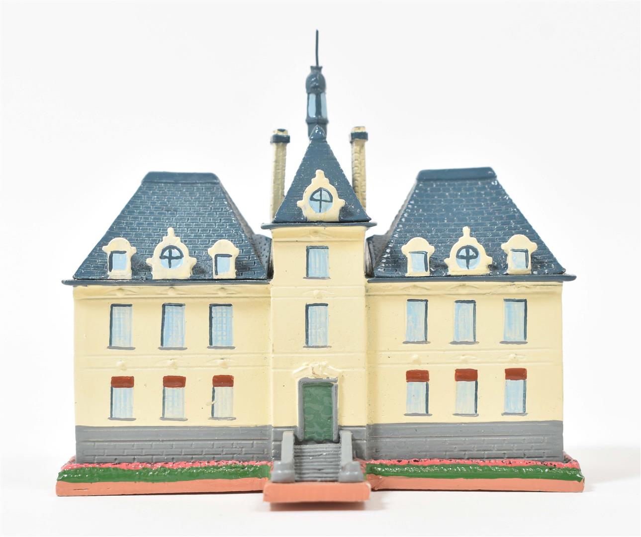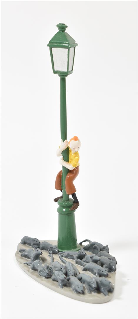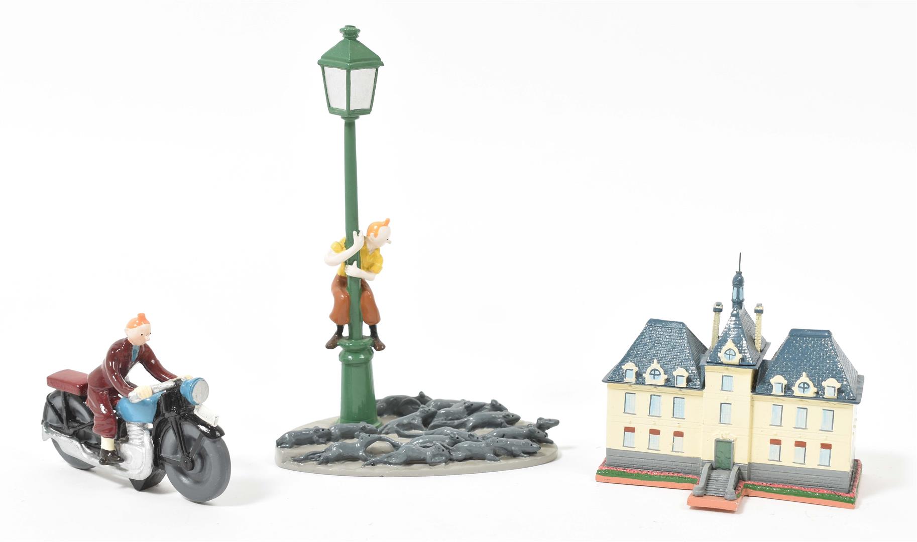 (1) "Le réverbère et les rats" from "L'Etoile mysterieuse". Pixi 4535, hand-painted lead, 13.5 cm tall, 1993. Stamped "Hergé" and "Pixi Paris" on bottom. (2) 'Le château de Moulinsart'. Pixi plomb, hand-painted lead, 7.5 x 3 x 7 cm, ca. 1996. Stamped "Hergé/ Moulinsart" and "Pixi Paris" on bottom. (3) "Tintin à moto" from "Le Sceptre d'Ottokar". Pixi 4512, polychrome lead, 5 cm tall, ca. 1991. Stamped "Pixi Paris" on bottom.