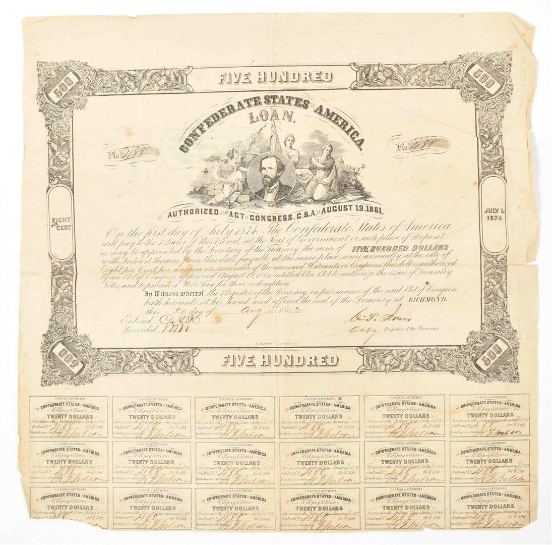Stamp verso. Edges worn/ w. sm. tears, folds. The Confederacy started issuing bonds in order to raise money to finance its government and, later on, the Civil War.