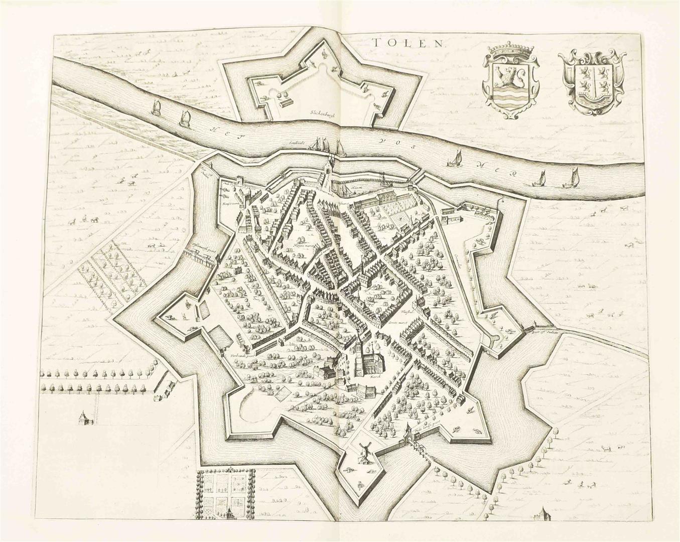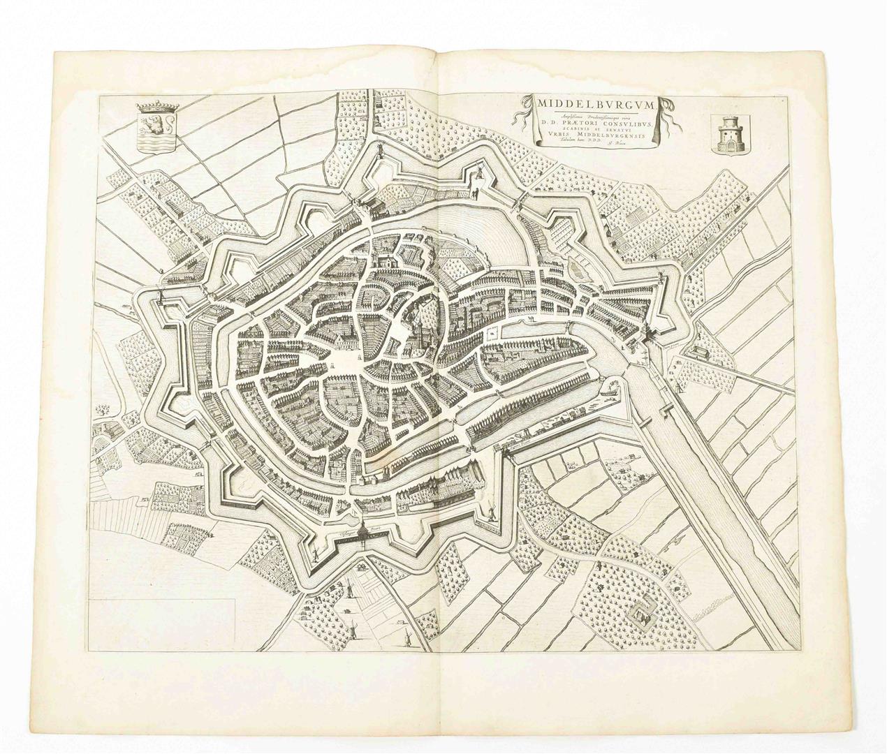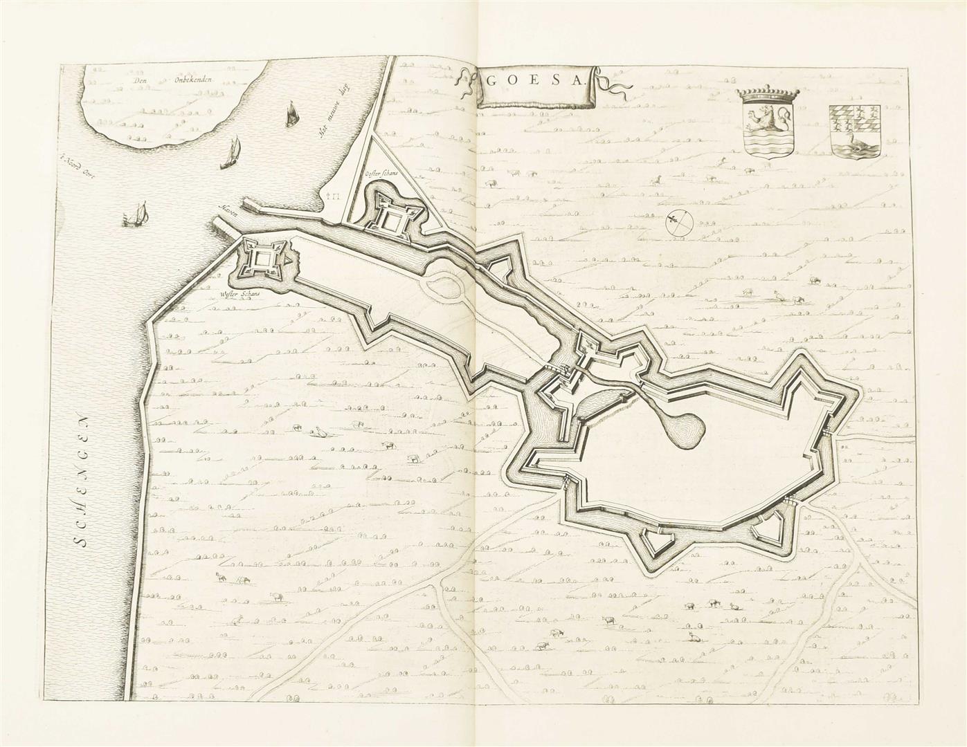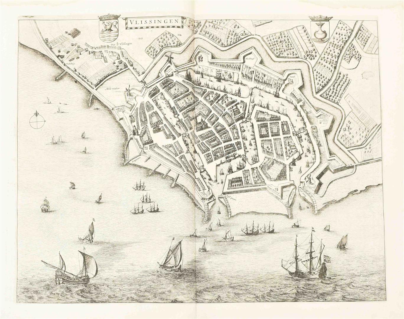 Amst., 1649. Dutch ed. (1) Vlissingen, double folio plan in bird's eye view, title and coats of arms of Zeeland and Flushing on top. (2) Rammekens or Zeeburg, double folio view, title on top. (3) Middelburgh, double folio plan, coats of arms of Zeeland and Middelburgh and title on top. (4) Veere, idem. (5) Arnemuyden, idem. (6) Goes, double folio plan in outline. (7) Zirikzea-Ziriczee, double folio plan, coats of arms, 2 cartouches w. title and putto, legenda. (8) Tolen-Tholen, double folio plan w. coats of arms, verso all w. Dutch text.