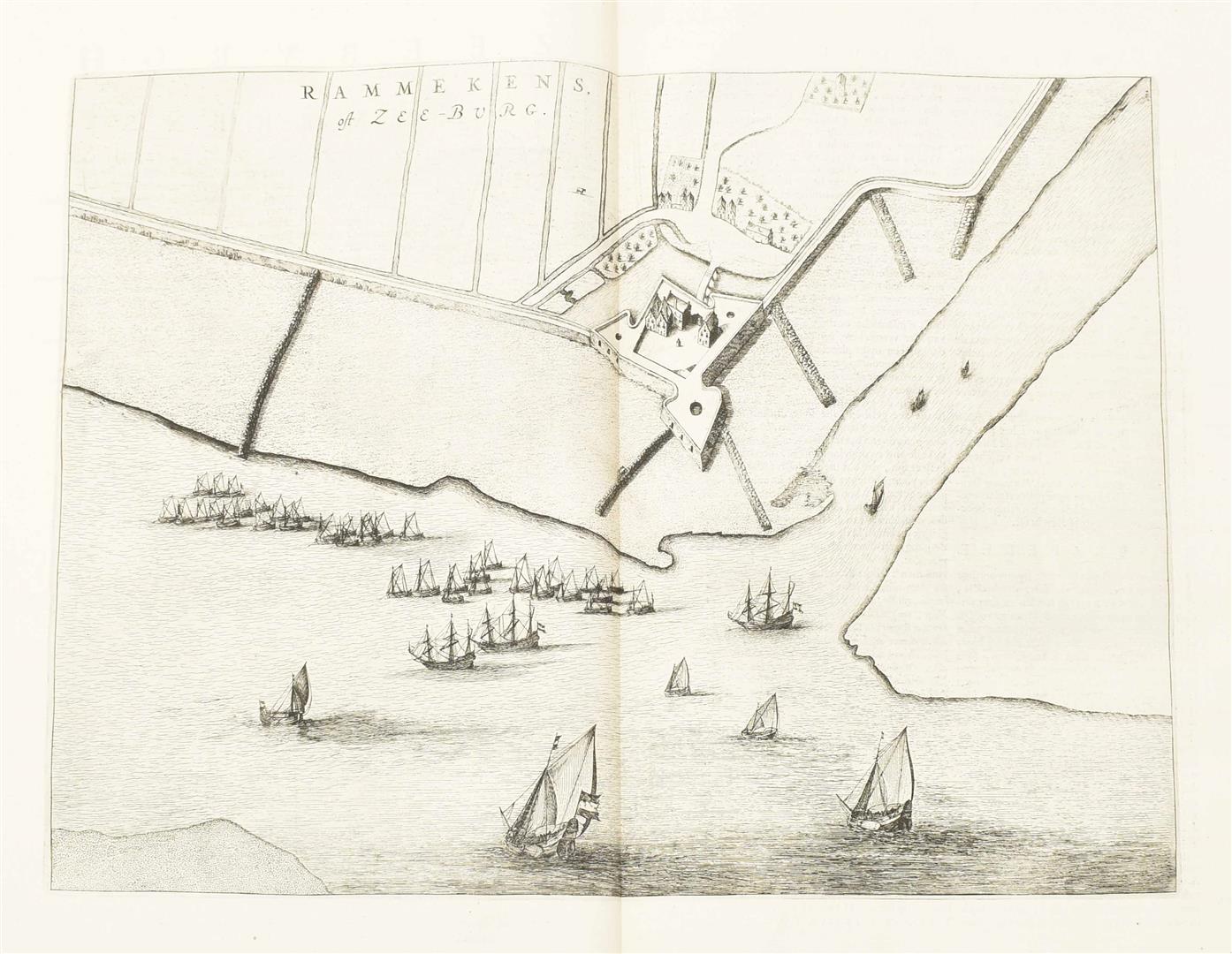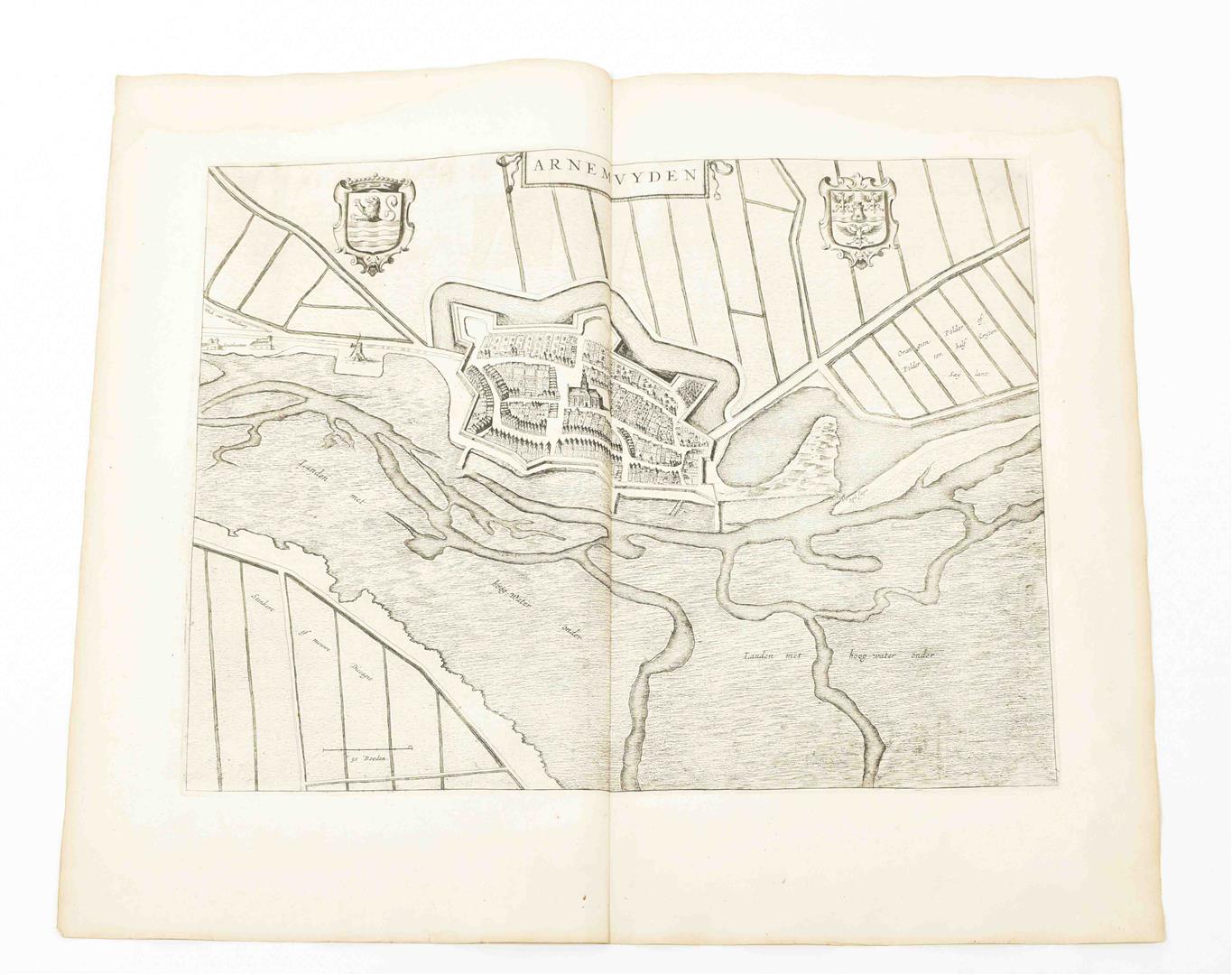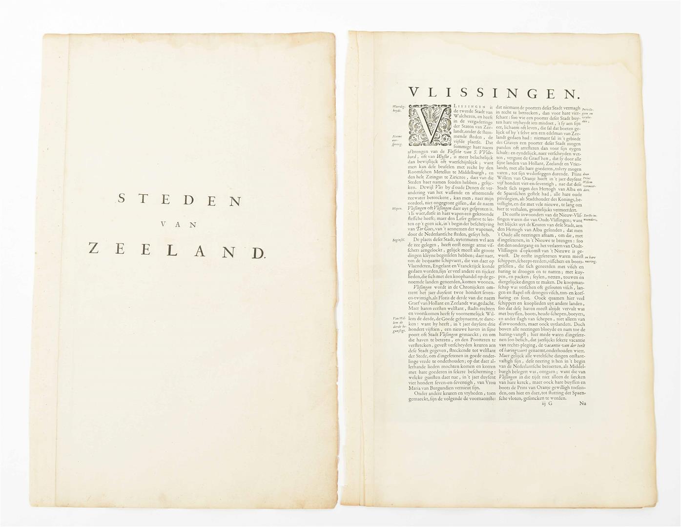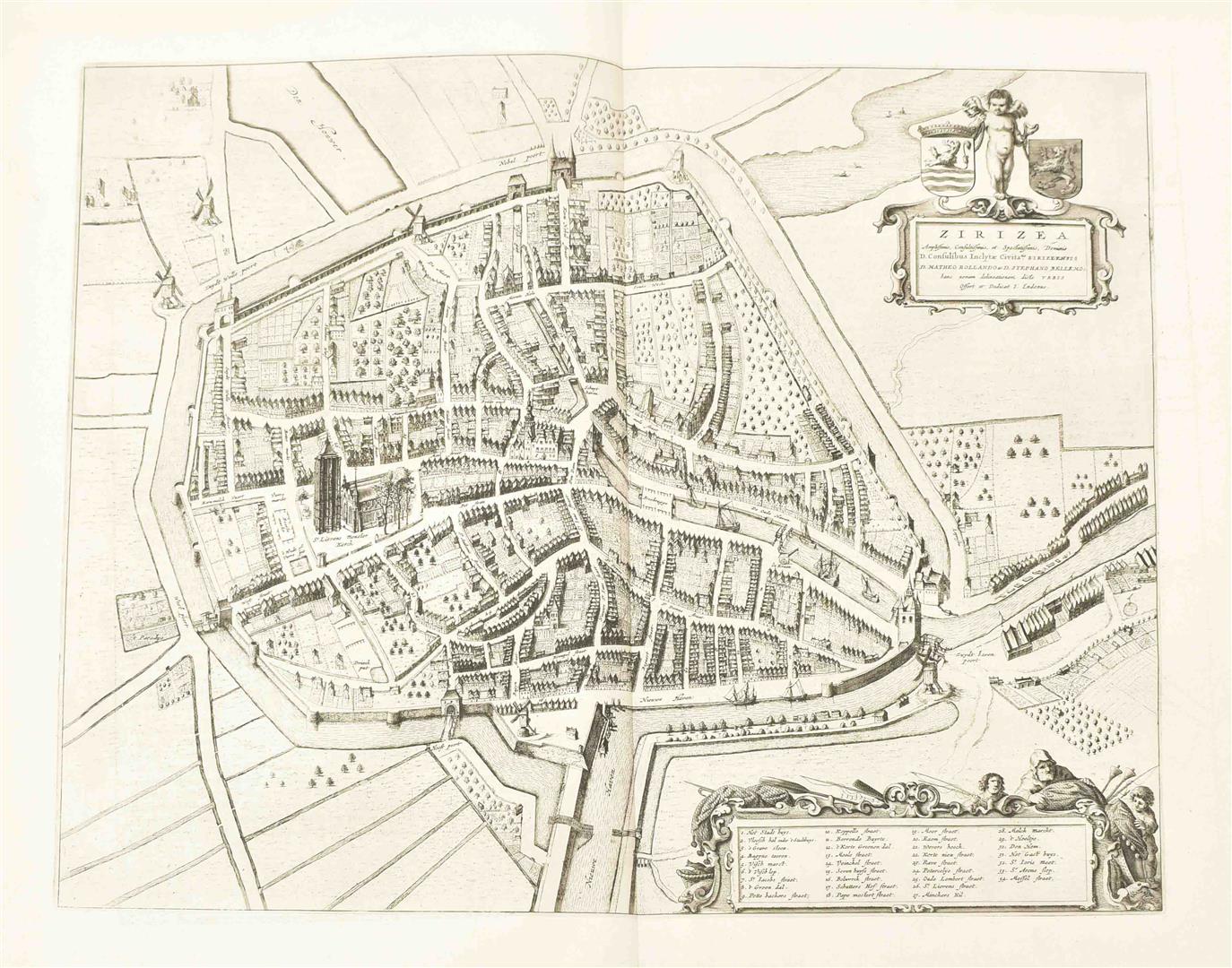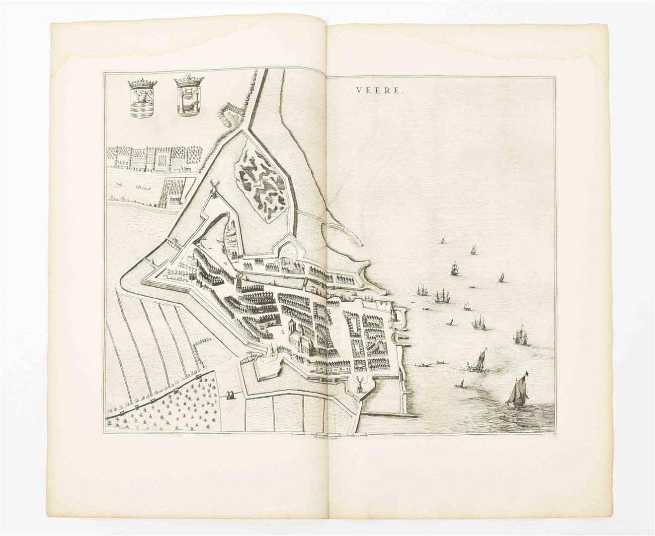 Amst., 1649. Dutch ed. (1) Vlissingen, double folio plan in bird's eye view, title and coats of arms of Zeeland and Flushing on top. (2) Rammekens or Zeeburg, double folio view, title on top. (3) Middelburgh, double folio plan, coats of arms of Zeeland and Middelburgh and title on top. (4) Veere, idem. (5) Arnemuyden, idem. (6) Goes, double folio plan in outline. (7) Zirikzea-Ziriczee, double folio plan, coats of arms, 2 cartouches w. title and putto, legenda. (8) Tolen-Tholen, double folio plan w. coats of arms, verso all w. Dutch text.