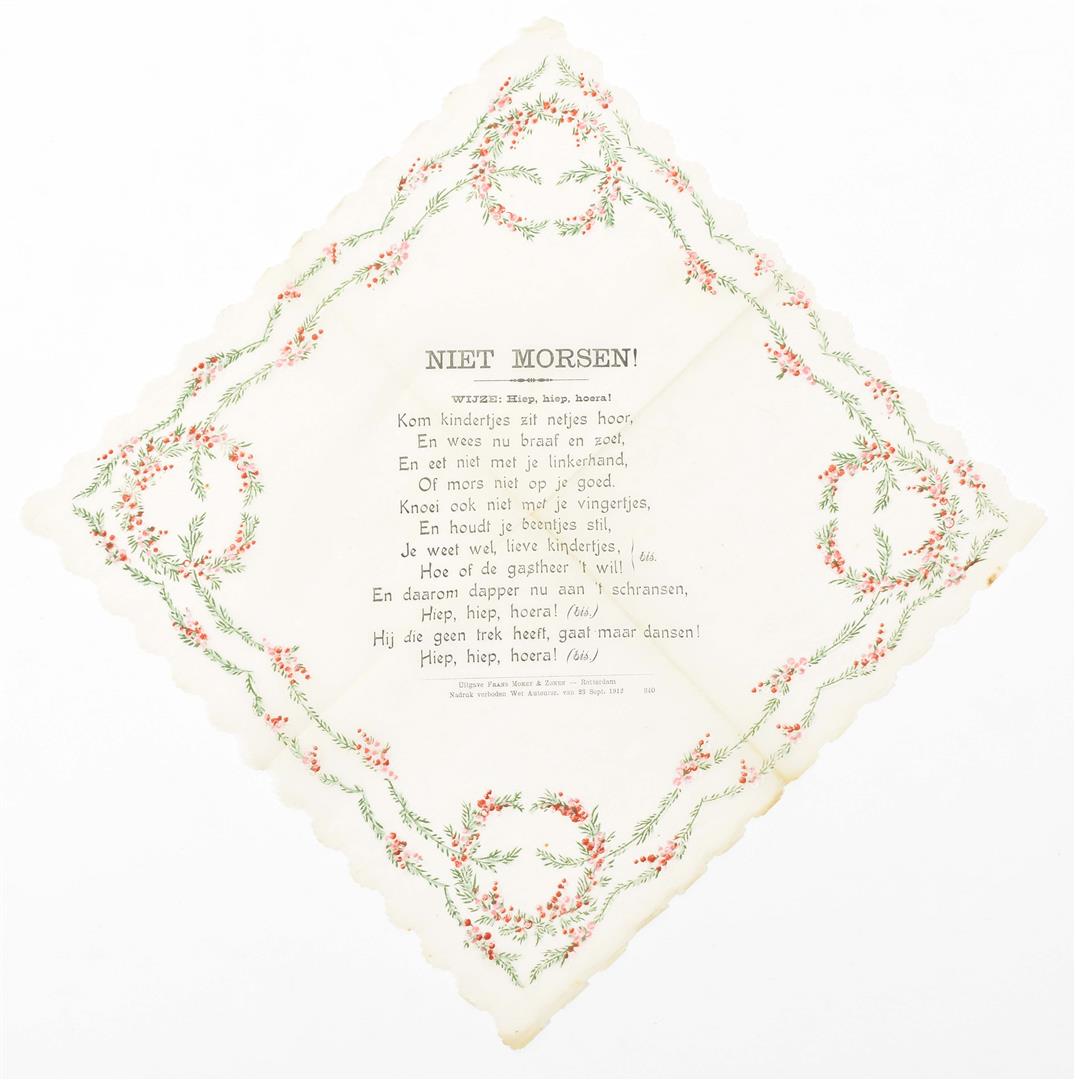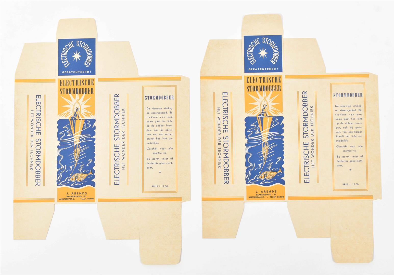 Ca. 1930-85 (mostly 1950s and 60s). Incl. 3 duplicates. (1) Popytex wash-proof textile finish. 1x to starch. 6x washable. This is what women want! Cardboard box printed in purple and black, w. window in front side, when constructed measuring 21.5 x 19 x 12.5 cm, ca. 1965. (2) In de Gekroonde Theerandjes Bakkerij van Kees Vreeburg t/o. Jaarbeurs Utrecht. Van ouds gerenommeerd adres. Opgericht anno 1703. Lithogr. cardboard box printed in gold and red, when constructed measuring 16 x 15 x 5 cm, ca. 1930. (3) Paartjes. De ideale schoudervulling. Cardboard box printed in dark red and green, when constructed measuring 13 x 7 x 7 cm, ca. 1965. (4) Arends, J. (Amst.). Electrische stormdobber. Het wonder der techniek. Gepatenteerd! Cardboard box printed in blue and yellow, when constructed measuring 20 x 6.5 x 6.5 cm, ca. 1950. (5) Three different boxes for Jago s hawls. Added: 27 printed paper napkins (many duplicates), a.o. "Ter gelegenheid van de Vijf- en Twintigarige Echtvereeniging van C.F. Feiter en M. Ottman en A. Feiter en H.C. Ottmann, Amsterdam, 28 april 1878" (on very thin paper, w. nice illustrations and 2 songs), Hotel Velaars J.J. Veerman Baarn (ca. 1900), Van Houten's Cocoa The best in existence (w. text in pencil: "M. 10089-28/2 '06 - 100.000") and 3 var. napkins w. the central song "Niet morsen!".