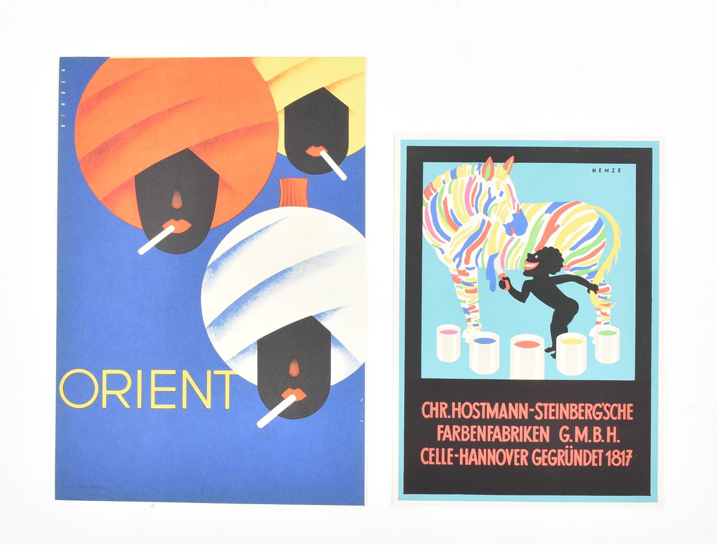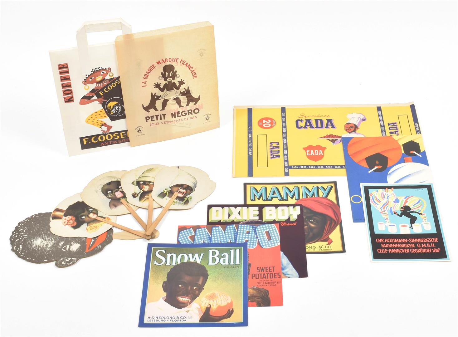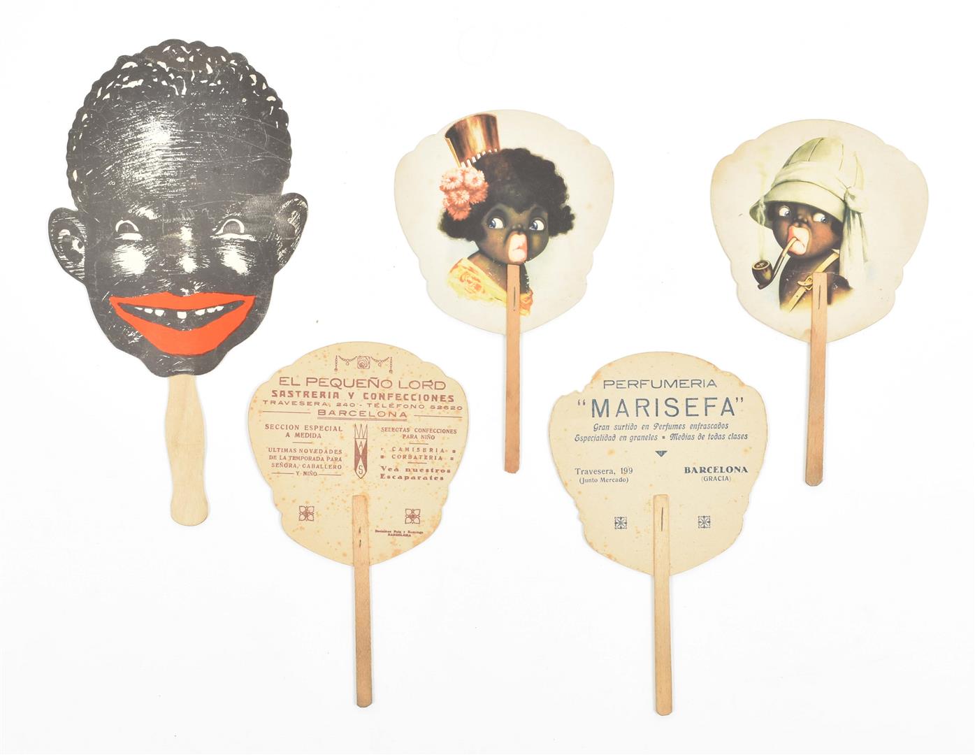 Recto w. 4 different caricatures and verso w. addresses, w. wooden handles, total length approx. 26 cm, issued in Barcelona by El Pequeno Lord sastreria y confecciones (3x) and by Perfumeria Marisefa, most likely 1930s. A bit foxed, minor other imperfections. (5) Menu card in the shape of a cardboard fan, recto w. a smiling face and verso w. the menu, w. wooden handle, total length 34.5 cm, issued by Piccaninny, 3801 W. Madison St. Kedzie 3900, 1930s. Minor imperfections. -and 8 others, incl. a plate for Dujardin by J. Binder.