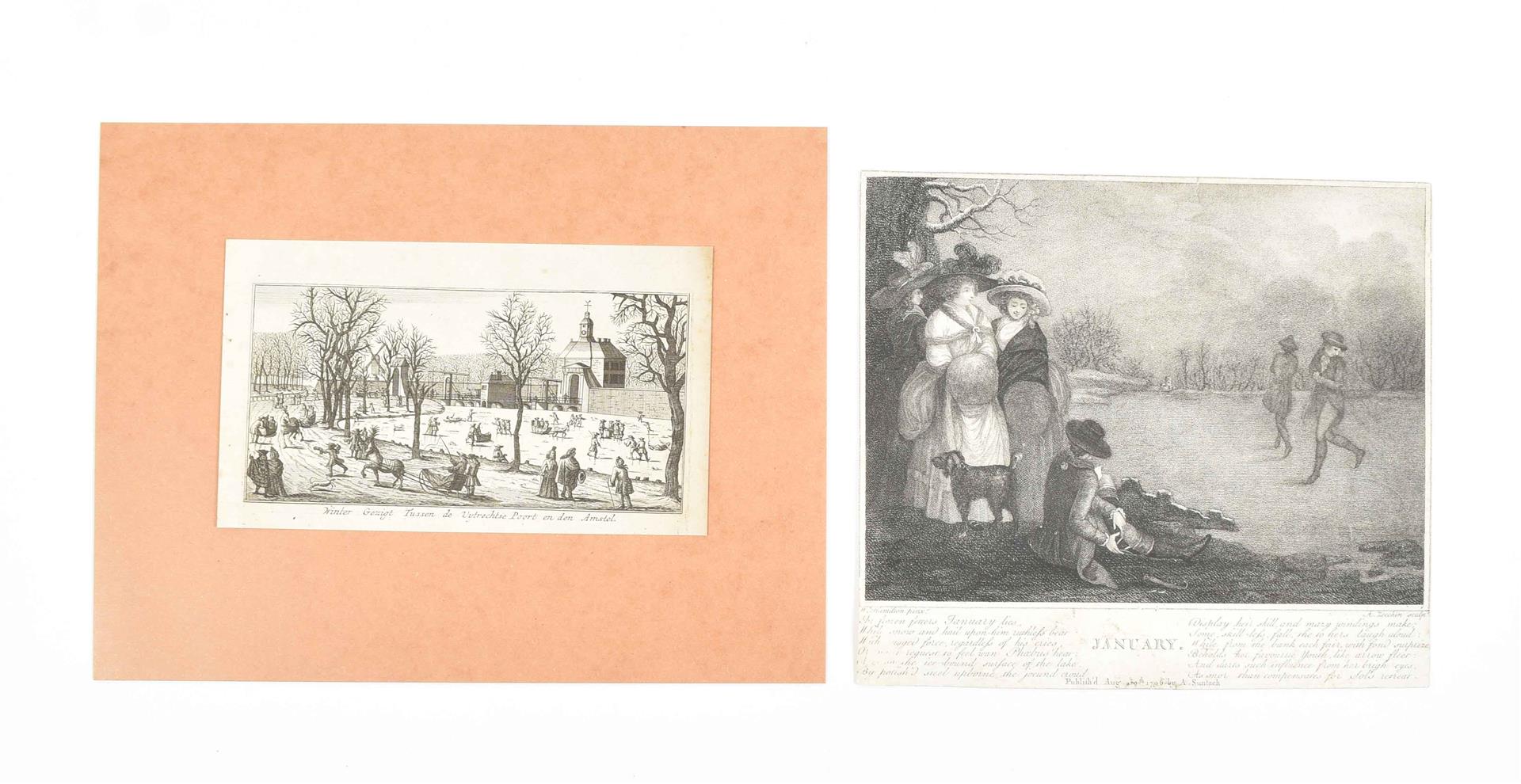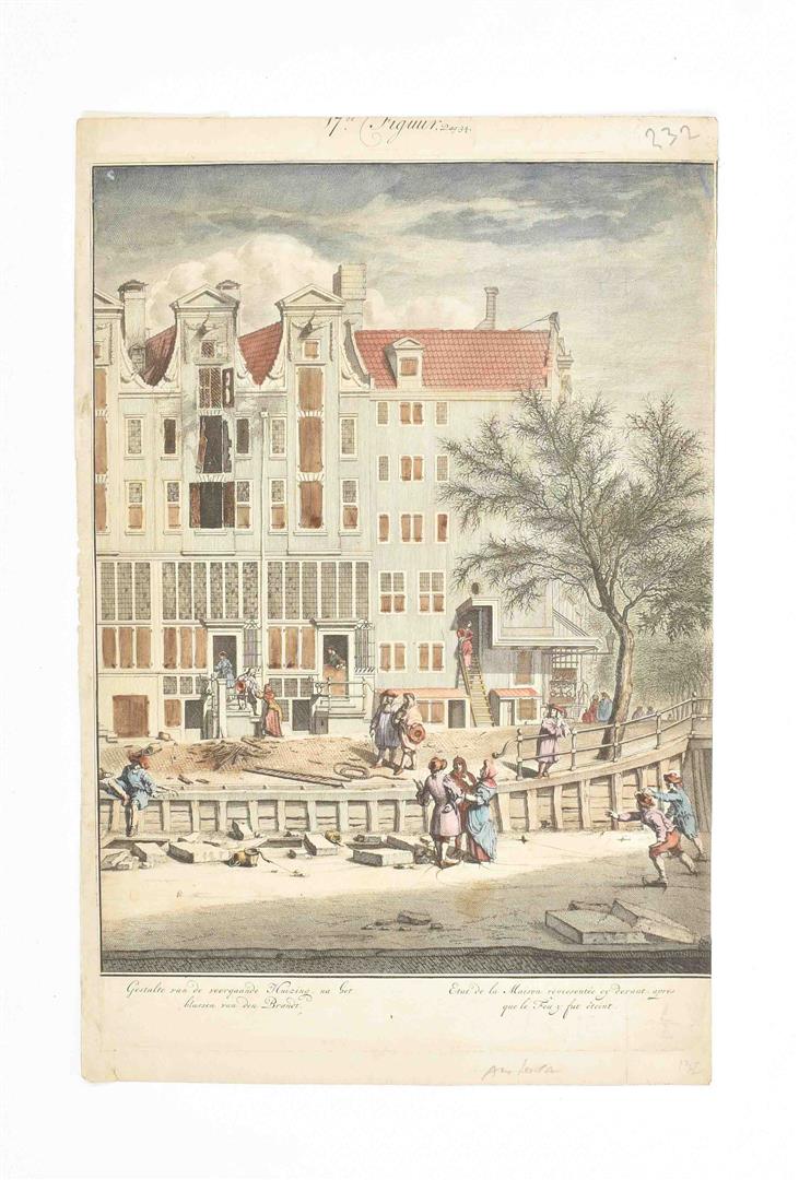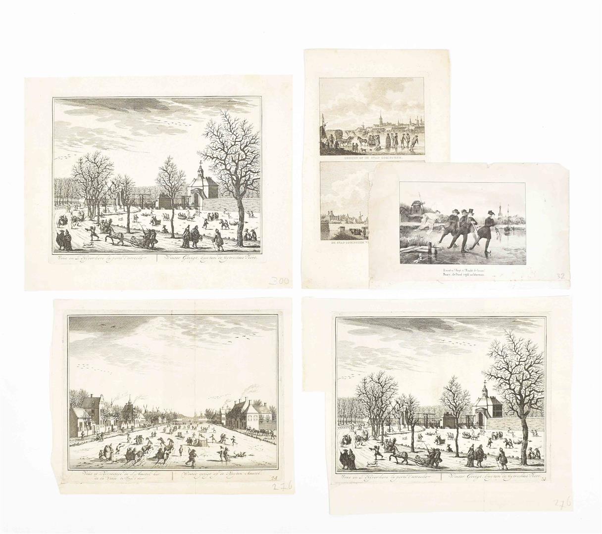 17th-19th cent., var. sizes, kept in modern portfolio. (1) "Gestalte van de voorgaande Huizing, na het blussen van den brandt". Handcol. engr. by J. Mulder after J. van der Heyden, 33 x 25 cm, w. engr. caption in Dutch and French below the image and "17de figuur pa. 34" above the image (cut sl. short), from Van der Heyden's Brandspuitenboek, ca. 1700. Sl. creased and trimmed inside the plate mark in right margin. (2) "Winter gezigtm buyten de Utrechtse Poort". Engr., 15.5 x 20 cm, w. captions in French and Dutch below the image, ca. 1700. (3) "Winter". Engr., 24 x 17 cm, titled, "Ïsack Houwens excudit" and numb. "4" in the plate, under passepartout. -and 22 others.