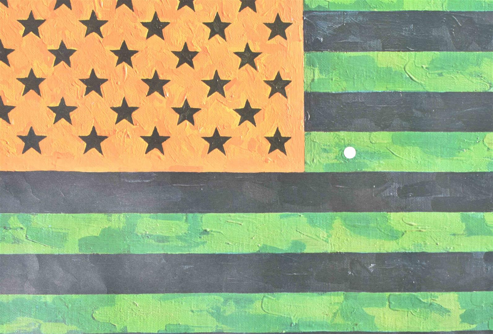Offset, 1969, 73 x 57 cm. Poster of the American flag in complementary colours w. a bullet hole in the centre, meant as a protest against American involvement in Southeast Asia.