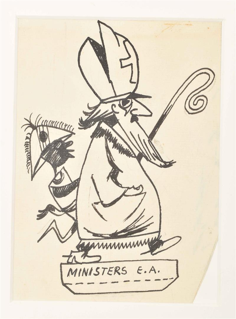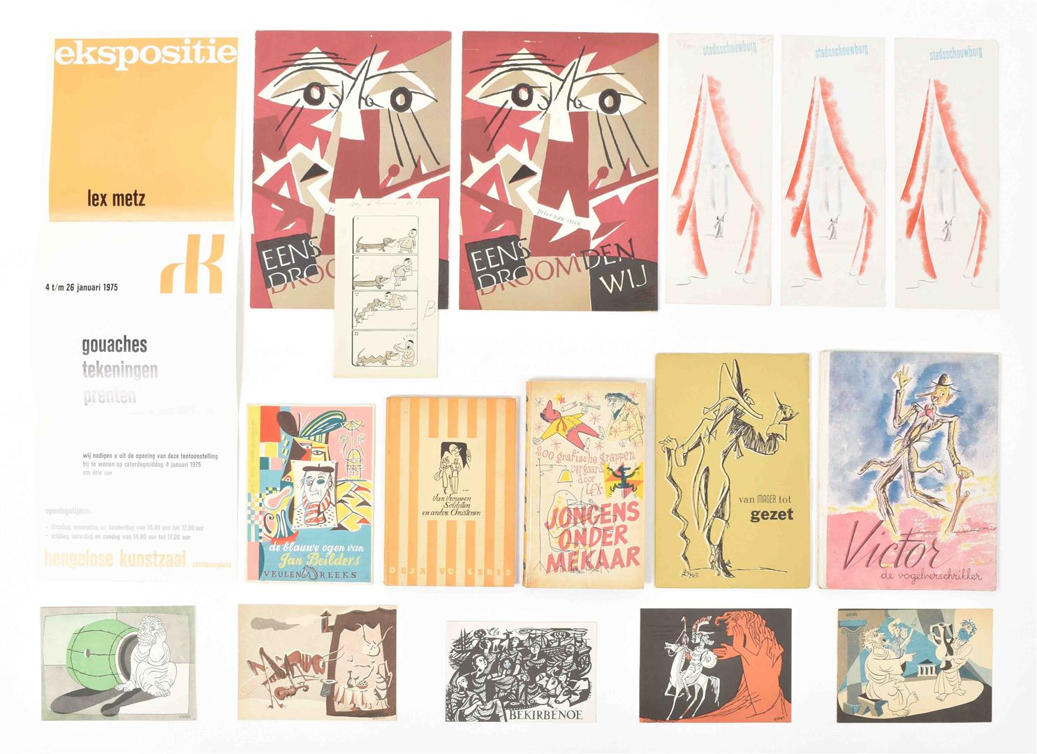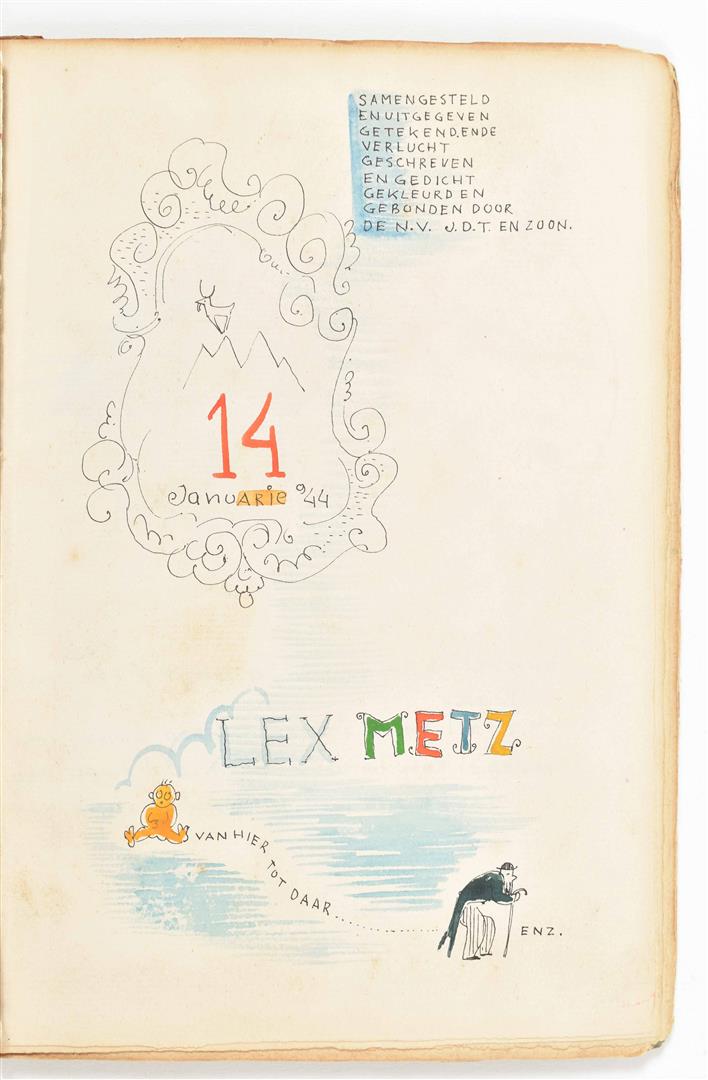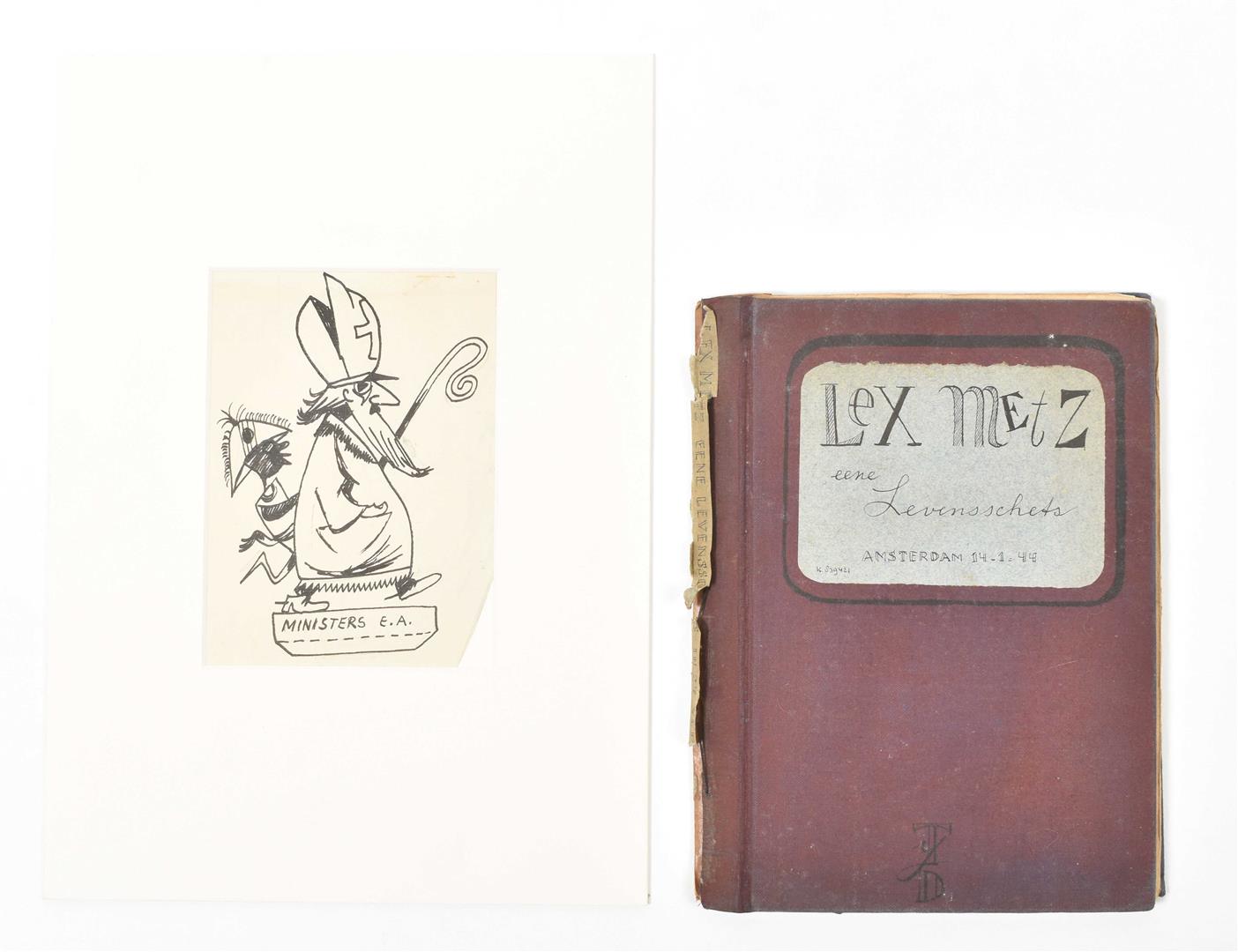 Amst., 14-1-'44. Ill. manuscript, "samengesteld en uitgegeven, getekend ende verlucht, geschreven en gedicht, gekleurd en gebonden door de N.V. J.D.T. en Zoon. 14 Januari '44", title-p. and 25 lvs of different paper, all w. text in verses and ills. in pen finished as watercol./ gouaches, in cl. binding w. paper title on front cover (w. mock (?) k-number 839421 in pen), and w. incomplete paper title strip "Lex Metz Eene levensschets in 24 ver[...]" on spine, 21 x 15 cm. Very nice personal document. (2-12) Series of 11 caricatures in pen and black ink, var. sizes and irregular shapes, under 9 passepartouts. All shaped like figures that can be cut out, w. fold. "stands" w. captions like "ministers e.a." (Sinterklaas and Zwarte Piet), "dwaas", "rund", "snavel de pechvogel", "koor van stommen", "Cornelis medestander" etc. -and 18 others, mainly printed books and flyers, incl. 2 copies of the verse Eens droomden wij by P. van Steen, printed in 200 numb. copies signed by the author, 1957, w. col. lithogr. by Metz.