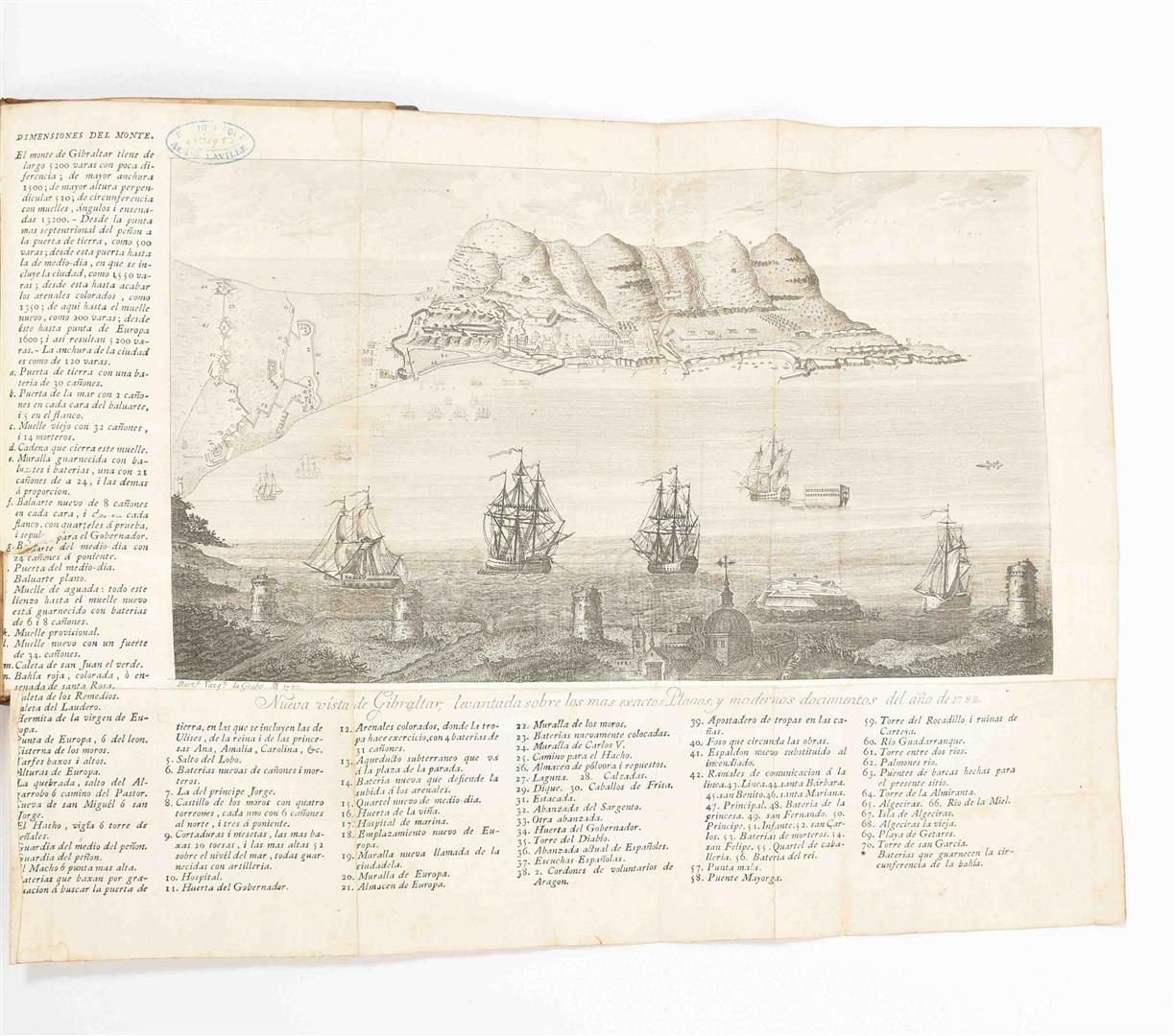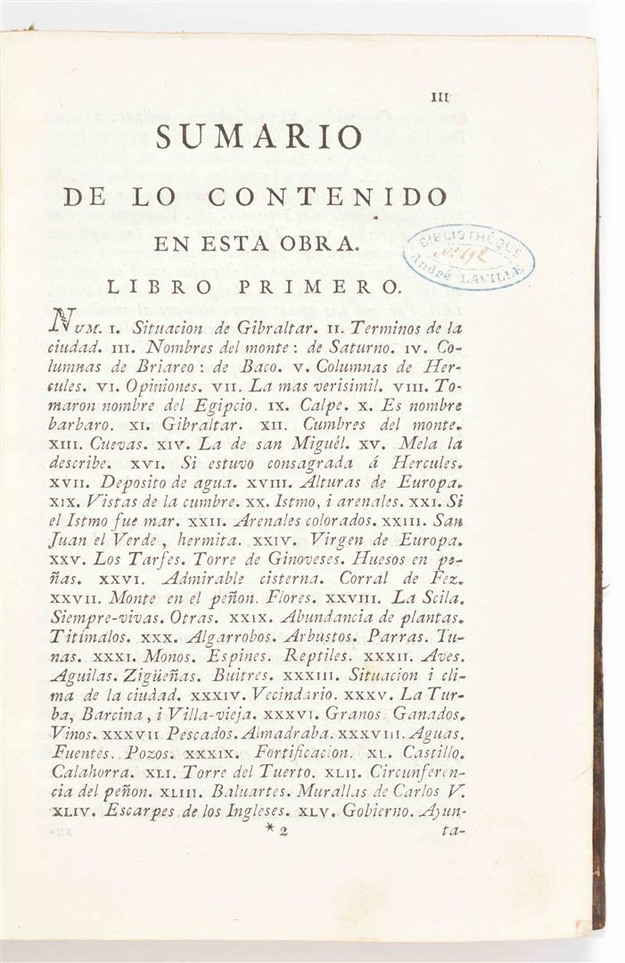 Handwritten note on title-p., stating date and price of the work bought by André Laville (1891), stamp from Laville's library on some p. Covers sl. worn, occas. foxing. History of Gibraltar by the author, historian and astronomer Lopez de Ayala (1745/50-89). It finishes before the Great Siege of Gibraltar in 1782 during which the French and Spanish armies took back the city from the British, who had owned it since 1704.