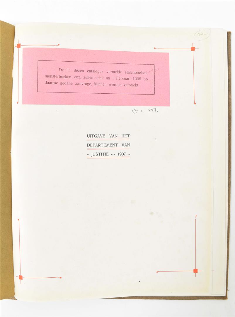 Department of Justice, 1907. 80 p. Dec. cl. Sm. folio. W. 'bureau-benoodigdheden, mattenmakerij, vlechtwerk, zeilmakerswerk' etc.
