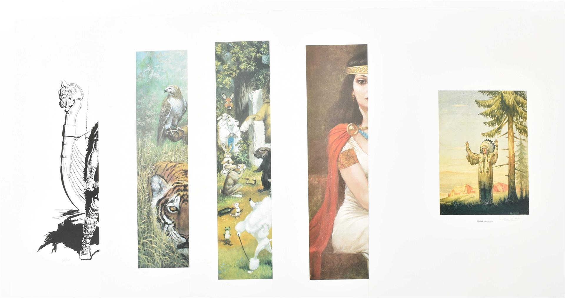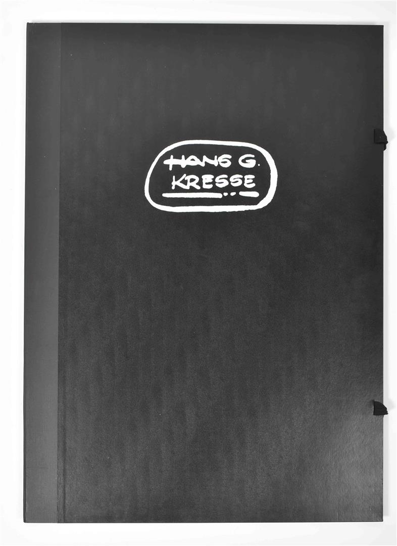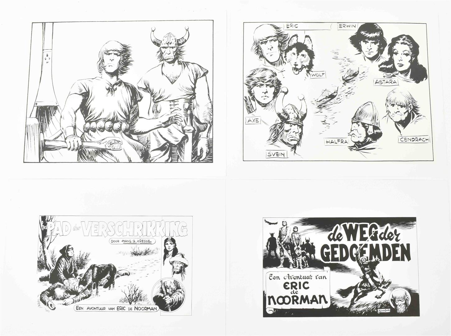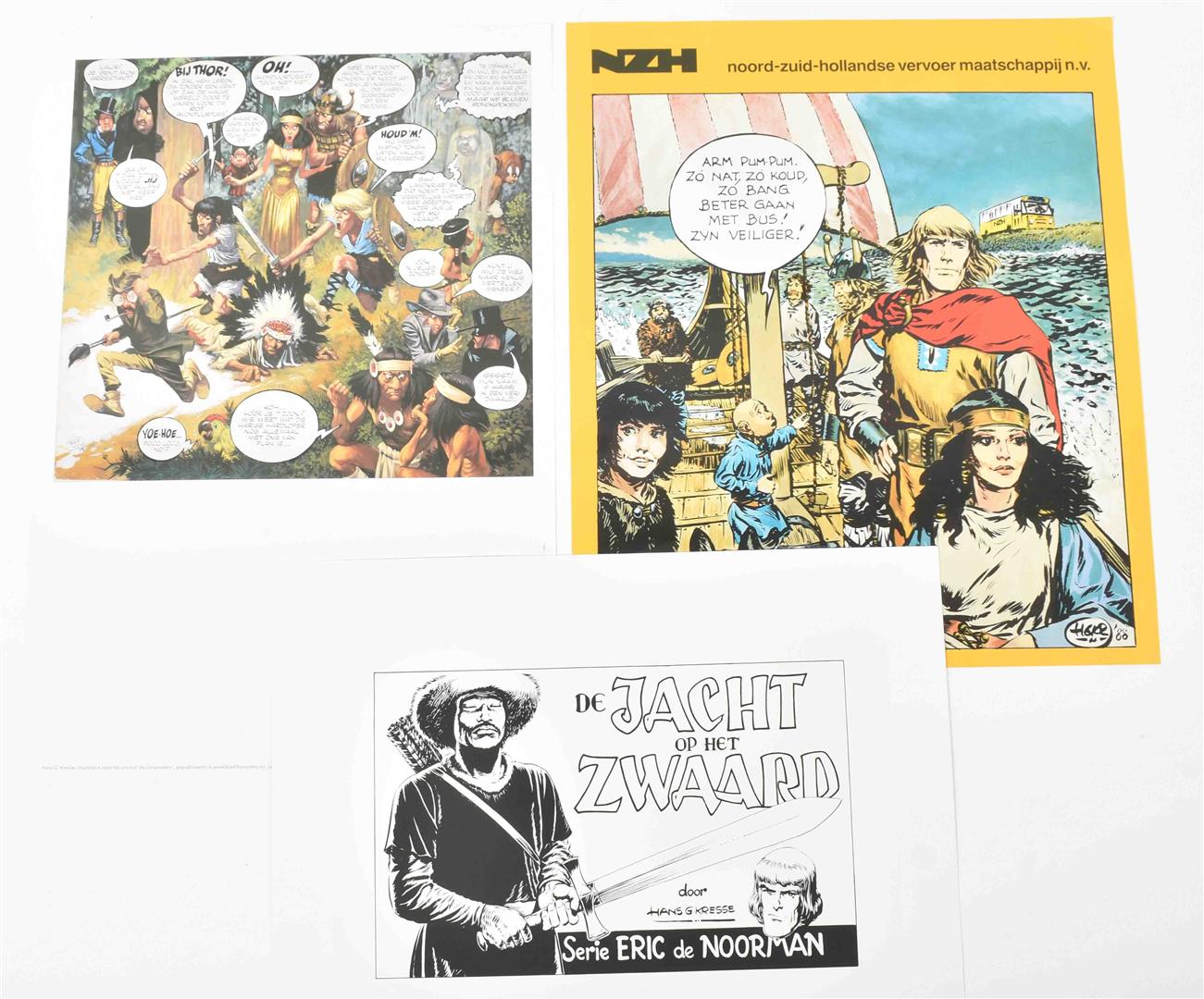 Stripgalerie Panda, 1988. Portfolio consisting of title leaf, 2 b/w screenprints and 7 full col. plates on art paper, each leaf signed and numb. (74/100) in pencil by Kresse. Together in orig. faux leather portfolio w. cl. ties, 71.5 x 51.5 cm. W. Eric de Noorman no. 12, De Heer der Heruli and De Gebroken Pijl, also signed and numb. (42/100) by Kresse. Excellent condition. Added: (1) 5 silkscreen prints by Kresse, all 40 x 50 cm and printed in 100 copies by Stichting de Kressekring, 1992. Excellent condition. (2) Eric de Noorman, nos. 1-11, Wolters-Noordhoff, 1969-72. -and 5 other Kresse prints and posters.
