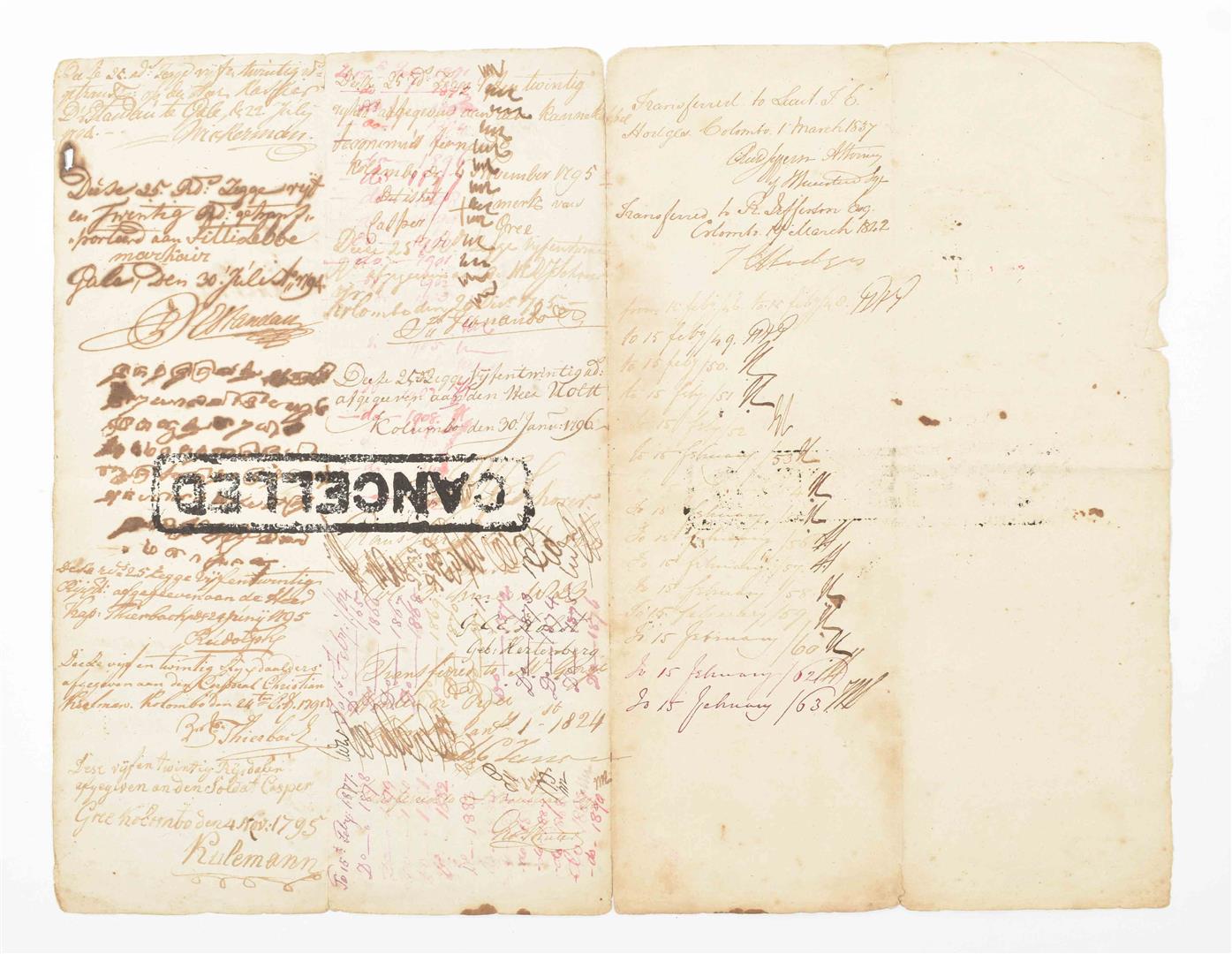 Splitting on central fold, some other folds and minimal other imperfections. Not in Landwehr, V.O.C. No other copies of this denomination traced (but Codrington, Ceylon coins and currency, 1924 not available to us). Extremely rare early "banknote", which remained valid for 118 years. The history of this letter of credit: "After the British Invasion of Ceylon in 1795 the Dutch surrendered to the British, Trincomalee on 1795 August 26th, Jaffna on 1795 September 27th. Doubts arose among the populace about the ability of the Dutch Government to redeem the Kredit Brieven owing to the threatened investment of Colombo by the British. By Plakaat of 1795 December 18th Notice was given to issue Paper Money of smaller denominations 1, 2, 3, 4, 5, 10 Rix-Dollars. Called Kas Nooten the notes were issued dated 1796 January 1st. The British under Article 6 of the Capitulation of Colombo, on 1796 February 15th accepted the liability for up to £50,000 (i.e. 468,750 Ryxd) of Kredit Brieven and Kas Nooten still in Circulation and pay interest at 3% per Annum, payable half yearly. Notes [including ours] were Endorsed in English in pen with 3 percent per annum on this Kredit Brief payable by the British Government of Ceylon under the condition of the Sixth article of the Capitulation of Columbo and on back of Kas Nooten Bearing Interest 3 percent for Annum. Below a Black rectangular Seal of COL.STUART with Persian text in middle of Signature Geo. Gregory over Reg. Colonel James Stuart led the British troops to take Ceylon from the Dutch. George Gregory was collector for Colombo for the British. (...) The Dutch promissory notes taken over by the British Government in 1796, were never called in. (...) After obtaining the approval of the Secretary of State and protracted negotiations with the holders the Government bought in the 130 [remaining] notes in 1912, for a sum of Rs. 13,890 and cancelled them, thus wiping off finally a permanent charge on public funds." (Dutch Ceylon Paper Money 1785-96, online article). From 18 January 1796 up to 1912 the note retained its value for the British state. All this has been noted on the banknote, as its validity had to be extended annually by hand. The note (apparently one of 130 copies still in circulation by 1912) is therefore abundantly covered with these extensions, also on page 2 and of the bifolium (together with transfer registrations by name). The stamp "Cancelled' has been applied to the printed side and on p. 2. We thank Burgersdijk and Niermans for their help with this description and that of the two similar V.O.C. items in this auction.