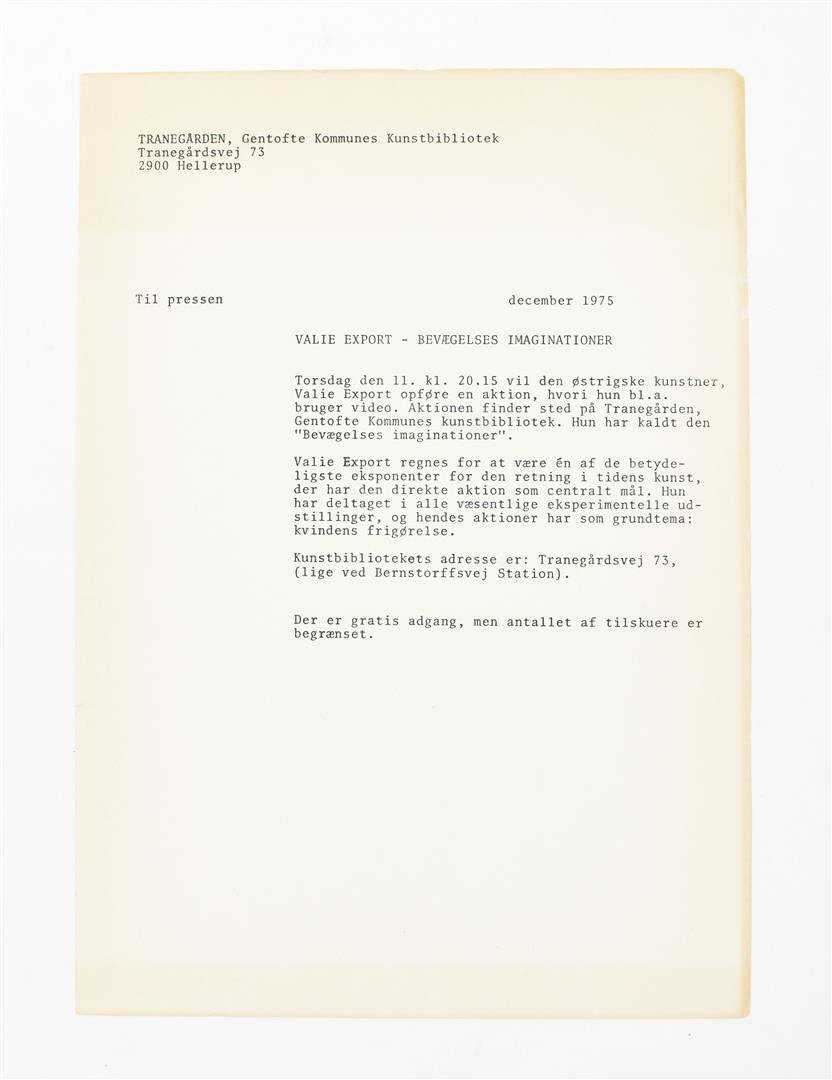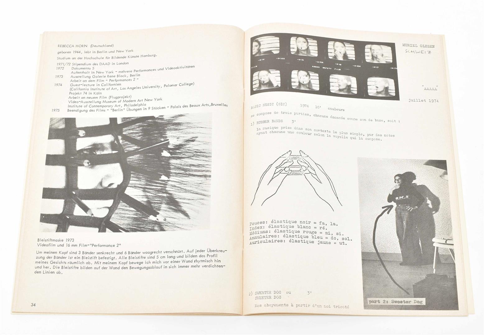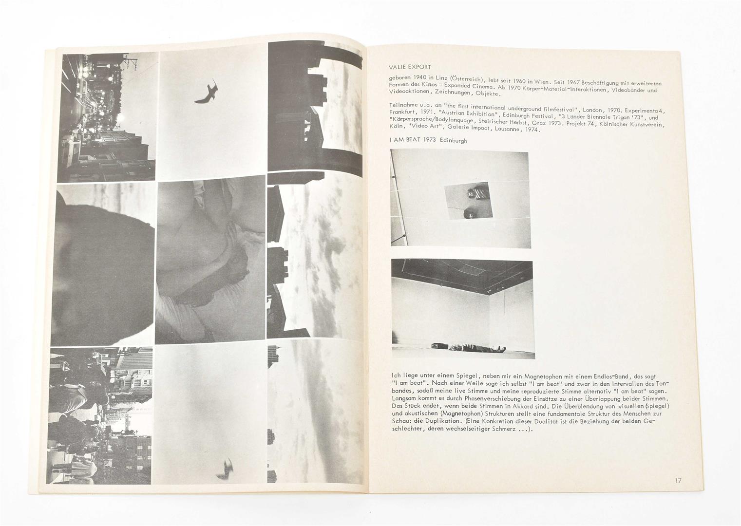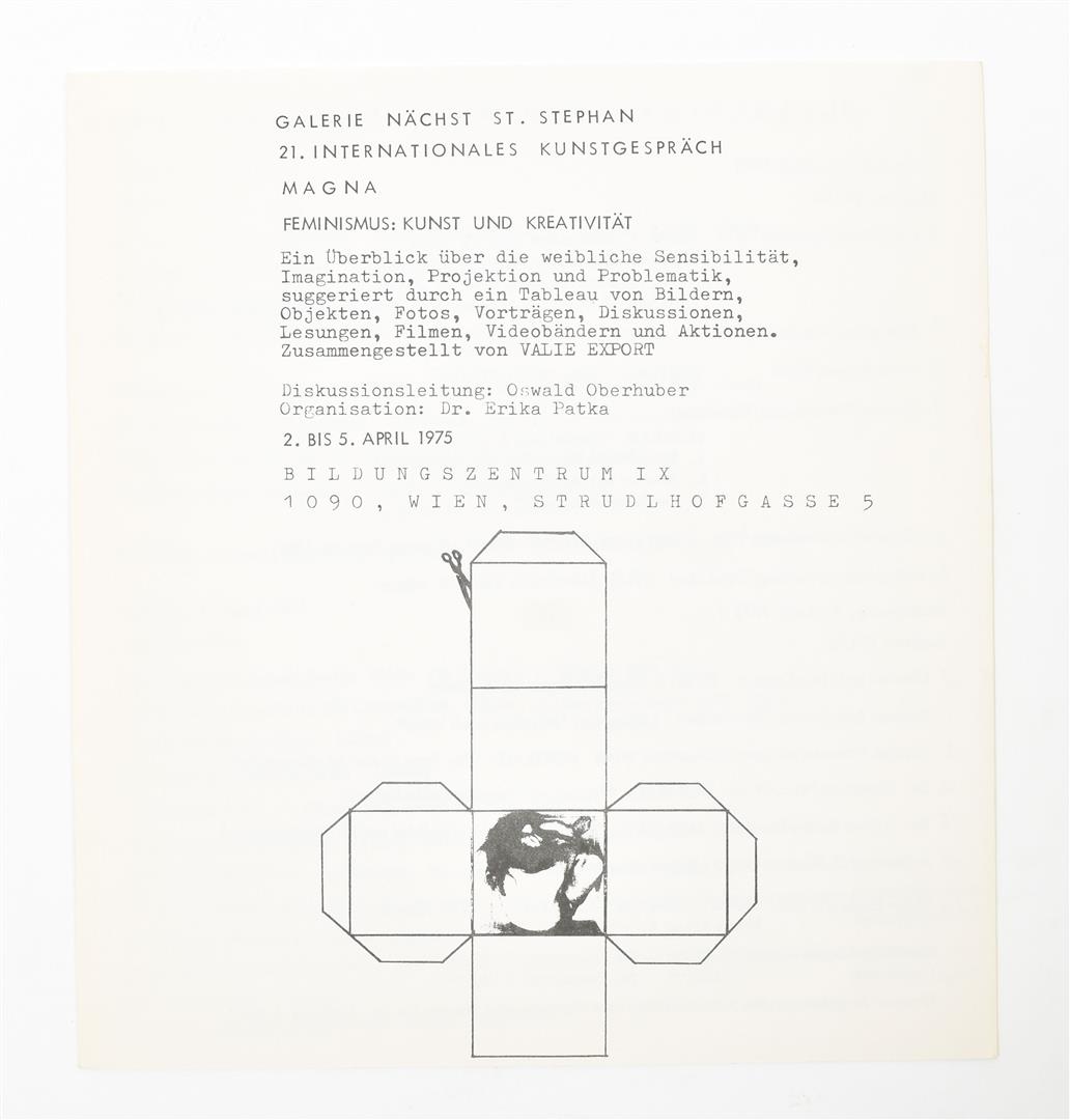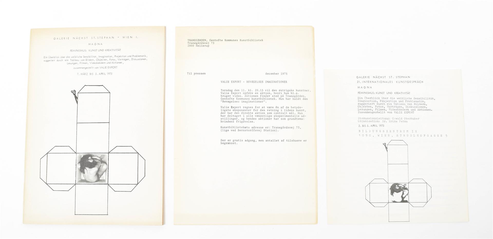 (2) Conference booklet, 23 x 21 cm, 4 pp. Features the four-day program for the 21st International Art Talk (2-5 April 1975), curated by Valie Export. It included discussion groups, lectures and film/video screenings by a wide range of artists and academics such as Gislind Nabakowski, Carolee Schneemann, Agnes Varda, Dr. Erika Runge, Elfriede Jelinek, Kirsten Justesen, Meret Oppenheim, Rose Richter and others. Both the catalogue and conference booklet are pivotal documents, in fine condition. (3) Added is an invitation sheet for a performance 'bevaegelses imaginationer' (Movement Imaginations) held by Valie Export on 11 Dec. 1975 at Tranegarden, Hellerup (Danmark), 29.5 x 21 cm. (total 3)
