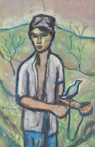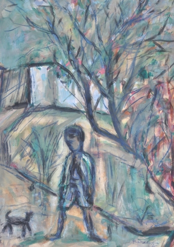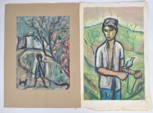 Boy with caught bird on arm, in landscape. 51x33,5 cm. 1966. Gouache with pastel and man with dog. 40x29 cm. 1965. Gouache with pastel. total 2