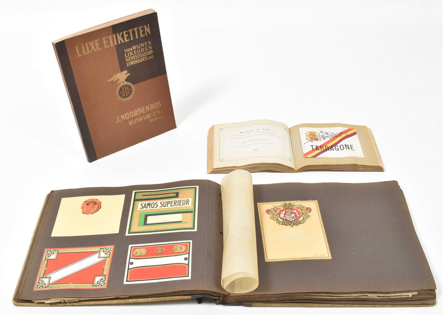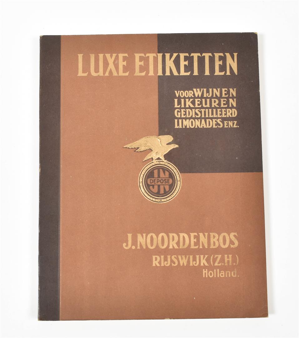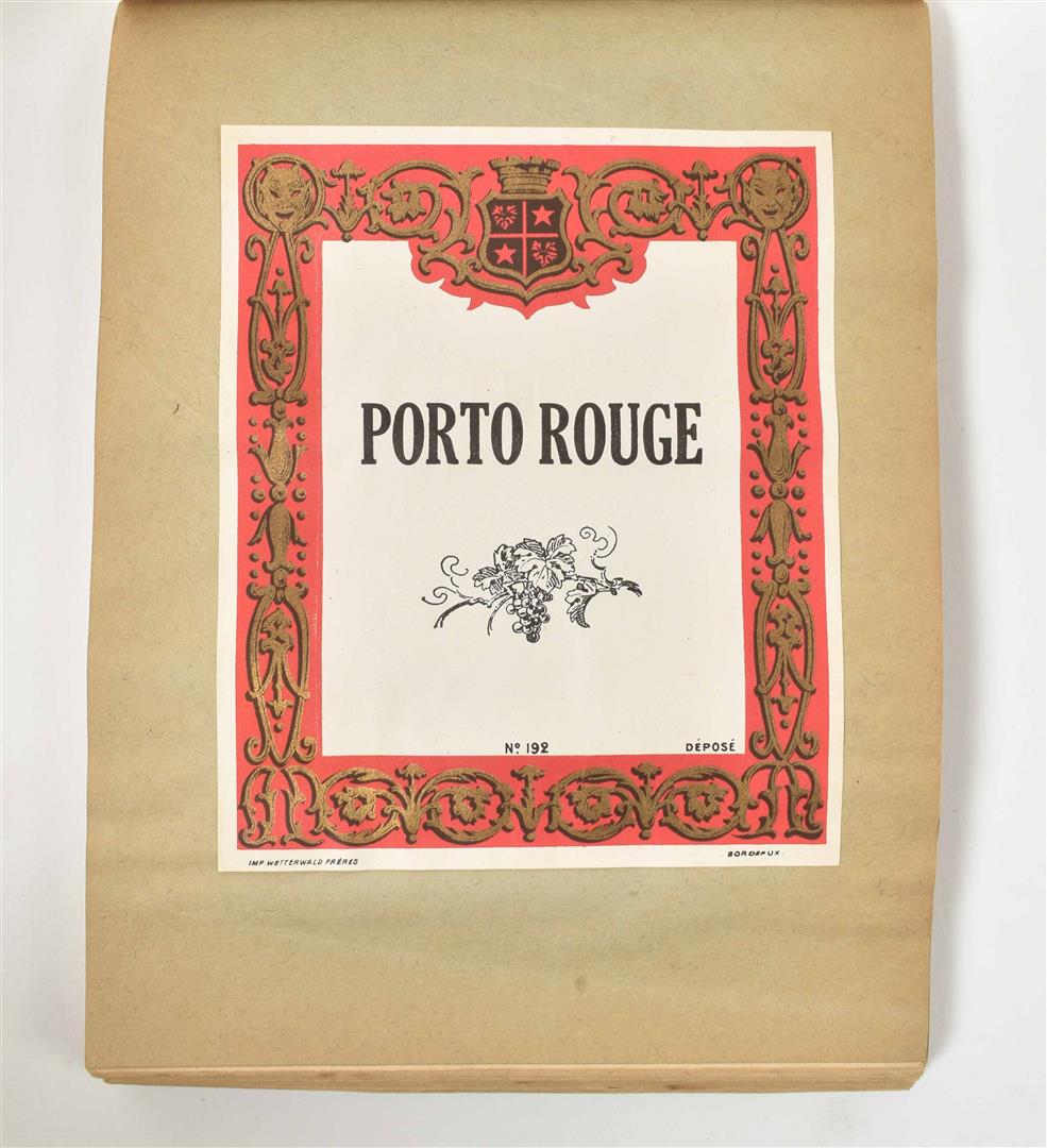 Rijswijk, J. Noordenbos, ca. 1930. 87 lvs w. num. col. labels. Orig. wr. 4to. Rare trade catalogue w. num. examples of label designs, some in art deco style, for alcoholic beverages. (2) Assortiment d'étiquettes. Modèles pour vins de liquer. Bordeaux, Wetterwald Frères, 1942. Approx. 75 col. labels. Orig. wr. w. protective paper wr. Obl. sm. 8vo. Rare trade catalogue w. num. examples of label designs for wines and wine liqueurs. Wrinkled. (3) Album of approx. 120 labels for alcoholic beverages, incl. for wine, champagne, cognac and port. Incl. blank example labels w. different variations on the designs (perhaps a salesman's album?). Album worn, but labels in good condition (labels glued to pages).