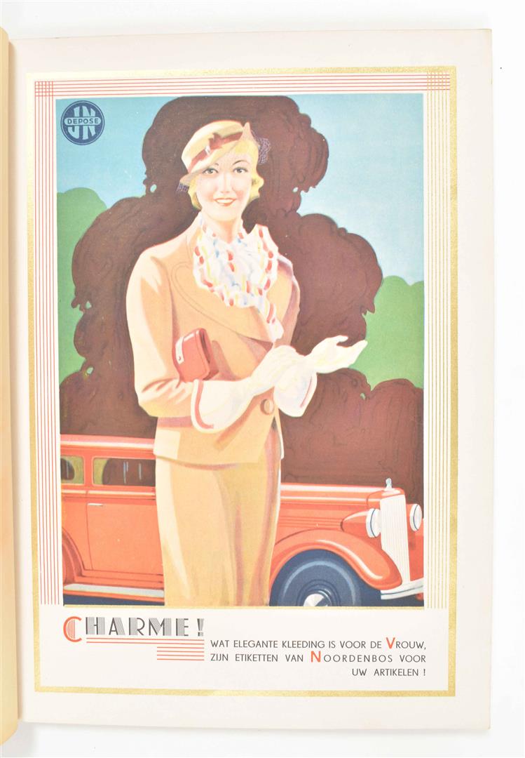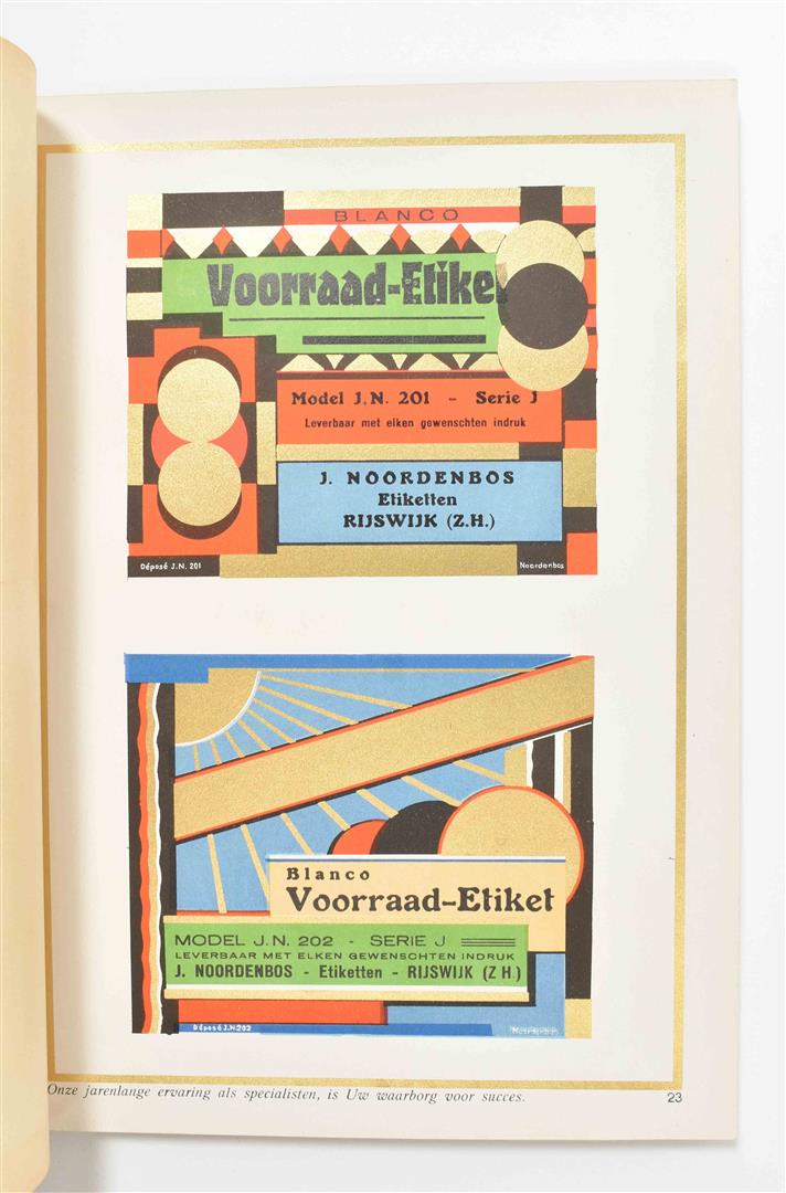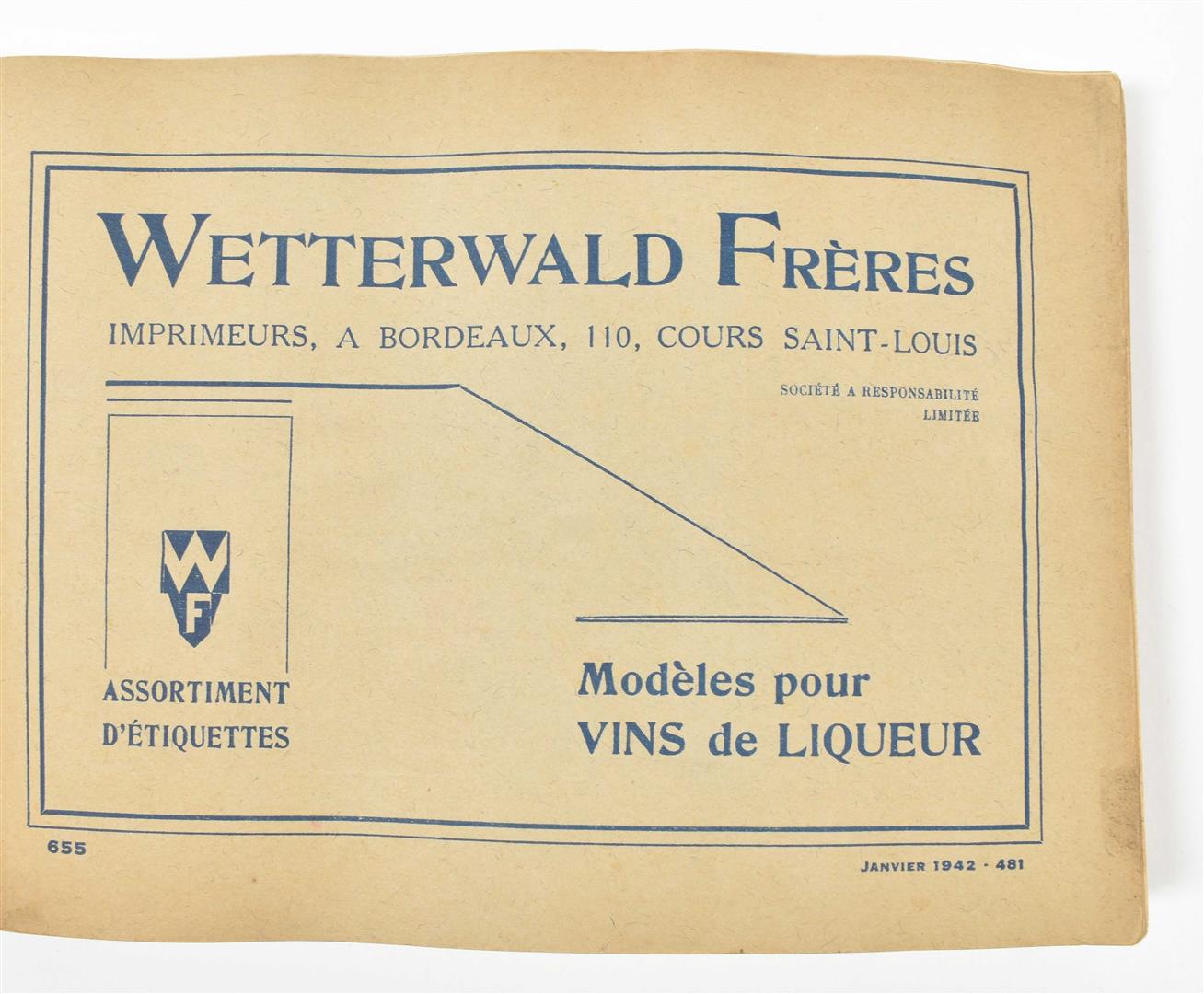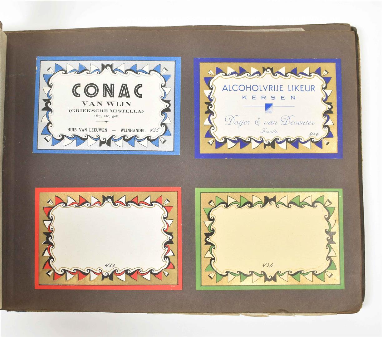 Rijswijk, J. Noordenbos, ca. 1930. 87 lvs w. num. col. labels. Orig. wr. 4to. Rare trade catalogue w. num. examples of label designs, some in art deco style, for alcoholic beverages. (2) Assortiment d'étiquettes. Modèles pour vins de liquer. Bordeaux, Wetterwald Frères, 1942. Approx. 75 col. labels. Orig. wr. w. protective paper wr. Obl. sm. 8vo. Rare trade catalogue w. num. examples of label designs for wines and wine liqueurs. Wrinkled. (3) Album of approx. 120 labels for alcoholic beverages, incl. for wine, champagne, cognac and port. Incl. blank example labels w. different variations on the designs (perhaps a salesman's album?). Album worn, but labels in good condition (labels glued to pages).