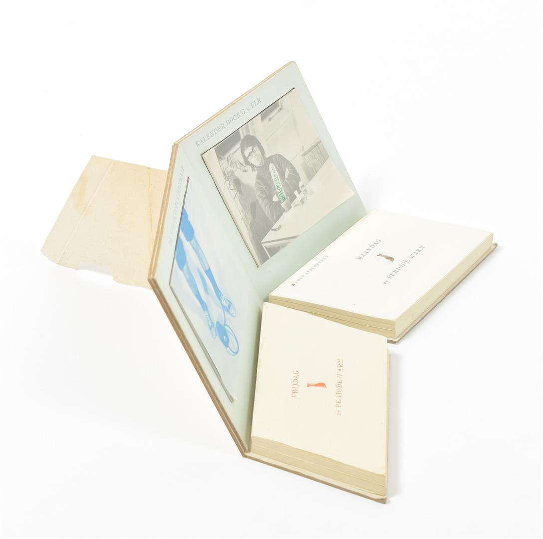 Deventer, Stichting Octopus, 1970. Block calendar in 2 parts with four flip-book style pads, containing 19 photographic plates on top part and text plates on bottom, all tipped on board. 19 x 24 cm. A fold-out cardboard holder on the rear allows the calendar to be displayed standing up. Includes original mailing envelope from Stichting Octopus.