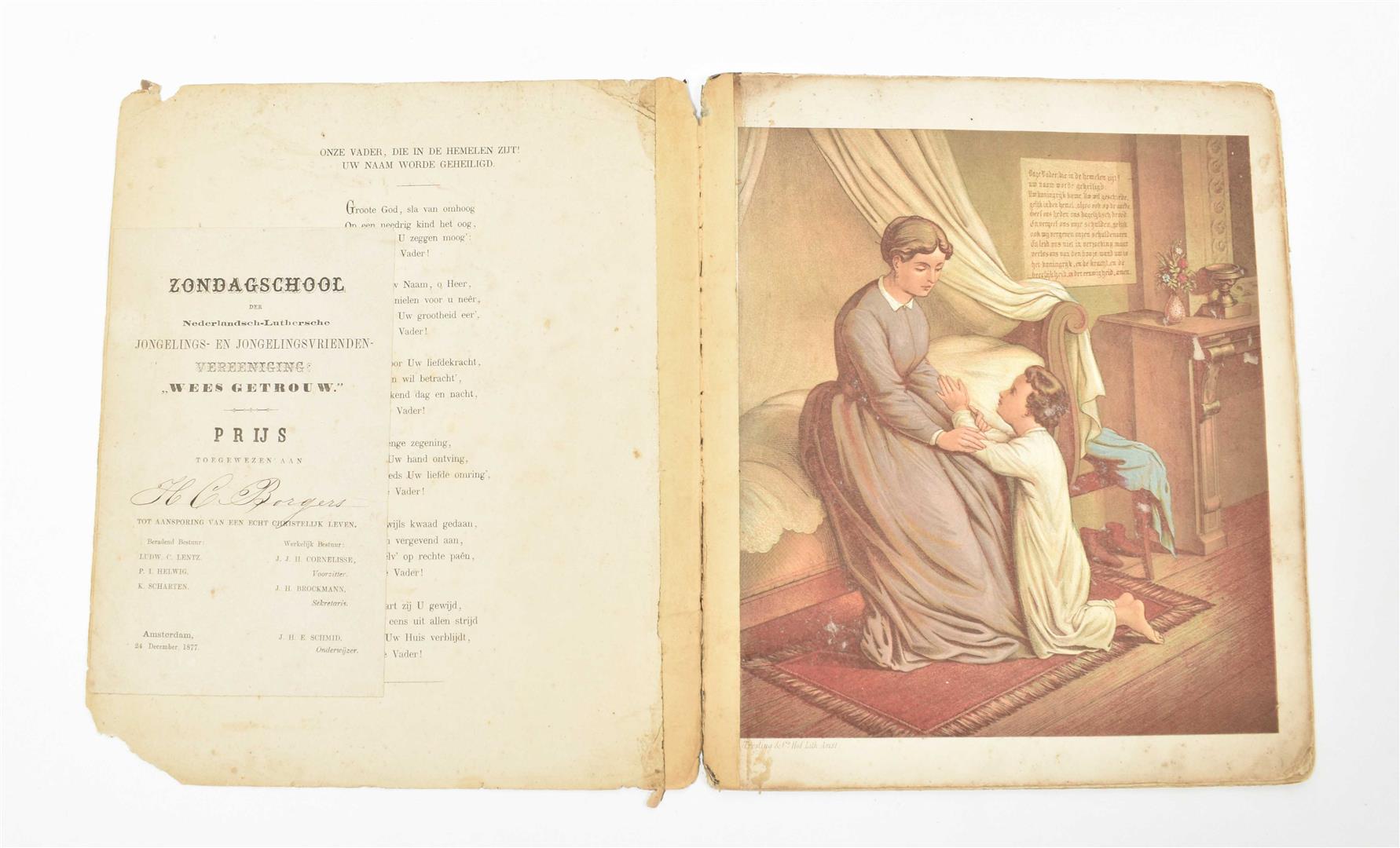 Amst., H.J.W. Becht, (1890). (2) Beata. De Kindertjes in het bosch. Utrecht, Lentz & de Haan, (1900). -and 1 more by the same, In en om den vijver. (3) Een aardig prentenboek. Schiedam, H.A.M. Roelants, (1899?). (4) Huet, P. Het onze vader. Utrecht, J.H van Peursem, ca. 1877. Sunday school prize copy. -and 7 others, incl. 2 publ. by J. Vlieger, De kleine generaal and Onze gevederde vrienden.
