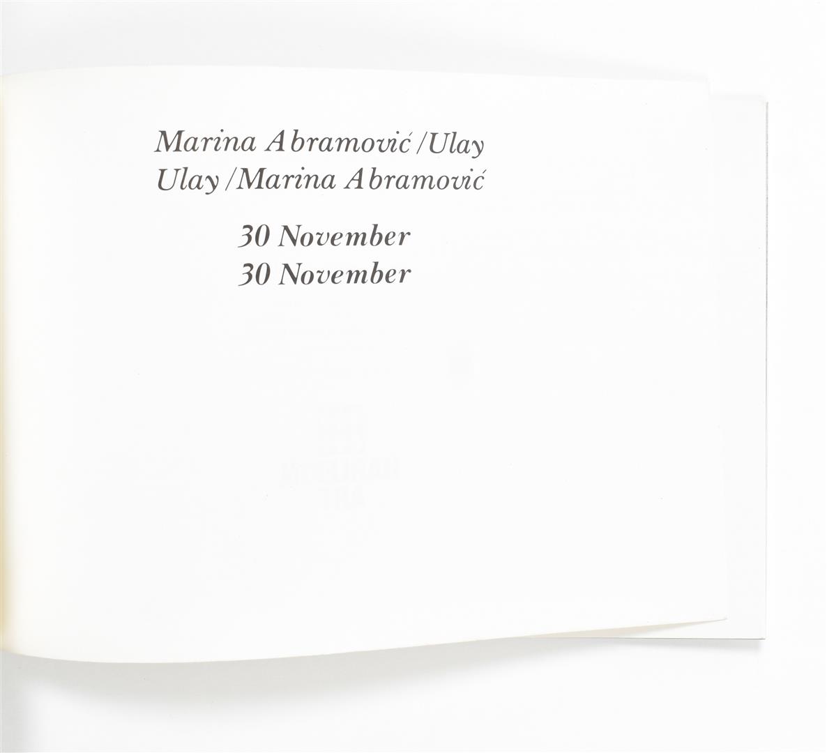 (1) 30 November. Wiesbaden, Harlekin Art, 1979. Rare artists' book with photo documentation of performance works by Abramovic and Ulay performed on their birthdays on November 30 1976, 1977 and 1978 in Amsterdam and Wiesbaden. Softcover, 15 x 22 cm, 48 pp., edition of 1000 copies. Texts in German and English.