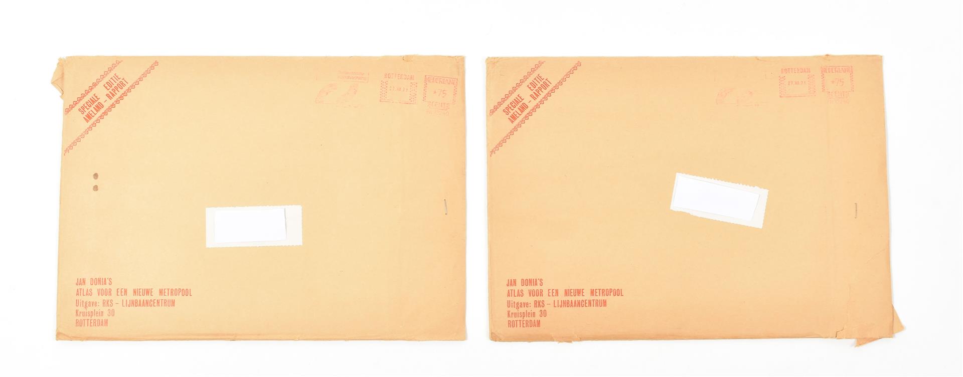 Features an assemblage of feathers, sand, tree-leaves, grass, fern, cracked eggs and a postcard, all collected during Van Golden's strolls on the island of Ameland in October and November 1971. Edition of 500, each copy unique. Produced for the magazine Atlas voor een Nieuwe Metropool, edited by Jan Donia. In the original sending envelopes. Scarce, both copies in very good state. (total 2)