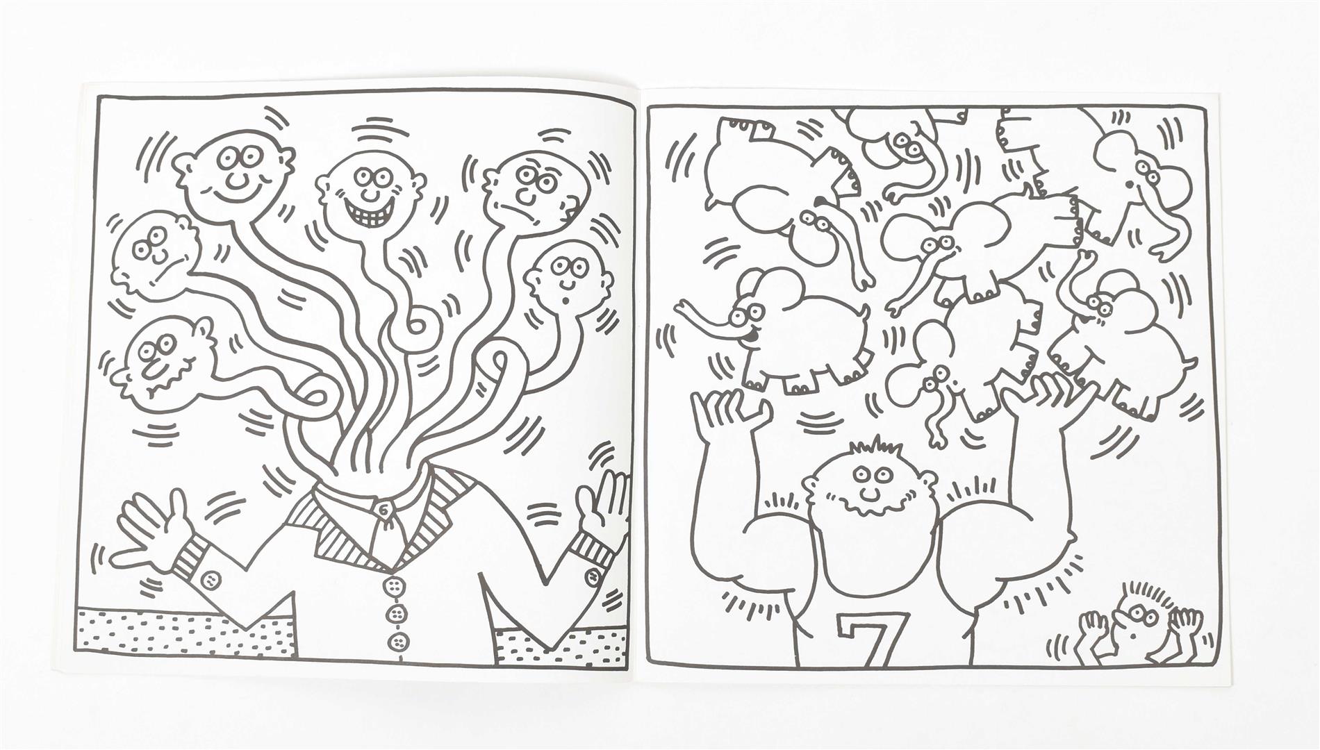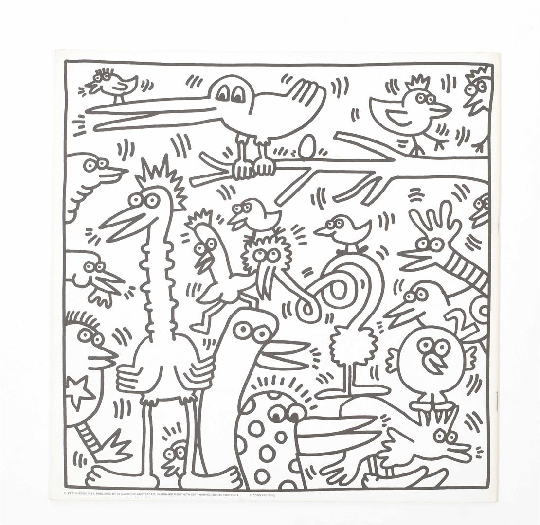 (2) Keith Haring, Coloring Book. Amsterdam, De Harmonie, 1986. Second printing. Staplebound, 30 x 30.5 cm, 20 pp. with full page b/w colouring plates. Published at the occasion of the Keith Haring exhibition in the Stedelijk Museum Amsterdam in 1986. The cover has been coloured in, not by Haring unfortunately, other sheets clean and bright. (total 2)