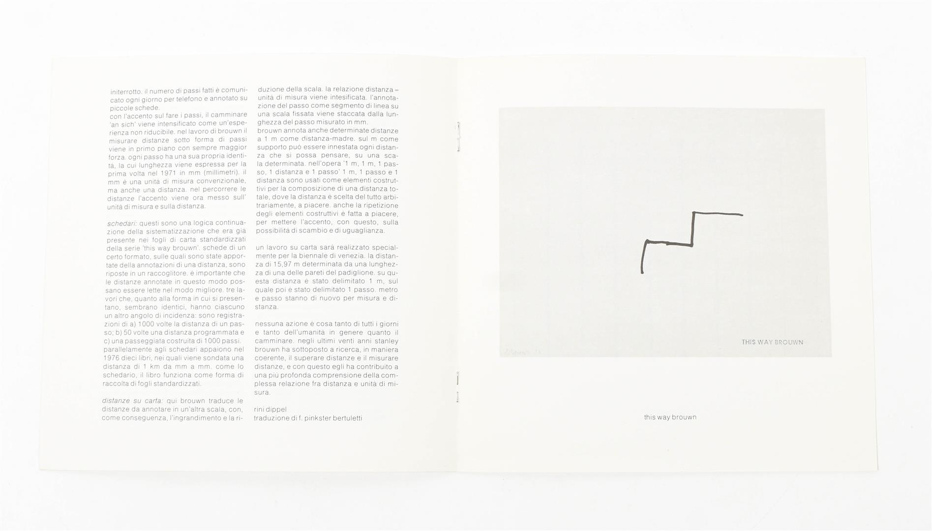 Amsterdam, Visual Arts Office for Abroad, 1982. Softcover, 27 x 21.5 cm, 32 pp. Catalogue published on the occasion of brouwn's exhibition at the Dutch pavilion at the Venice Biennale.