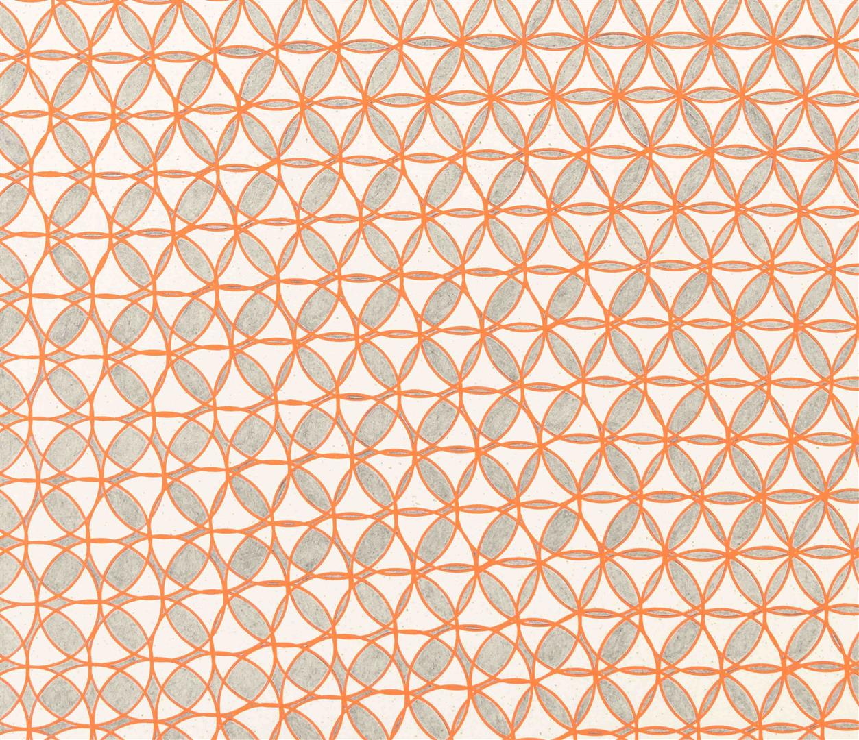 Printed in orange with hand added drawings in pencil. Curiously the work is printed on the back of a silkscreen by Robert Barry, with white printed lettering along the margins, almost invisible.
