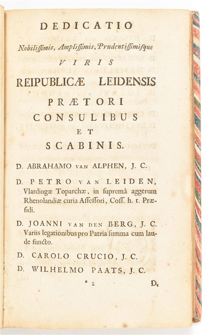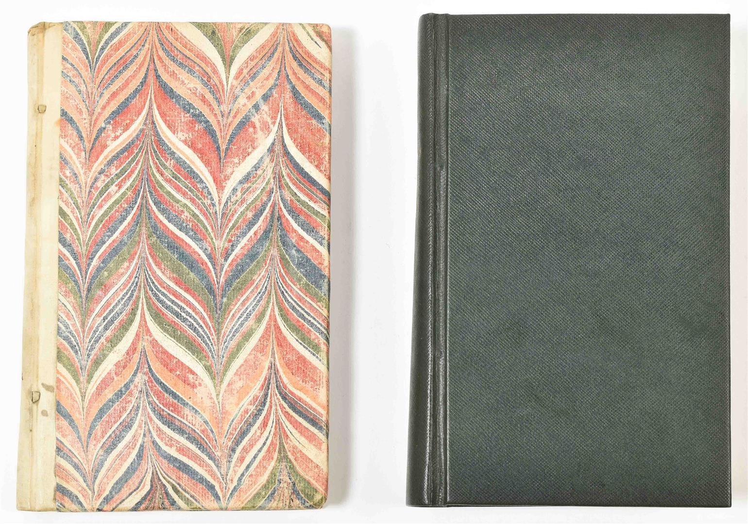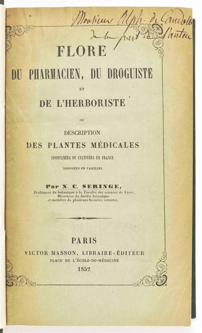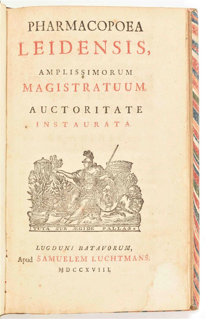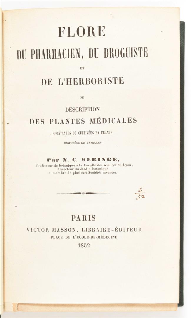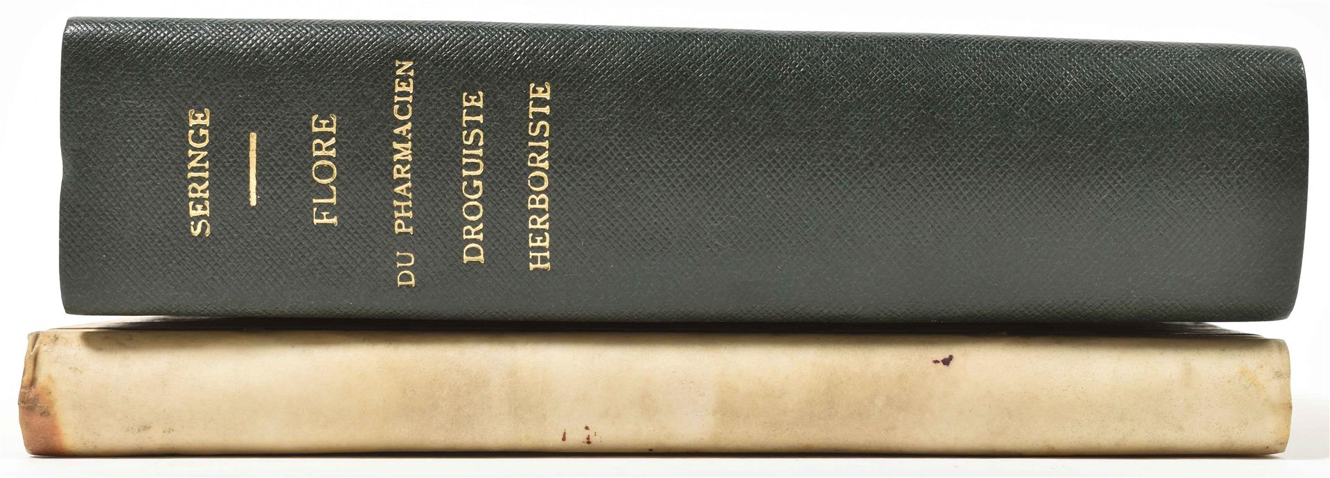 Amplissimorum Magistratuum Auctoritate Instaurata. Anonymous. Leiden, S. Luchtmans, 1718. (18),155,(17) p. (some printer's errors in pagination, but complete). Title-p. vignette. Hcalf w. marbled paper boards. 8vo. A few notes upper and lower pastedowns/ flylvs browned. (2) Seringe, N.C. Flore du pharmacien, du droguiste et de l'herboriste ou description des plantes médicales (...). Paris, V. Masson, 1852. Some in-text ill. and 2 fold. tables. Later cl., gilt title on spine, orig. wr. preserved. 8vo.