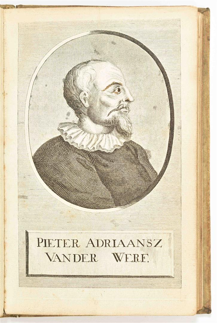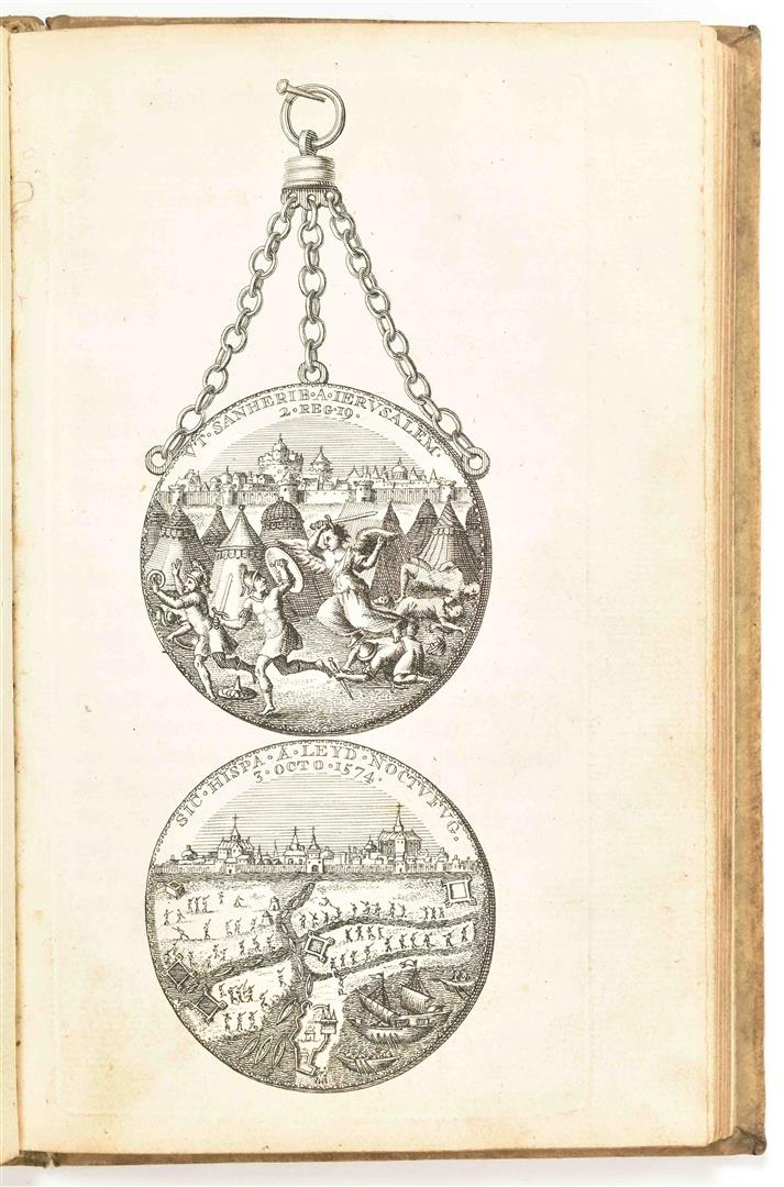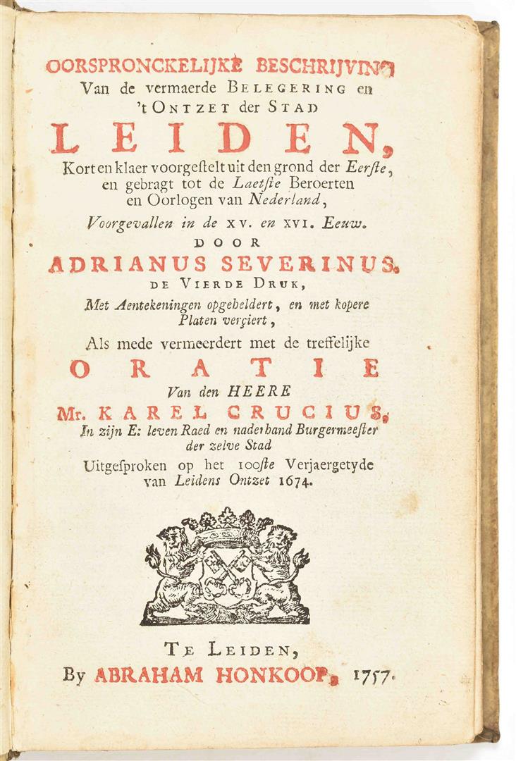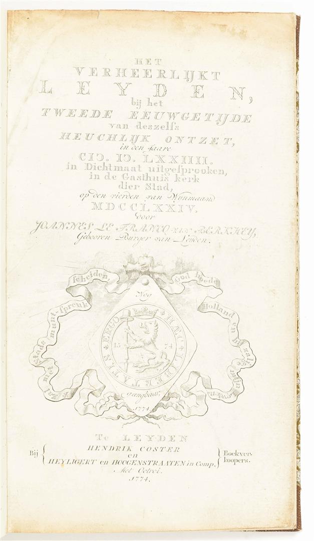 de vermaerde belegering en 't ontzet der stad Leiden (...). Leiden, A. Honkoop, 1757. (12),210 p. 3 engr. portraits and 4 engr. plates., cont. vellum w. gilt floral dec., 8vo. Binding sl. soiled, some sm. stains from use. (2) Francq van Berkhey, J. le. Het verheerlykt Leyden, bij het tweede eeuwgetijde van deszelfs heuchlijk ontzet in den jaare MDLXXIIII. Leiden, 1774. W. engr. title-p., 1 dedicatory engr. & 2 engr. portraits. Later hcl. Title-p. sl. stained. (3) Vreugdezang op het tweede eeuwfeest van Leydens verlossing. Amst., A. Fokke Simonsz., 1774. (4),31 p., engr. title-p., later hleather. -and 3 others (1 rather worn).