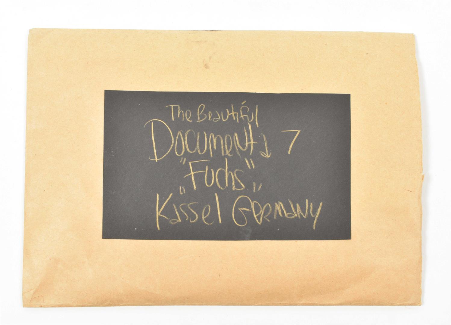 Cardboard envelope, 28 x 20 cm, with mounted black card addressed in gold handwriting to 'The Beautiful Documenta 7 'Fuchs' Kassel Germany'. Verso reads 'Werner, 25 Gertrudenstr. 5 Köln Germany' (the address of Michael Werner gallery).