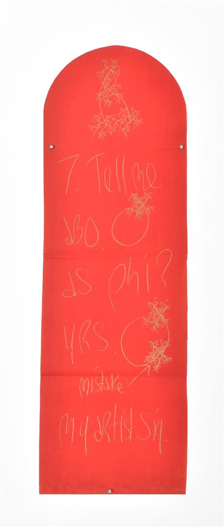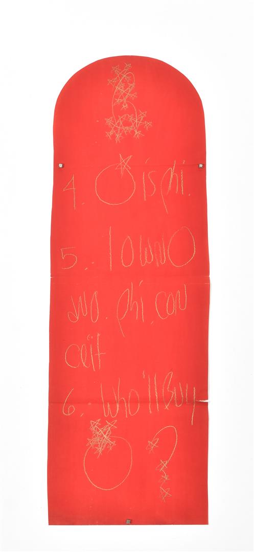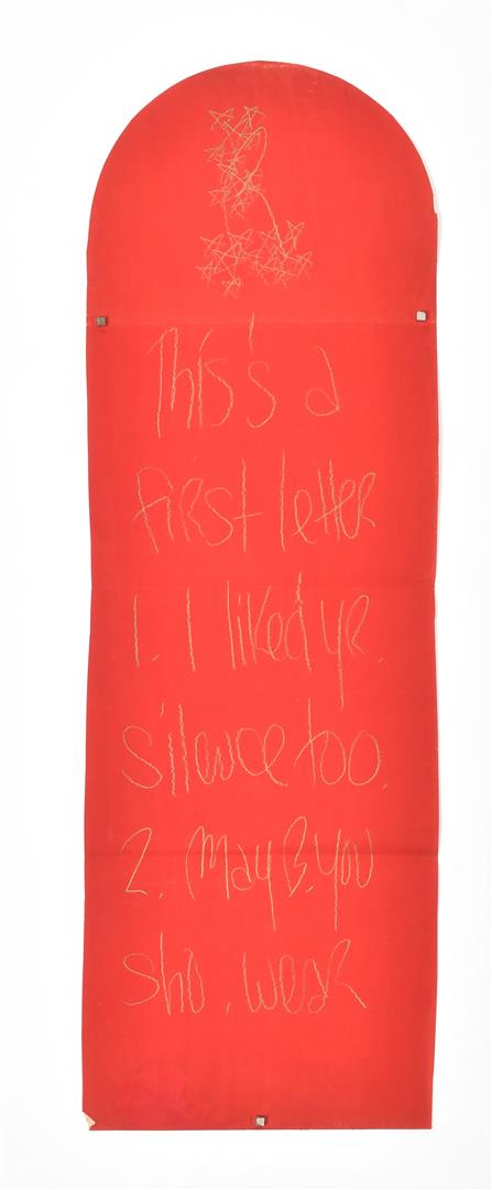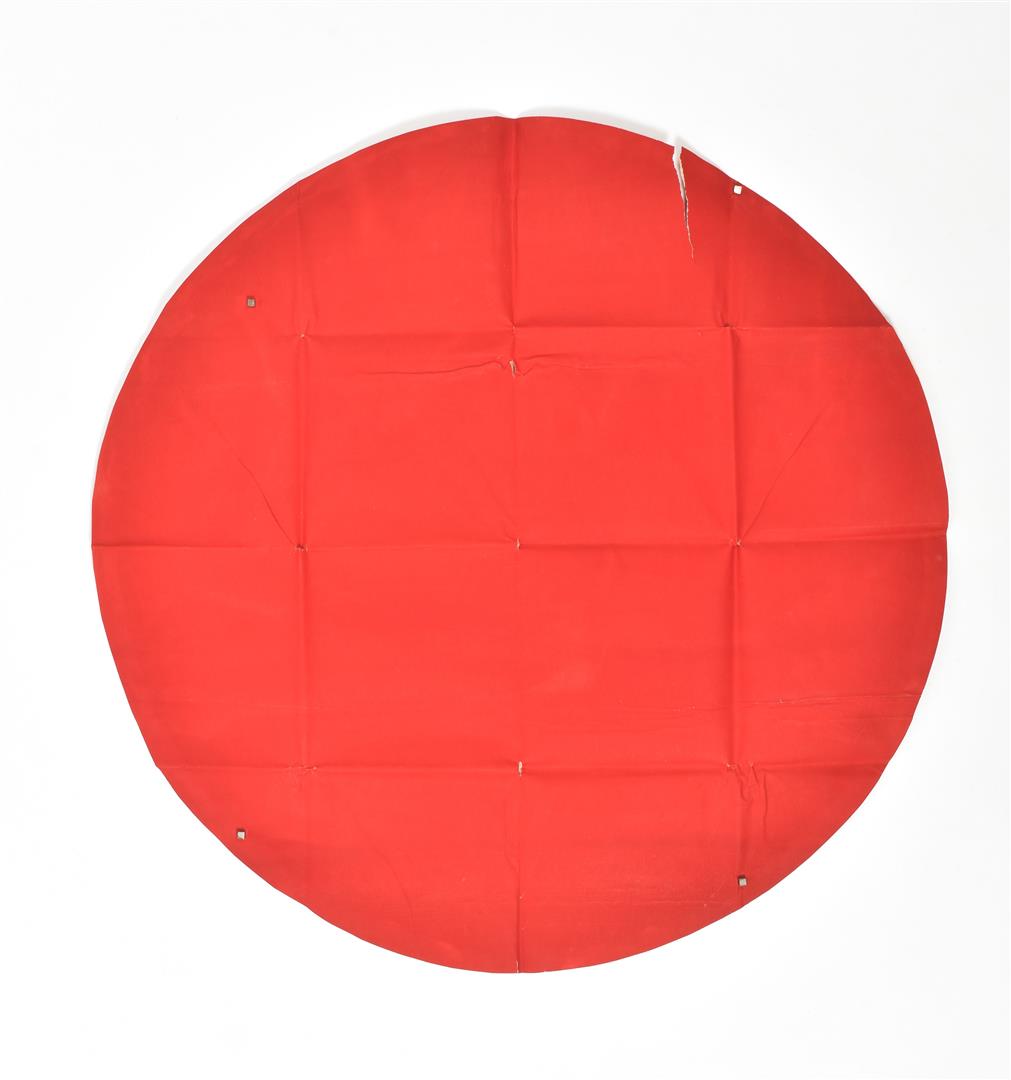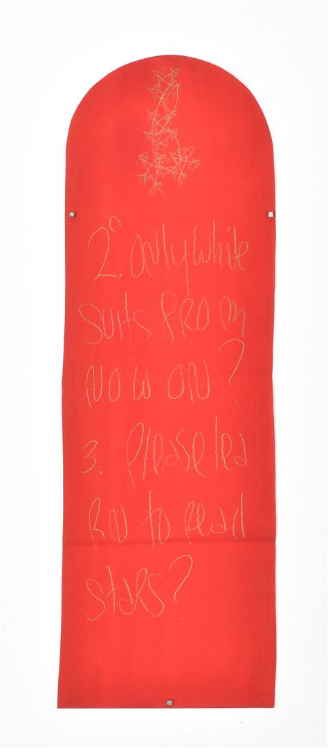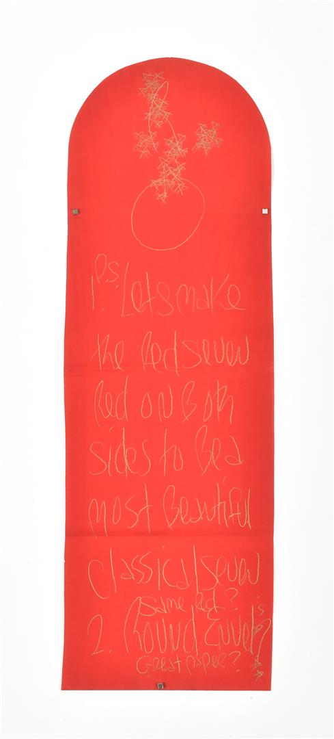 Contains 4 red painted sheets with rounded top, 62 x 21 cm, folded in four, featuring handwritten text and drawings in gold. The text is difficult to decipher but partly reads 'only white suits from now on?' and 'Lets make the red show red on both sides to be d most bewtiful classical show. same red? (..) great paper ?'. Also includes a folded circle of thick paper, 59 cm in diameter, painted red both sides (tear along 1 side and wear along folds). Without detectable writing, possibly a colour/paper sample for the project mentioned in the letter. Splendid item deriving from the collection of Rudi Fuchs, Amsterdam.