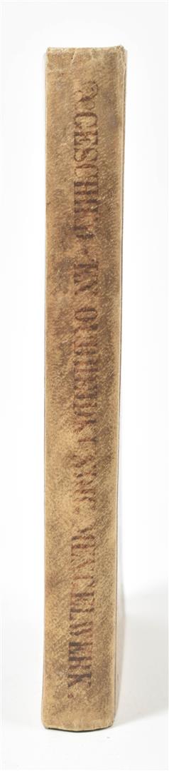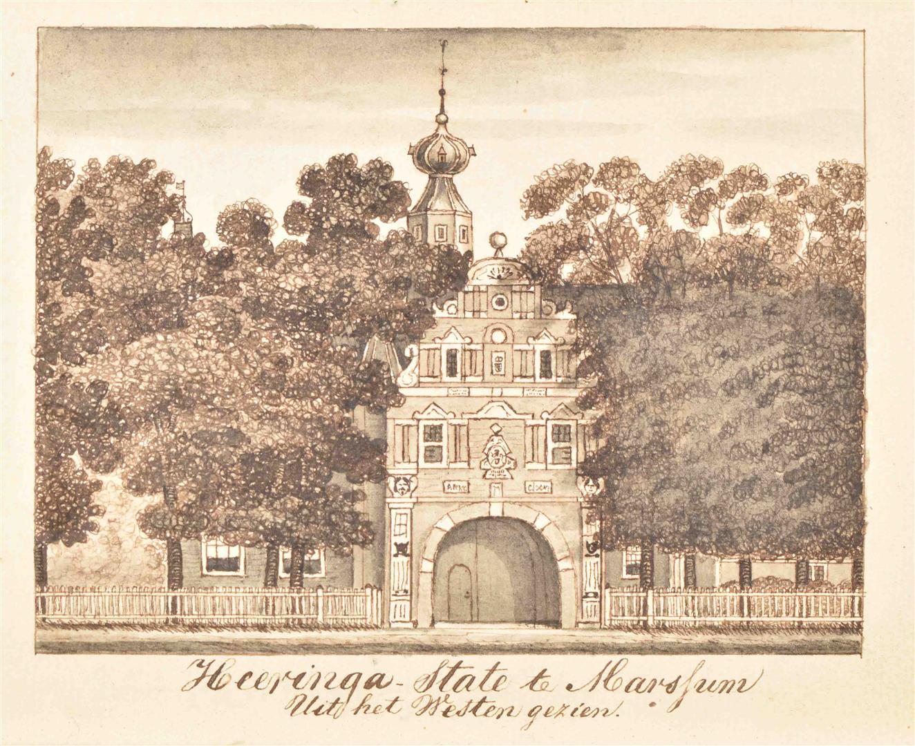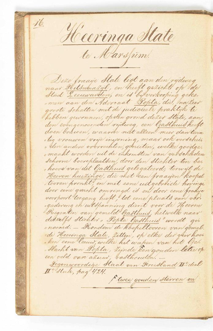 bijeenverzameld door J.IJ. Wenning. 1868. Handwritten, hand ill. and hand col. work on the history of var. Dutch châteaux, a second part entitled "Algemeene Geschiedenis van Friesland door H.W. Steenstra". Incl. a hand drawn and col. fold. frontisp. and title-p. and 4 hand drawn ills. of Dutch châteaux (some blank spaces for other drawings); the handwriting is clear and legible. Bound as a bookblock in contemp. vellum w. many blank sheets. Sm. 8vo.