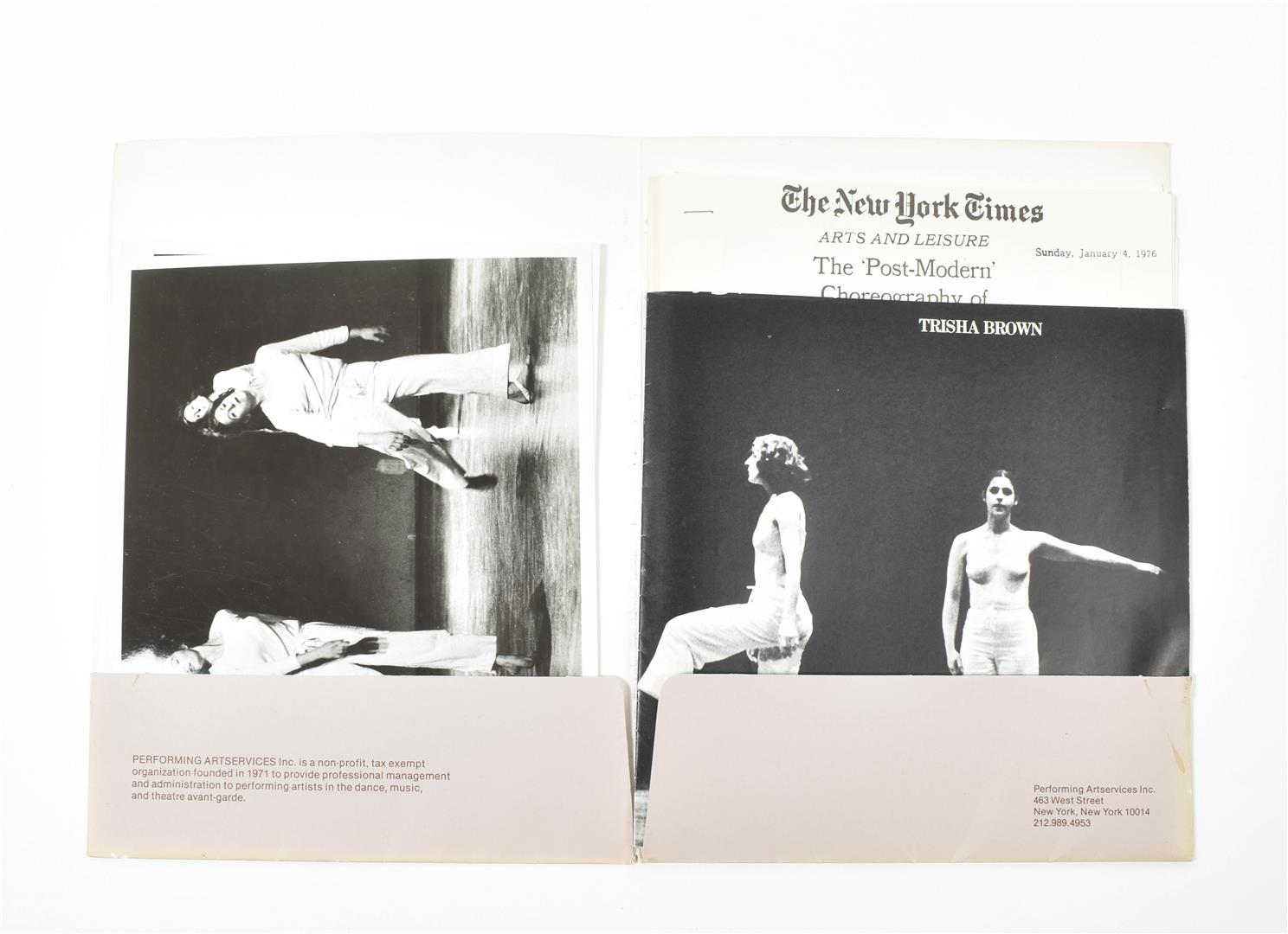 Original paper portfolio issued by Performance Artservices New York, containing a promotional brochure, a booklet, press clippings and three original b/w photographs.