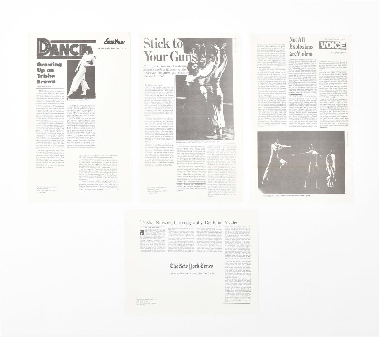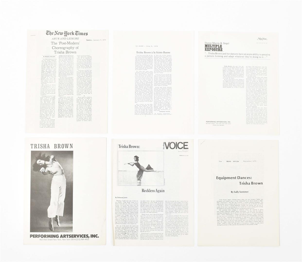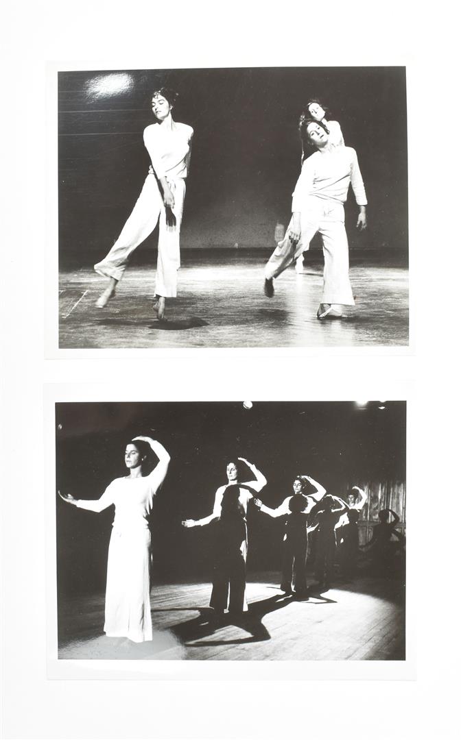 Includes a famous photograph by Babette Mangold featuring the performance 'Roof Piece 1973', and two images from 'Line Up' photographed by Lois Greenfield and Christiane Robin in 1976. Exquisite set.