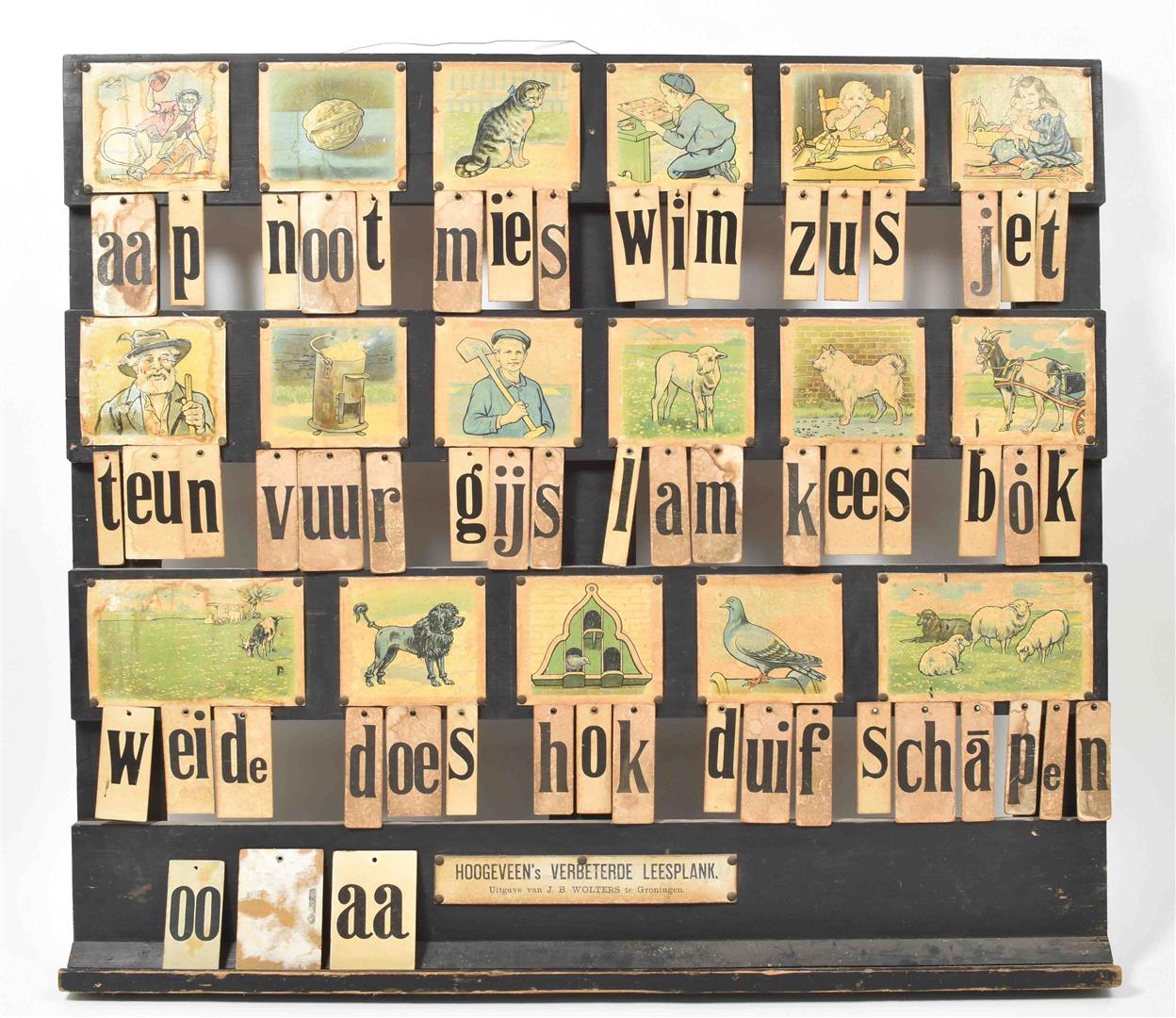 J.B. Wolters, Groningen, ca. 1935. Large size reading shelf for teachers to use in the classroom, consisting of a wooden frame (93 x 105 cm), pinned images and 53 letters on cardboard. Letters and images sl. worn, foxed and waterst. as is often the case.